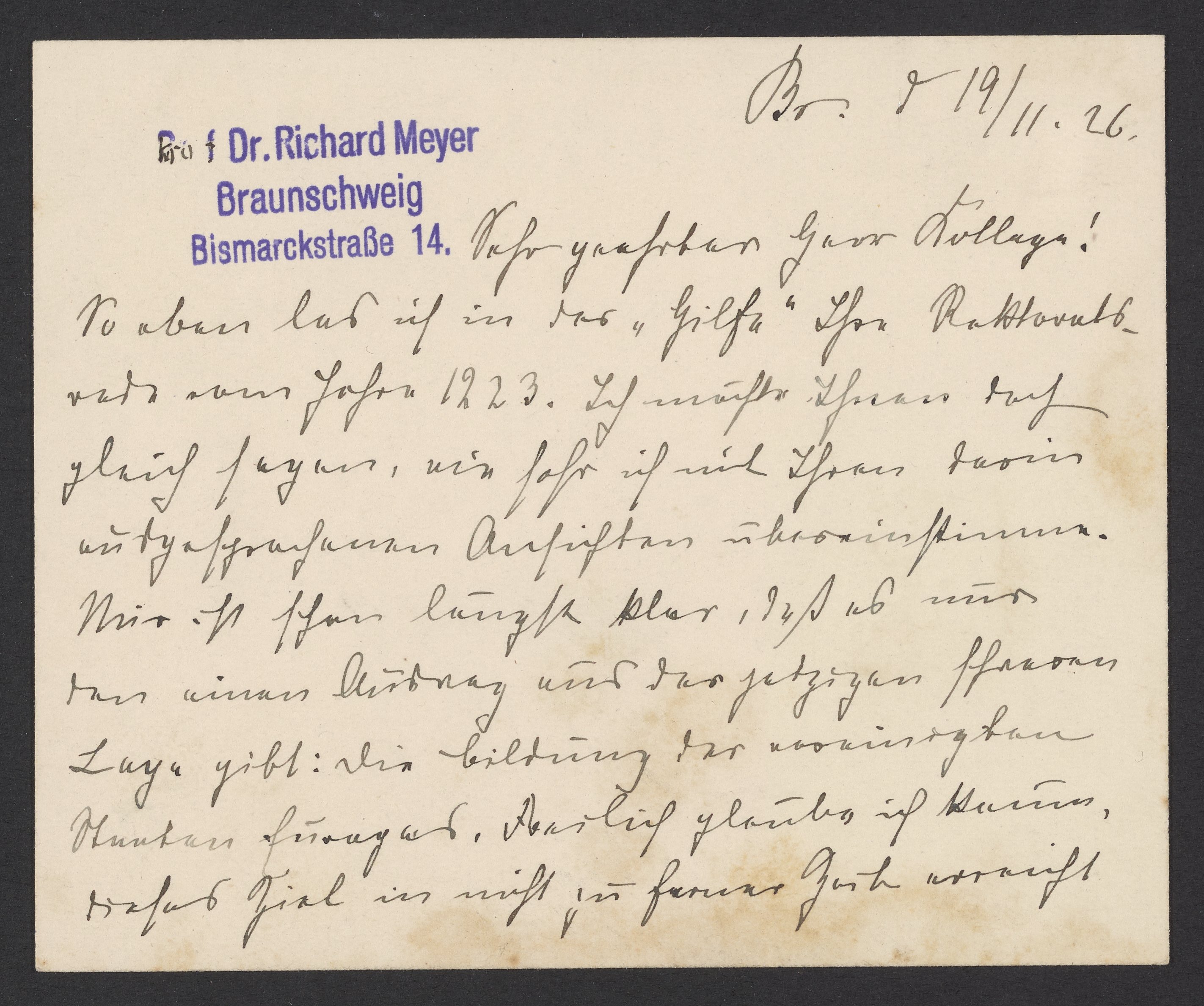 Meyer, Richard Emil. “Letter from Richard Meyer to Georg Bredig,” November 26, 1926. Papers of Georg and Max Bredig, Box 2, Folder 20. Science History Institute. Philadelphia. https://digital.sciencehistory.org/works/1tngxw2.