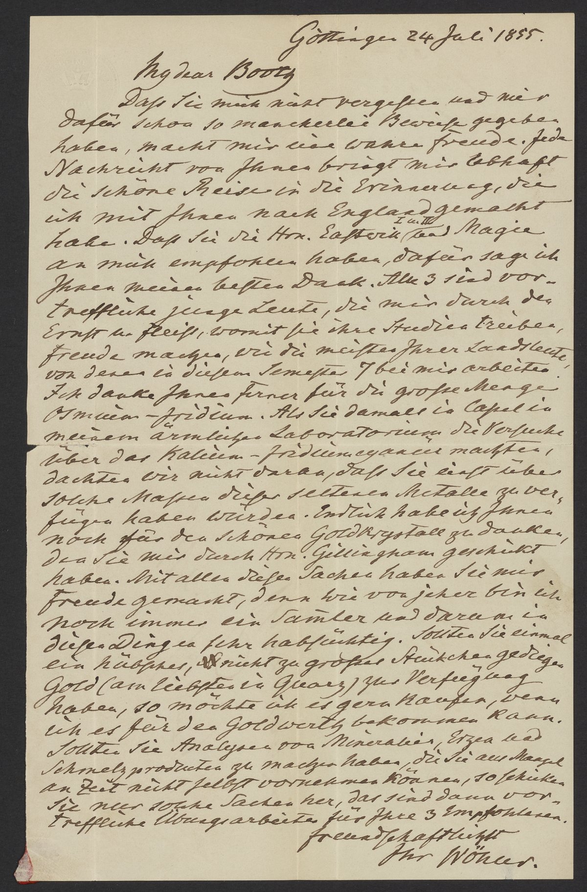 Letter from Friedrich Wöhler to James Curtis Booth, July 24, 1855