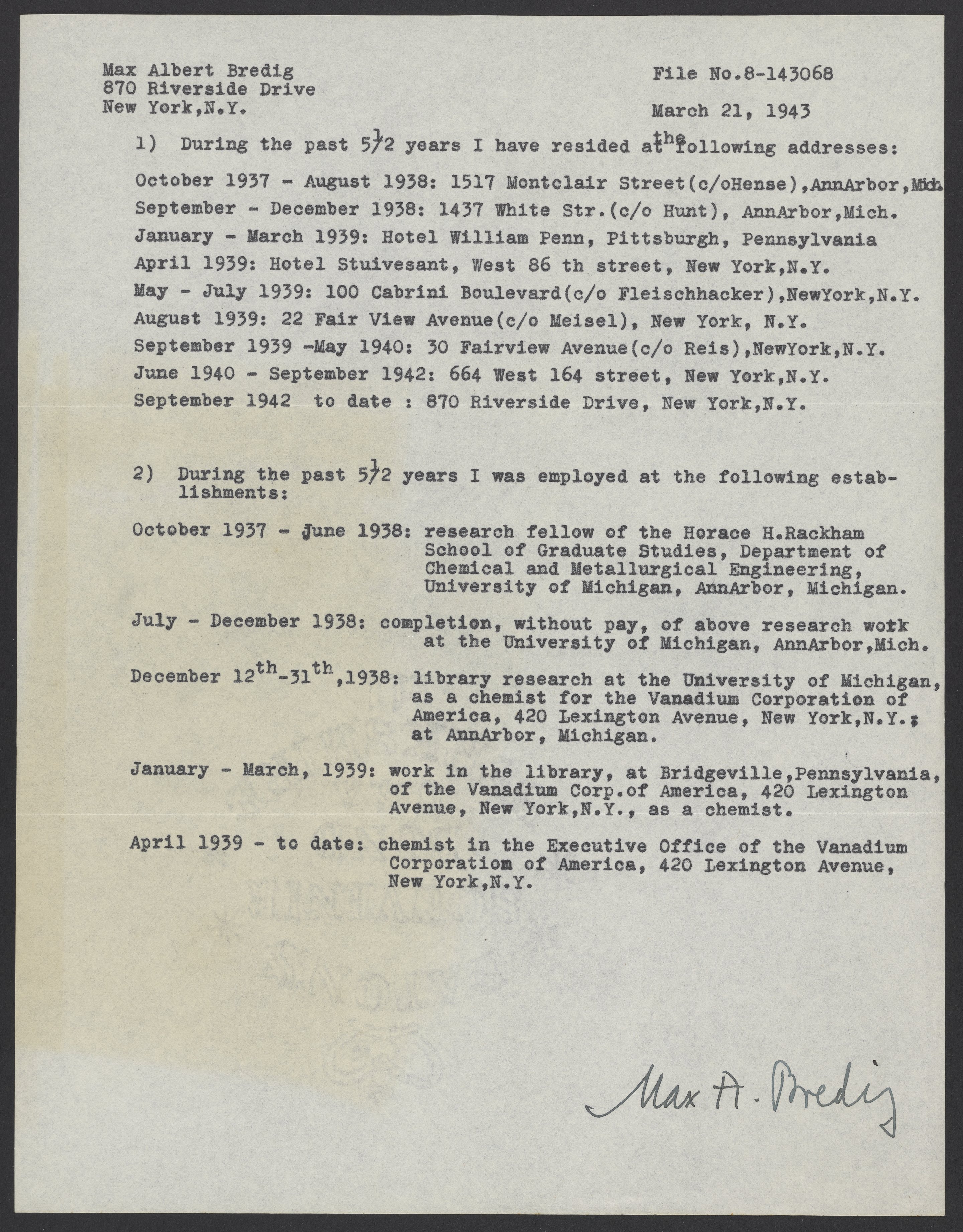 Addresses and employment information of Max Albert Bredig (1902-1977) as of March 21, 1943. This information was used for Bredig's U.S. citizenship application.
