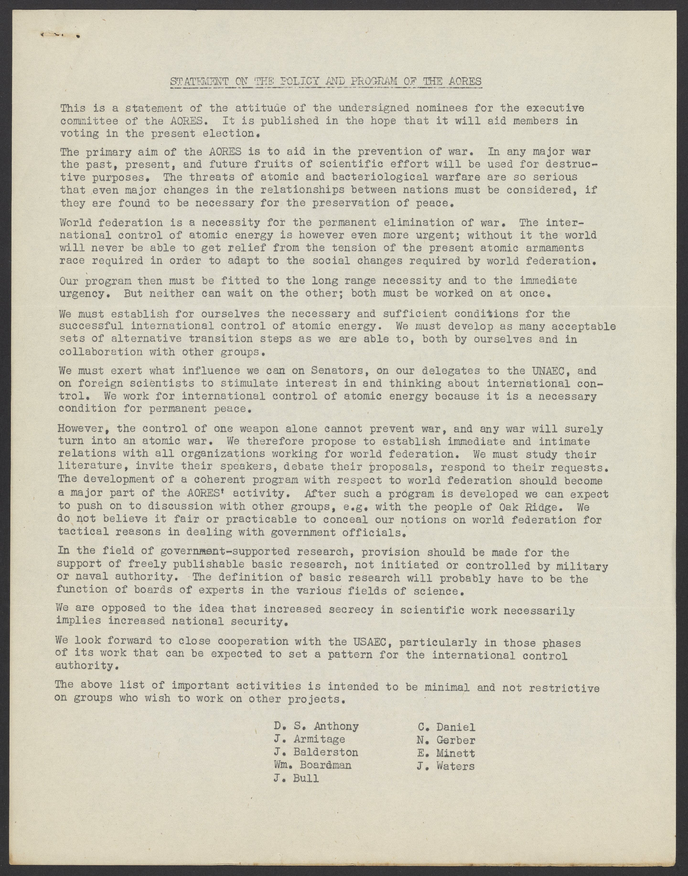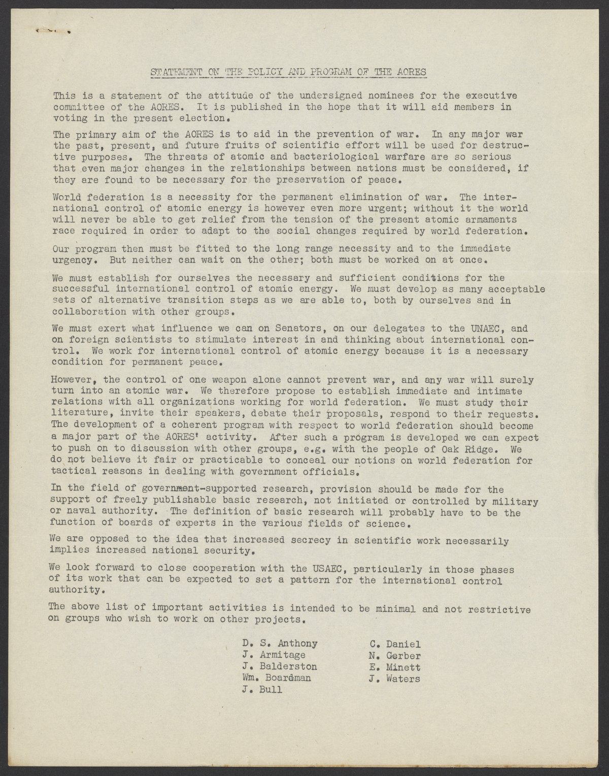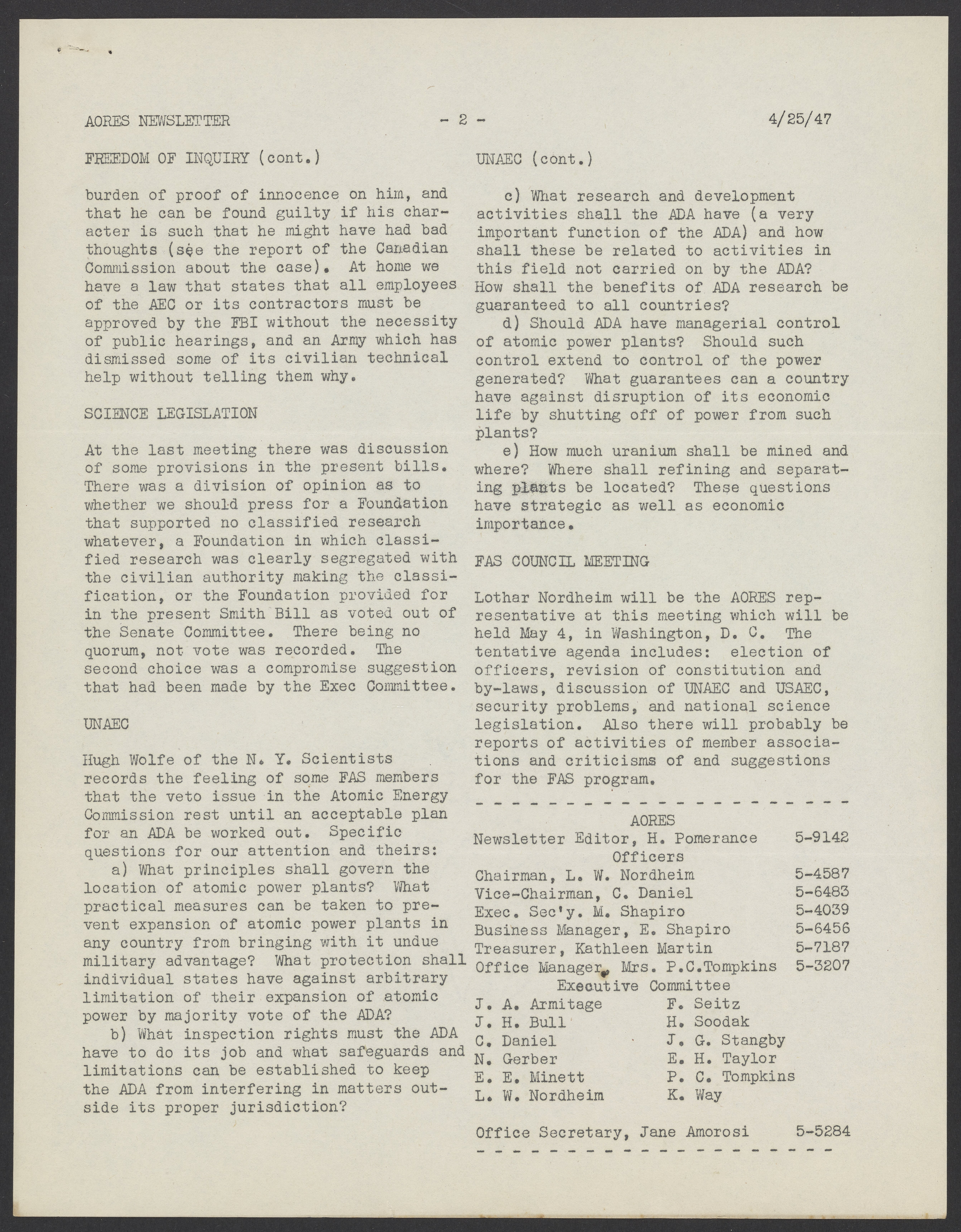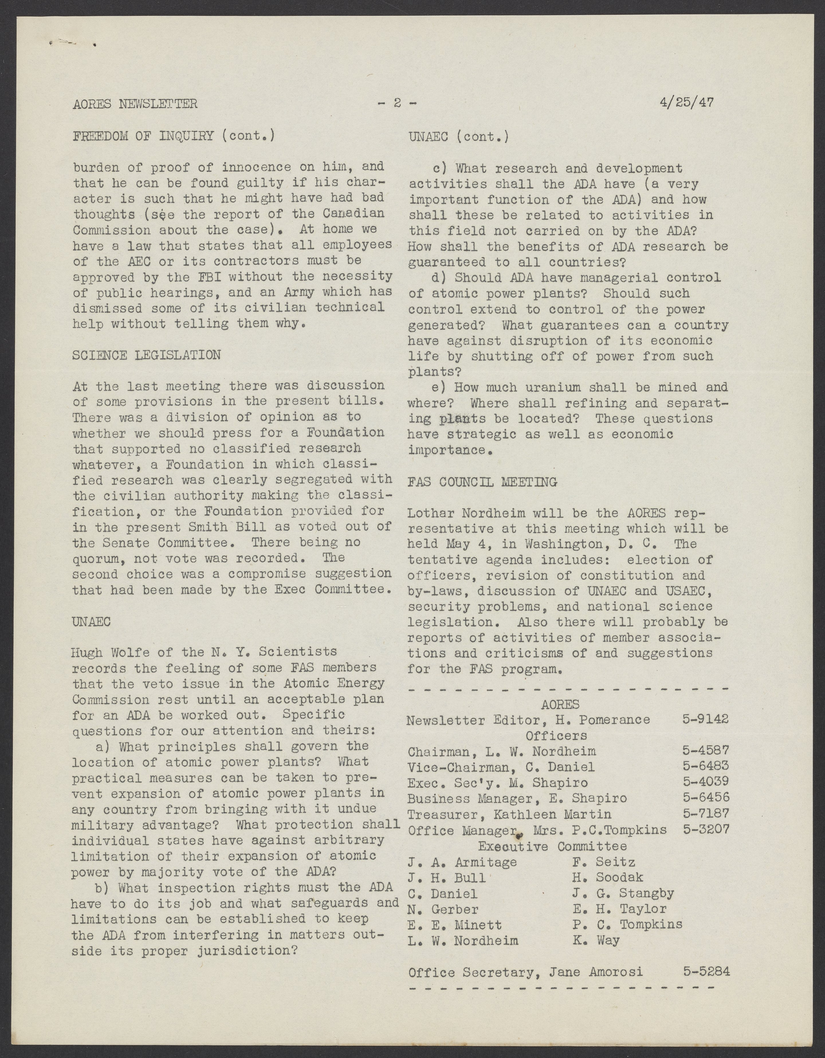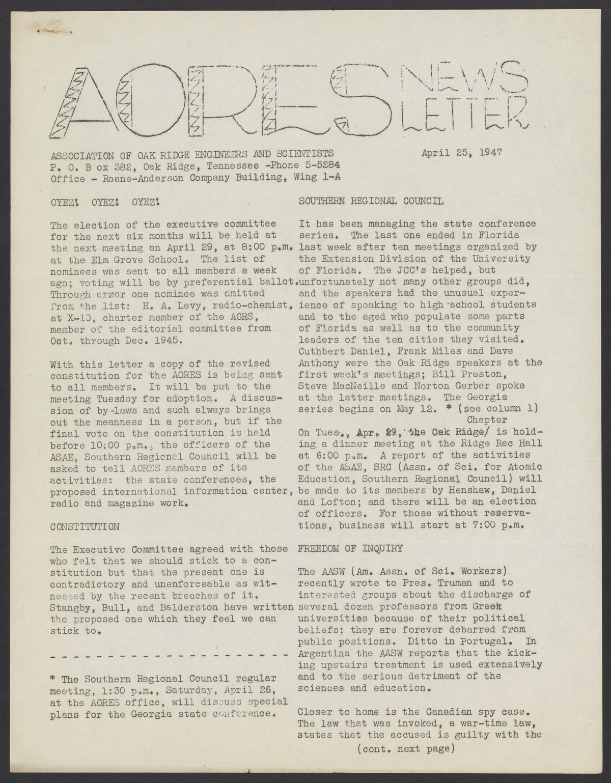 Newsletter for the Association of Oak Ridge Engineers and Scientists (AORES), April 25, 1947