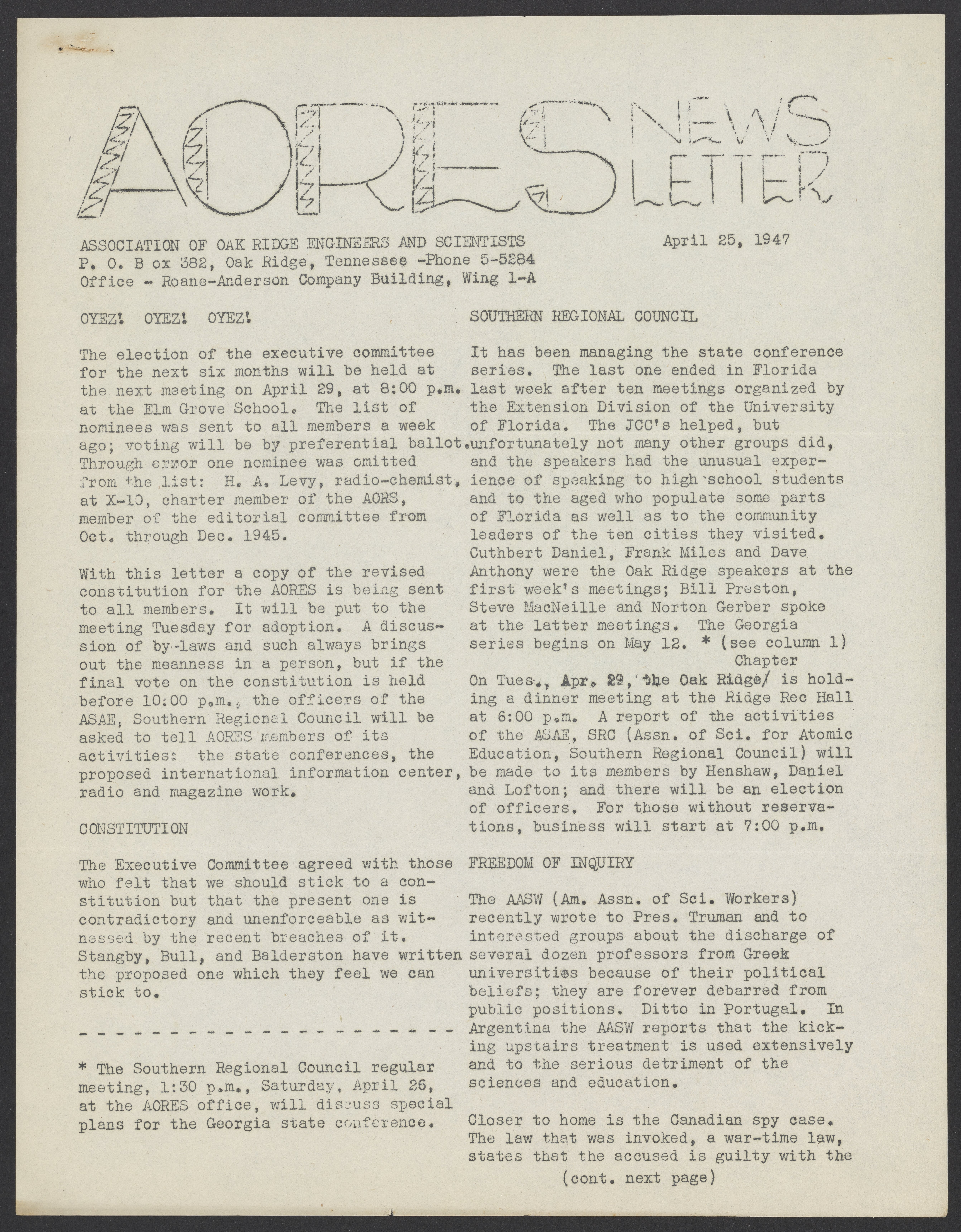 Association of Oak Ridge Engineers and Scientists. “Newsletter for the Association of Oak Ridge Engineers and Scientists (AORES), April 25, 1947,” April 25, 1947. Papers of Georg and Max Bredig, Box 10, Folder 3. Science History Institute. Philadelphia. https://digital.sciencehistory.org/works/1xcypww.