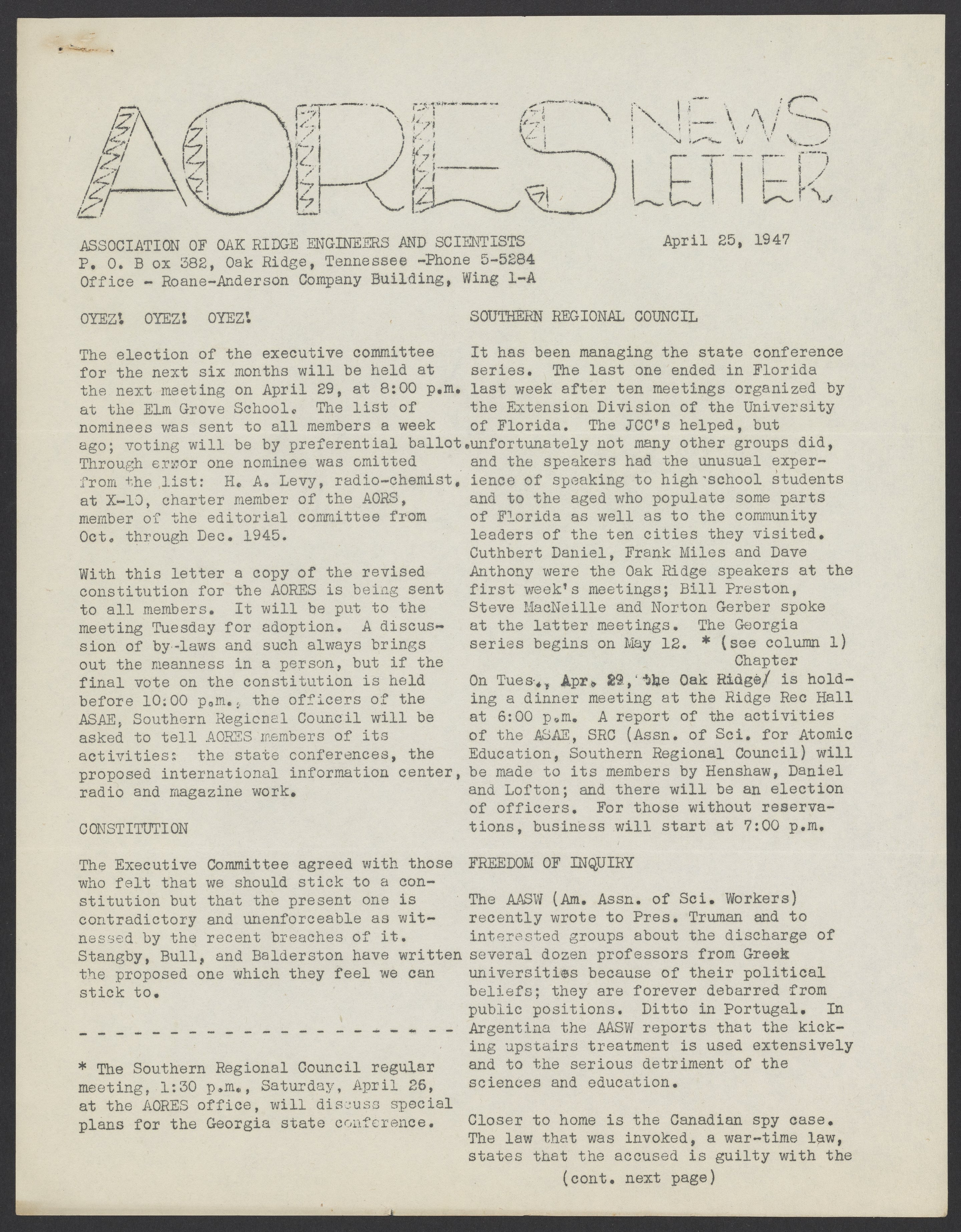 Newsletter for the Association of Oak Ridge Engineers and Scientists (AORES), printed April 25, 1947. AORES was formed in 1946 through a merger between the Atomic Engineers of Oak Ridge and Atomic Production Scientists of Oak Ridge.