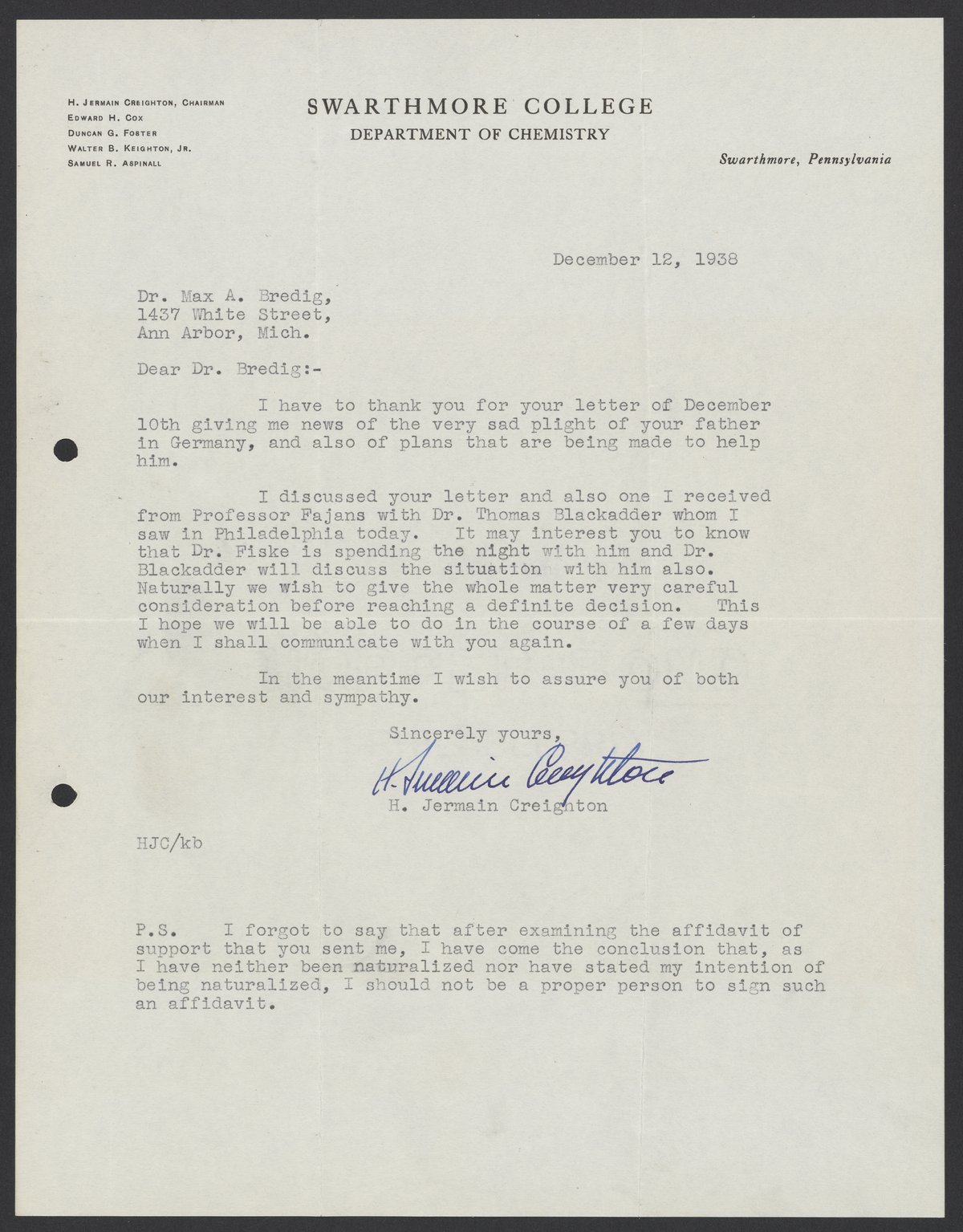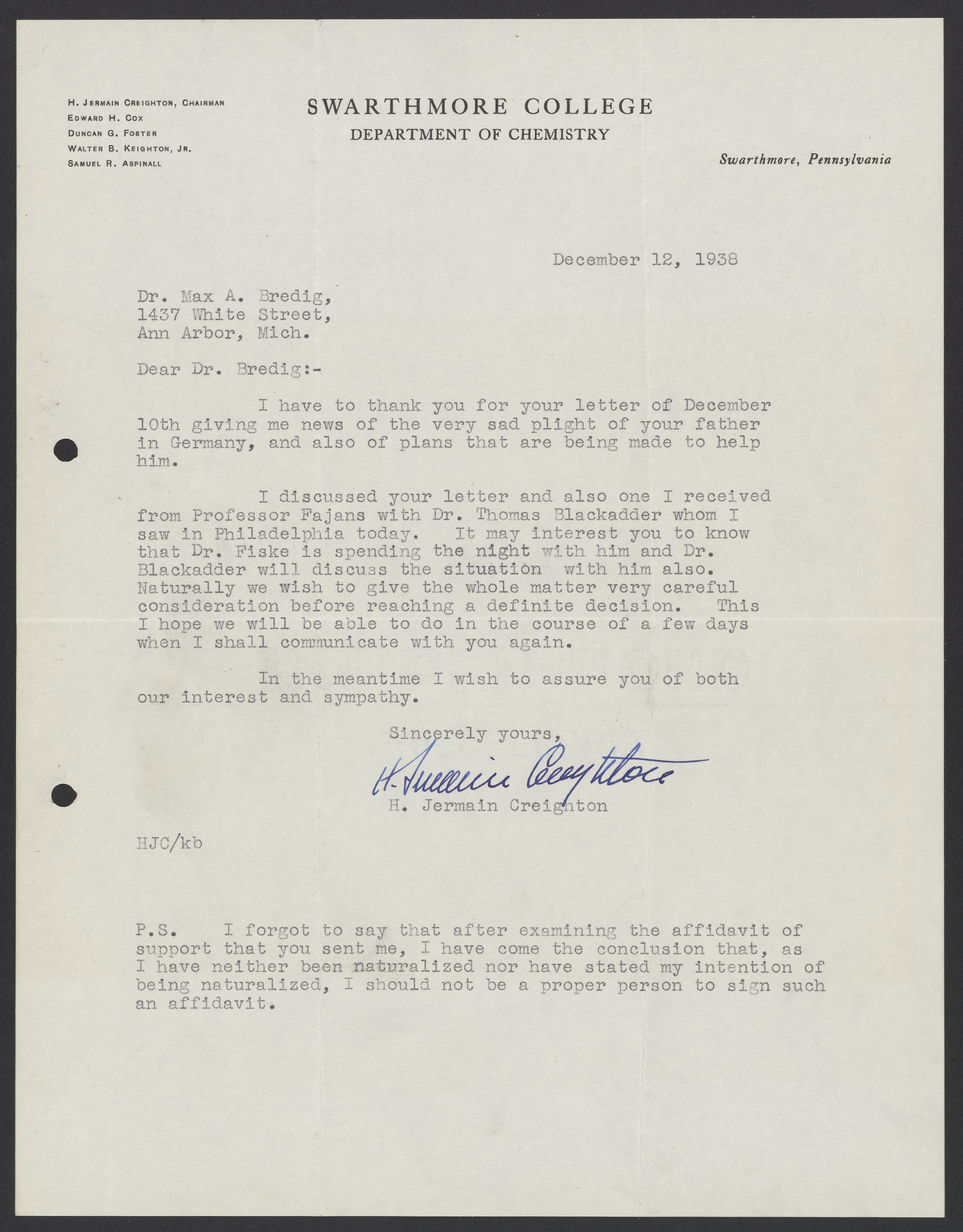 H. Jermain Creighton, a chemistry professor at Swarthmore College, writes to Max Bredig (1902-1977) with concern for his father, Georg Bredig (1868-1944). Creighton and his colleagues who studied with Georg discussed ways to help Georg immigrate from Germany under worsening conditions for Jewish people during the Third Reich.