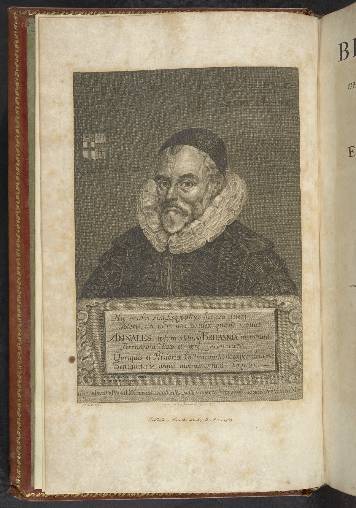 Basire, James. “Portrait of William Camden (1551-1623).” In Britannia: or, a Chorographical Description of the Flourishing Kingdoms of England, Scotland, and Ireland, and the Islands Adjacent, Vol. 1. London, England: John Stockdale, 1789–1806. https://digital.sciencehistory.org/works/20xz6c6.