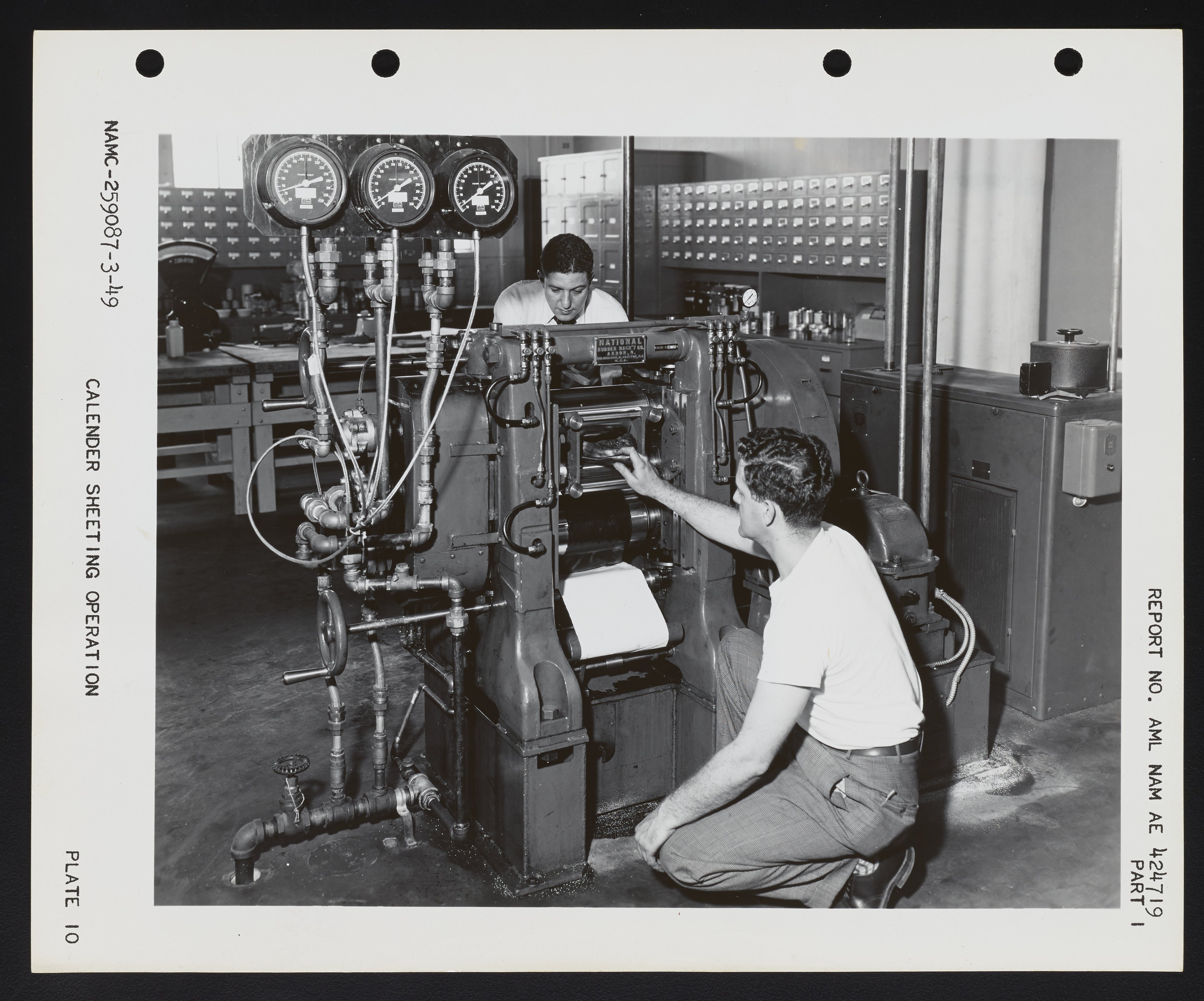 Naval Air Experimental Station, and United States. Navy. “Calender Sheeting Operation,” circa 1949. Photographs from the Papers of J. Hartley Bowen, Box 1. Science History Institute. Philadelphia. https://digital.sciencehistory.org/works/2227mp71k.