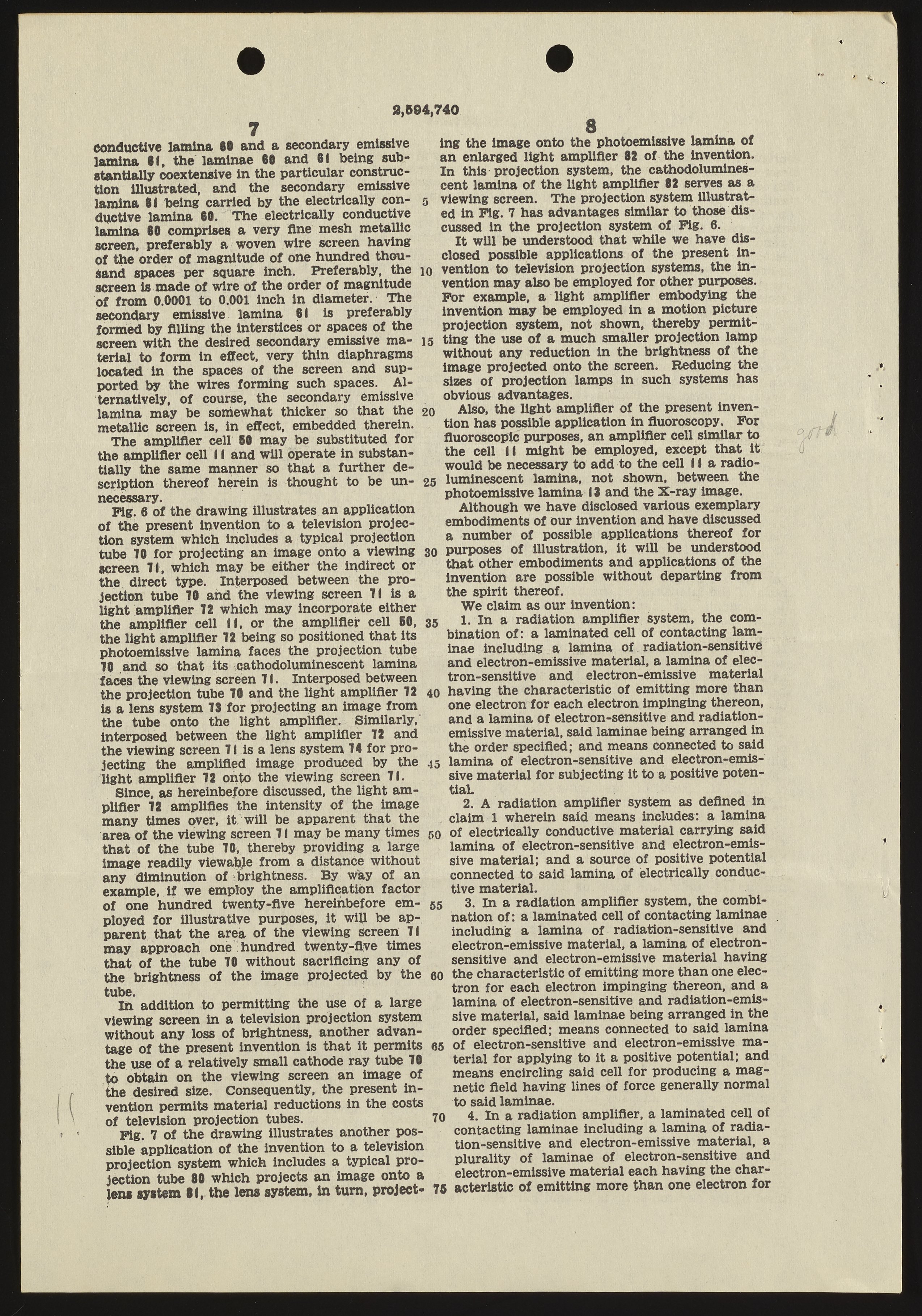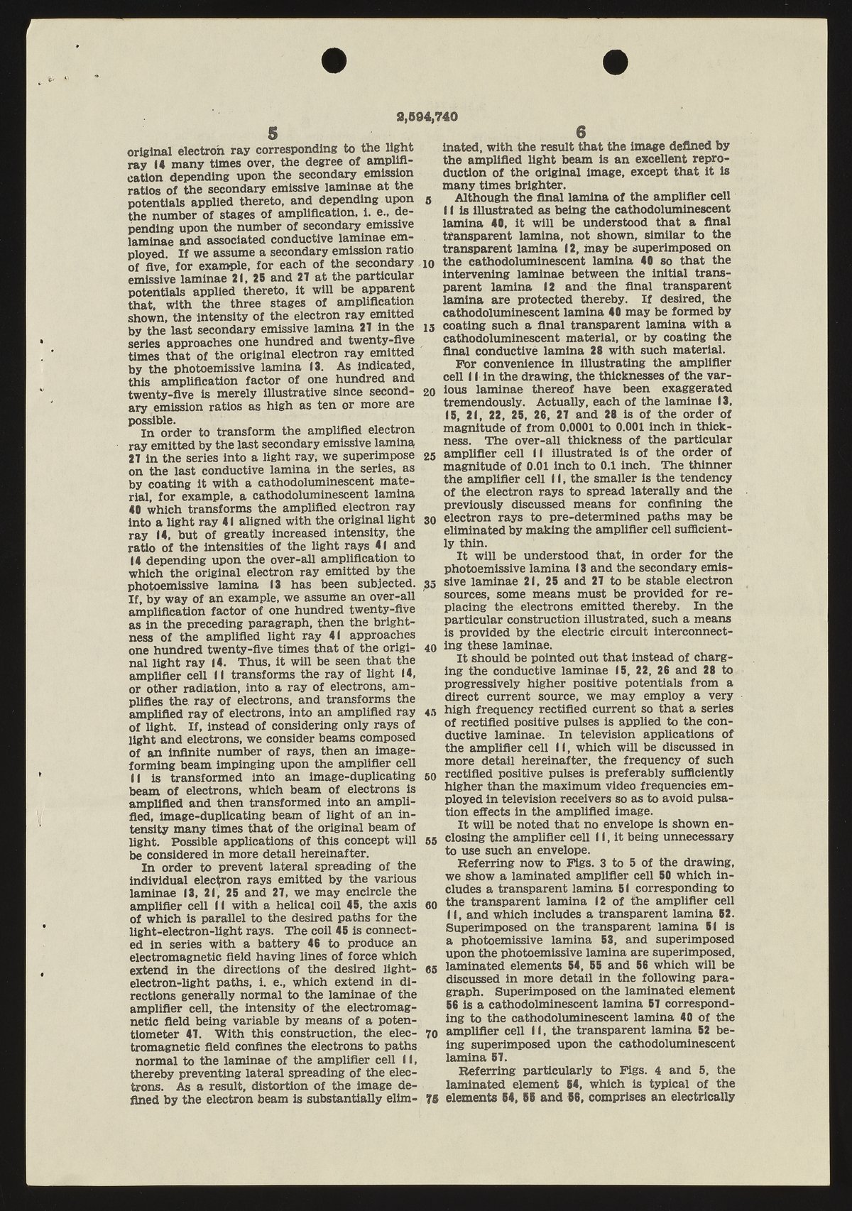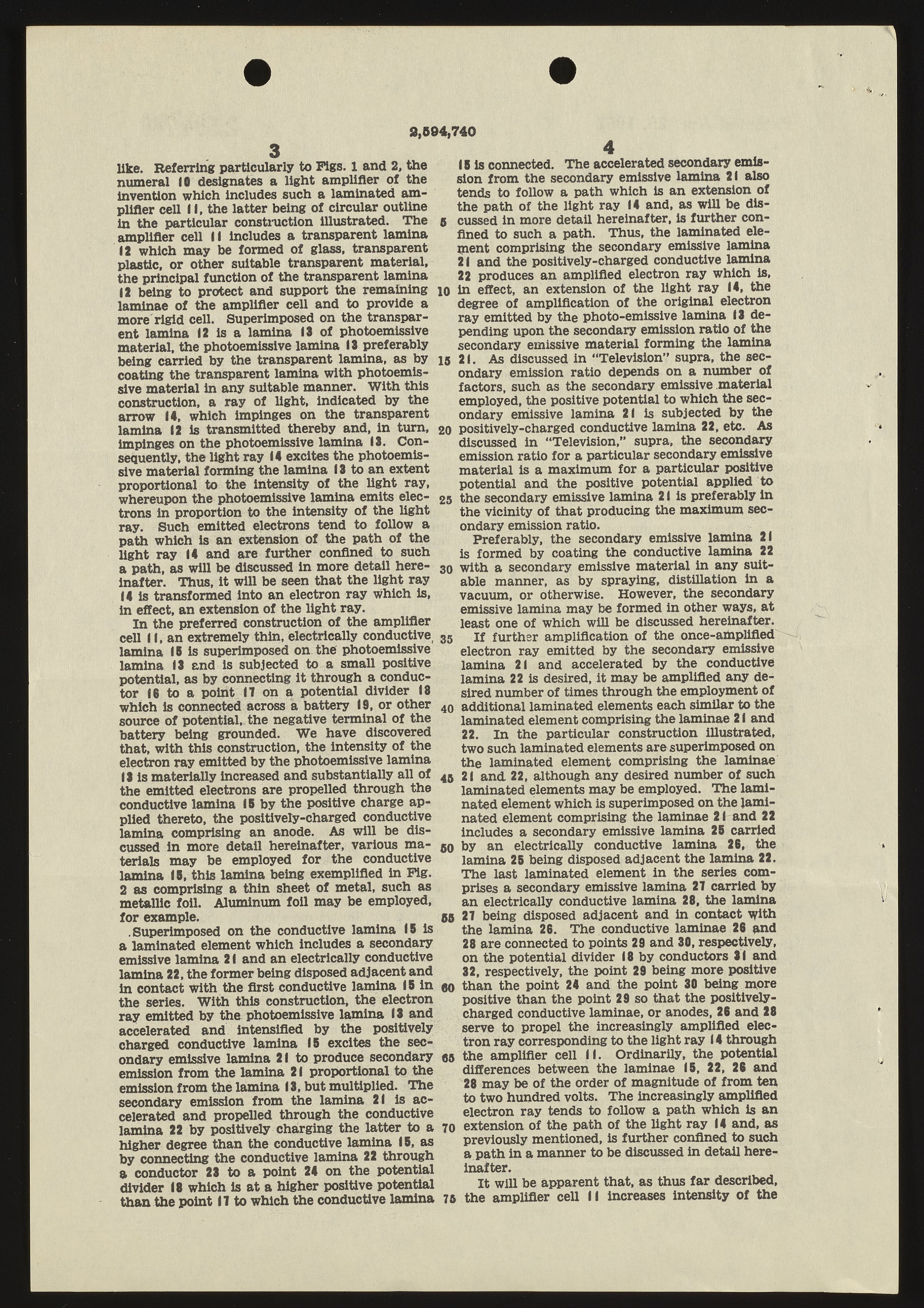 Small JPG1200 x 1720px — 247 KBFull-sized JPG2548 x 3653px — 1003 KBOriginal fileTIFF — 2548 x 3653px — 26.7 MBU.S. Patent 2,594,740, filed on behalf of Lee de Forest and William A. Rhodes, describes a device for amplifying the intensity of radiation.