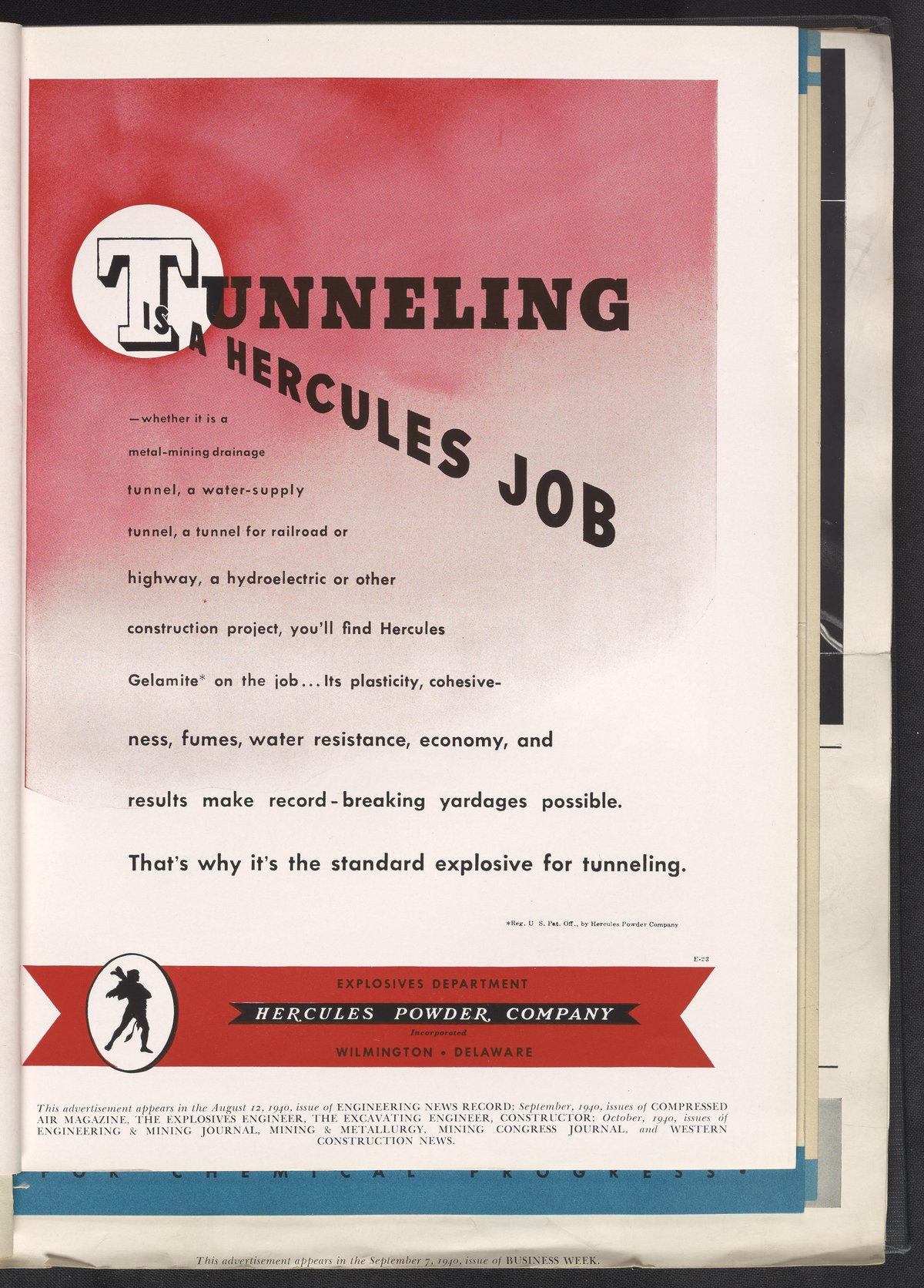 Hercules Incorporated. “Tunneling Is a Hercules Job.” 1940 Hercules Advertisements, 1940. Records of Hercules Incorporated, Volume 1940. Science History Institute. Philadelphia. https://digital.sciencehistory.org/works/2227mq42b.