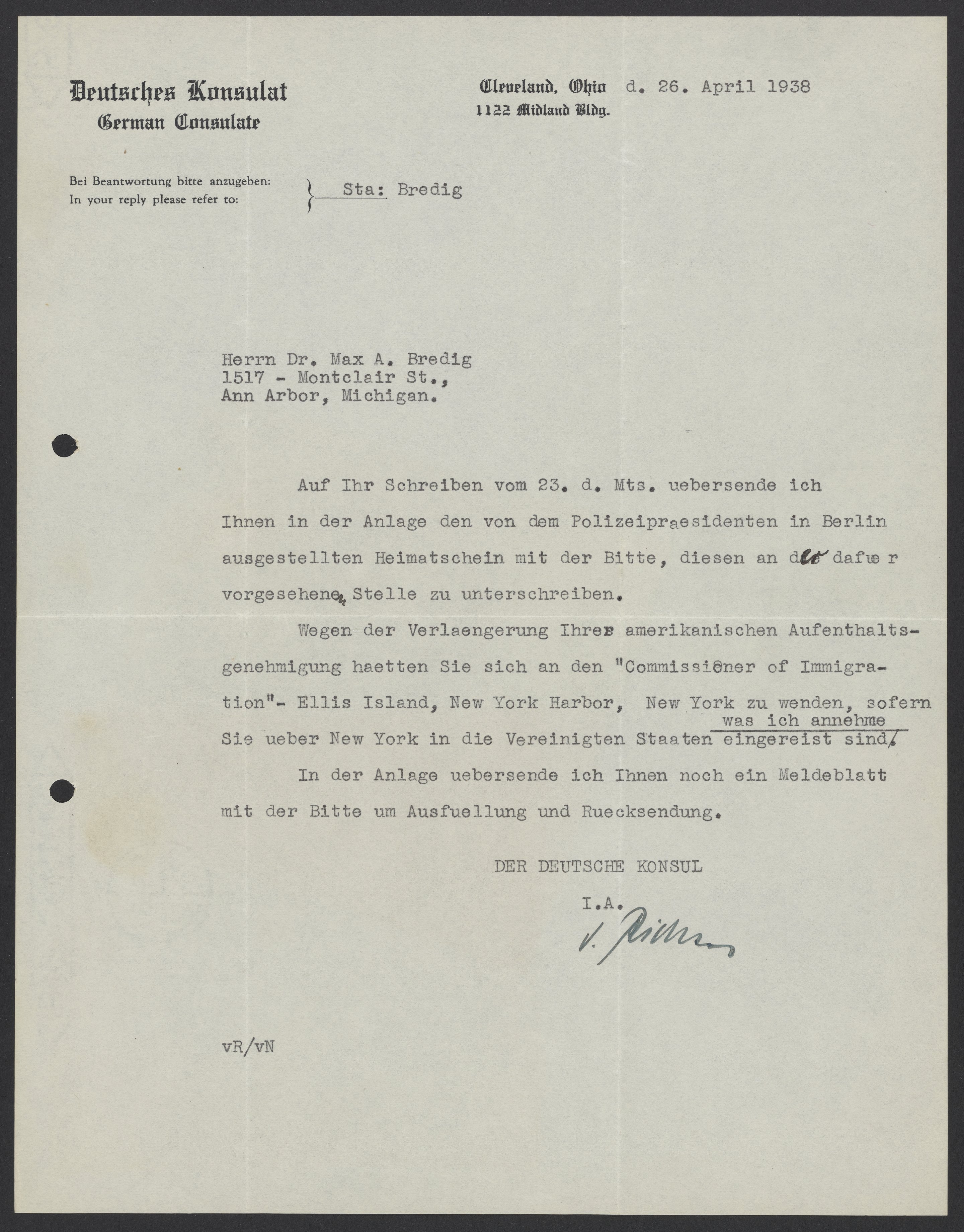 Diplomatic. “Letter from the German Consulate to Max Bredig, April 26, 1938,” April 26, 1938. Papers of Georg and Max Bredig, Box 7, Folder 37. Science History Institute. Philadelphia. https://digital.sciencehistory.org/works/23tqj9h.