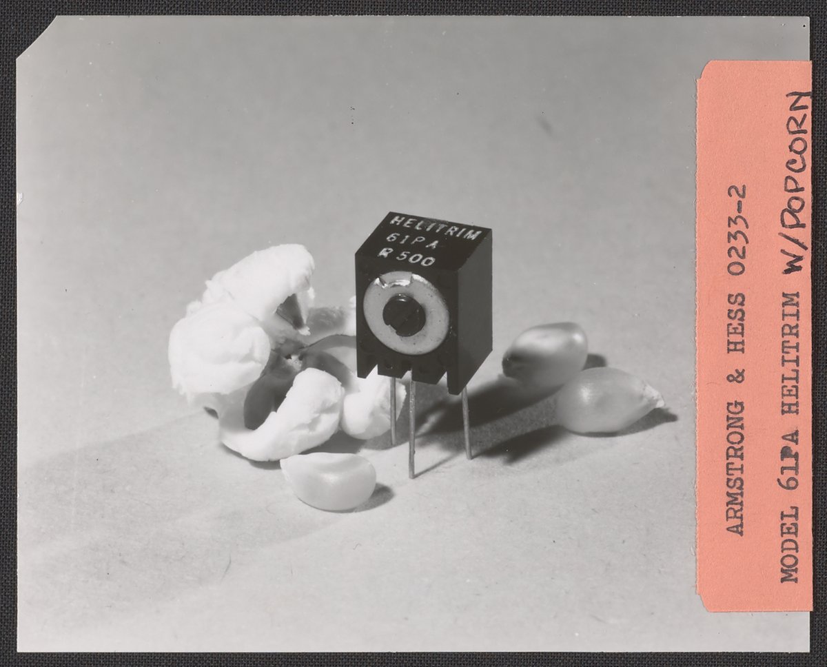 This photograph is part of a series of marketing images used to demonstrate the small size of Helipot products, here by way of popcorn and unpopped kernels.