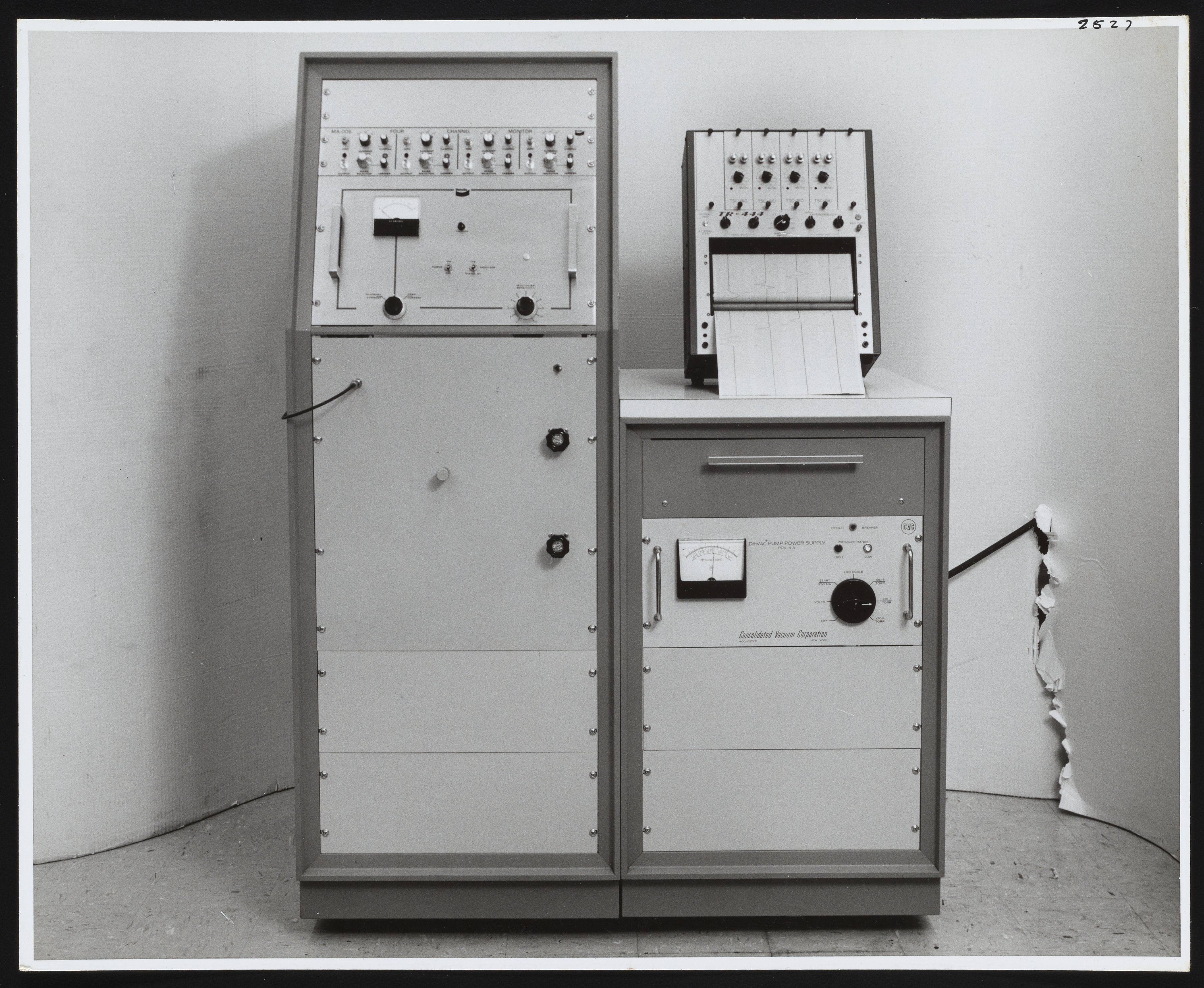 Small JPG1200 x 985px — 168 KBLarge JPG2880 x 2364px — 893 KBFull-sized JPG4244 x 3484px — 1.8 MBOriginal fileTIFF — 4244 x 3484px — 42.3 MBThree views of assorted accessories, including a Model MA-006 Four Channel Monitor and Consolidated Vacuum Corporation DRIVAC Pump Power Supply, believed to intended for use with the Bendix Corporation Time-of-Flight Mass Spectrometer. The Time-of-Flight Mass Spectrometer (TOFMS) was the flagship analytical instrument of the Bendix Corporation.
