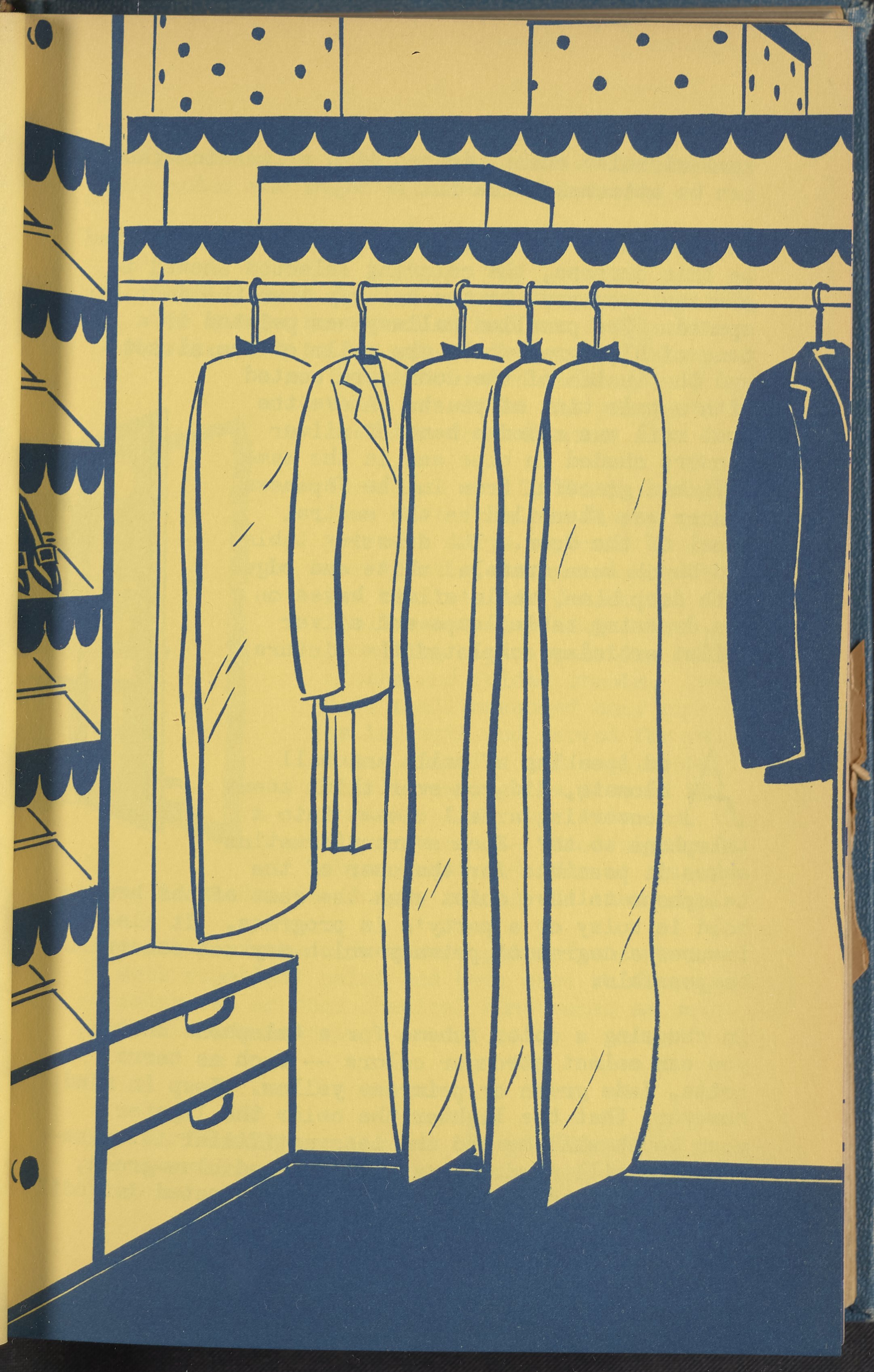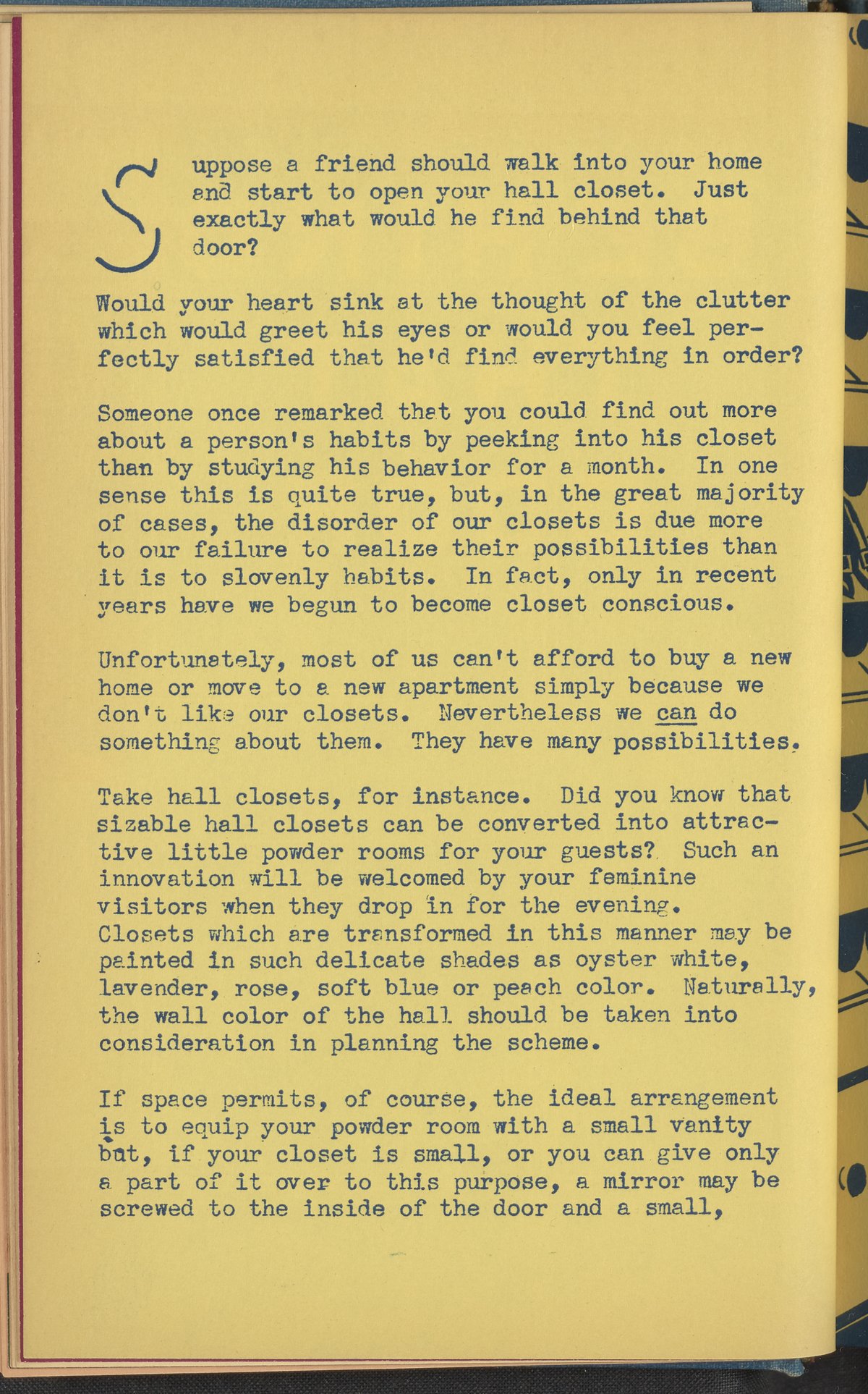 Booklet corresponding to a radio broadcast program created by the National Paint, Varnish, and Lacquer Association. The booklet discusses how to organize or repurpose a home's hall closet. Lists the possibilities for the closet, such as converting it into a powder room, a telephone booth, or a linen closet. Describes how to decorate and furnish the space for each possibility. Then, explains how to organize a closet shared by a couple. Includes small stylized illustrations throughout and decorated covers.