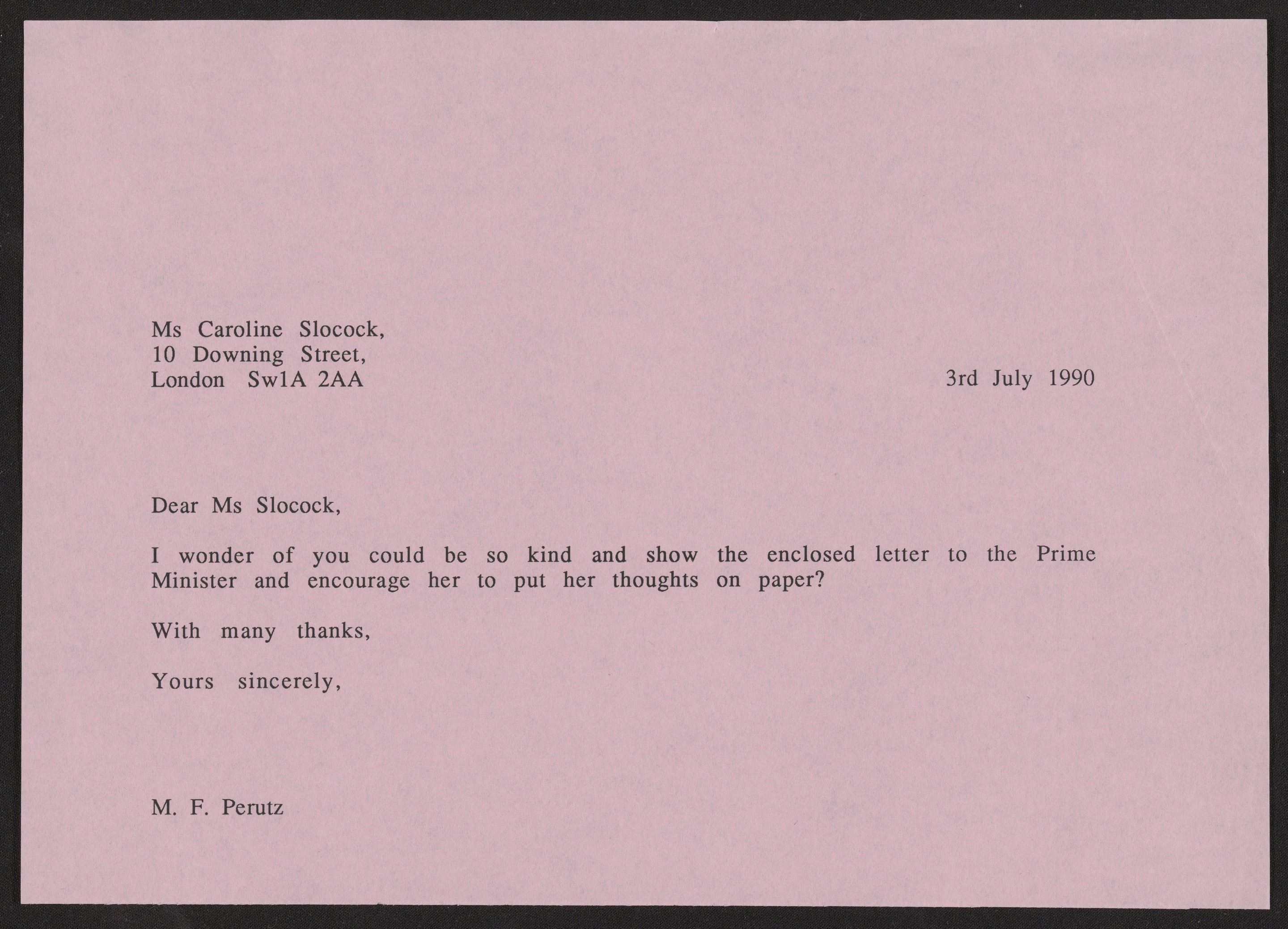 Perutz, Max F. “Letter from Max Perutz to Caroline Slocock, July 3, 1990,” July 3, 1990. History of Molecular Biology Collection, Box 74, Folder 3. Science History Institute. Philadelphia. https://digital.sciencehistory.org/works/26h4q2j.