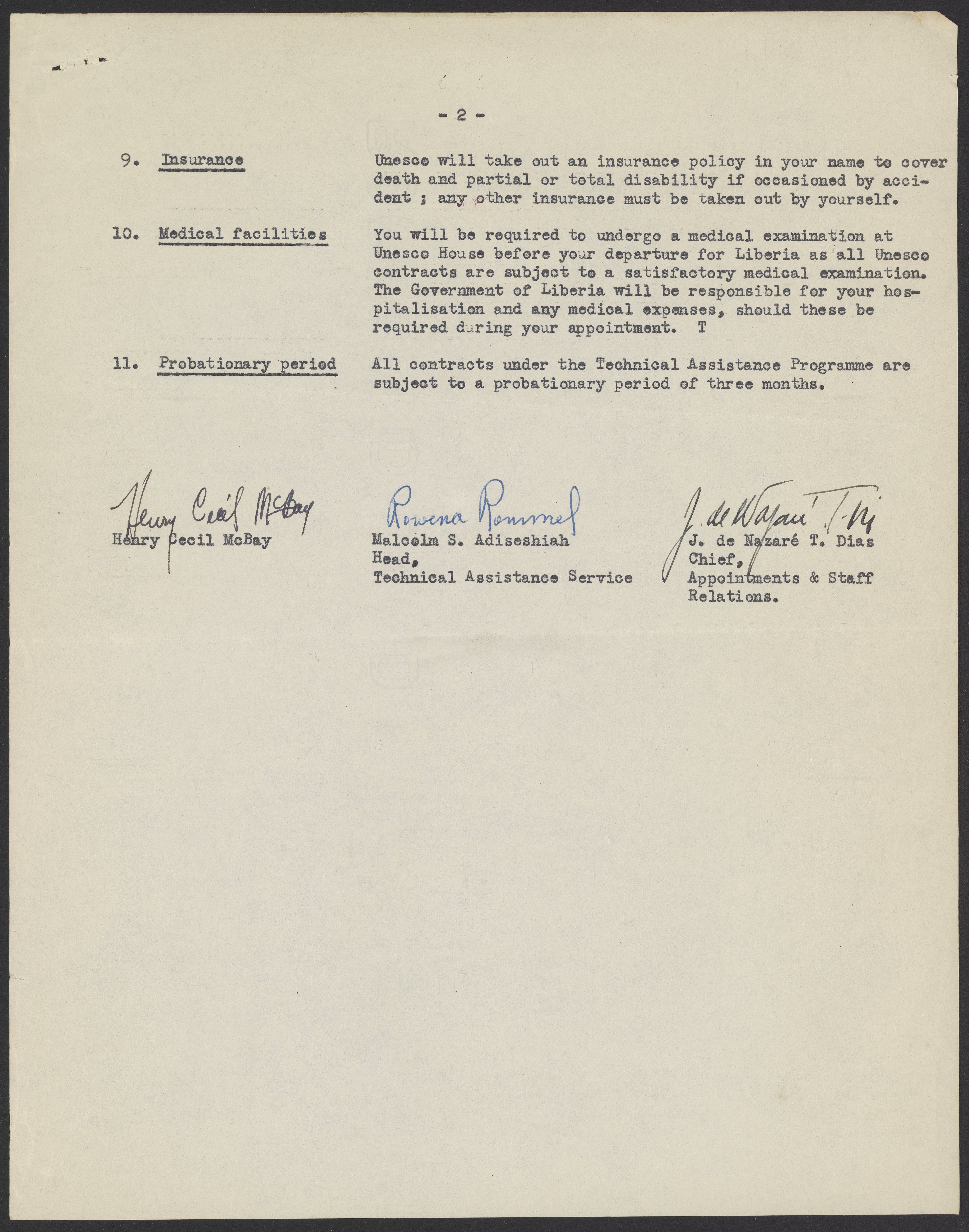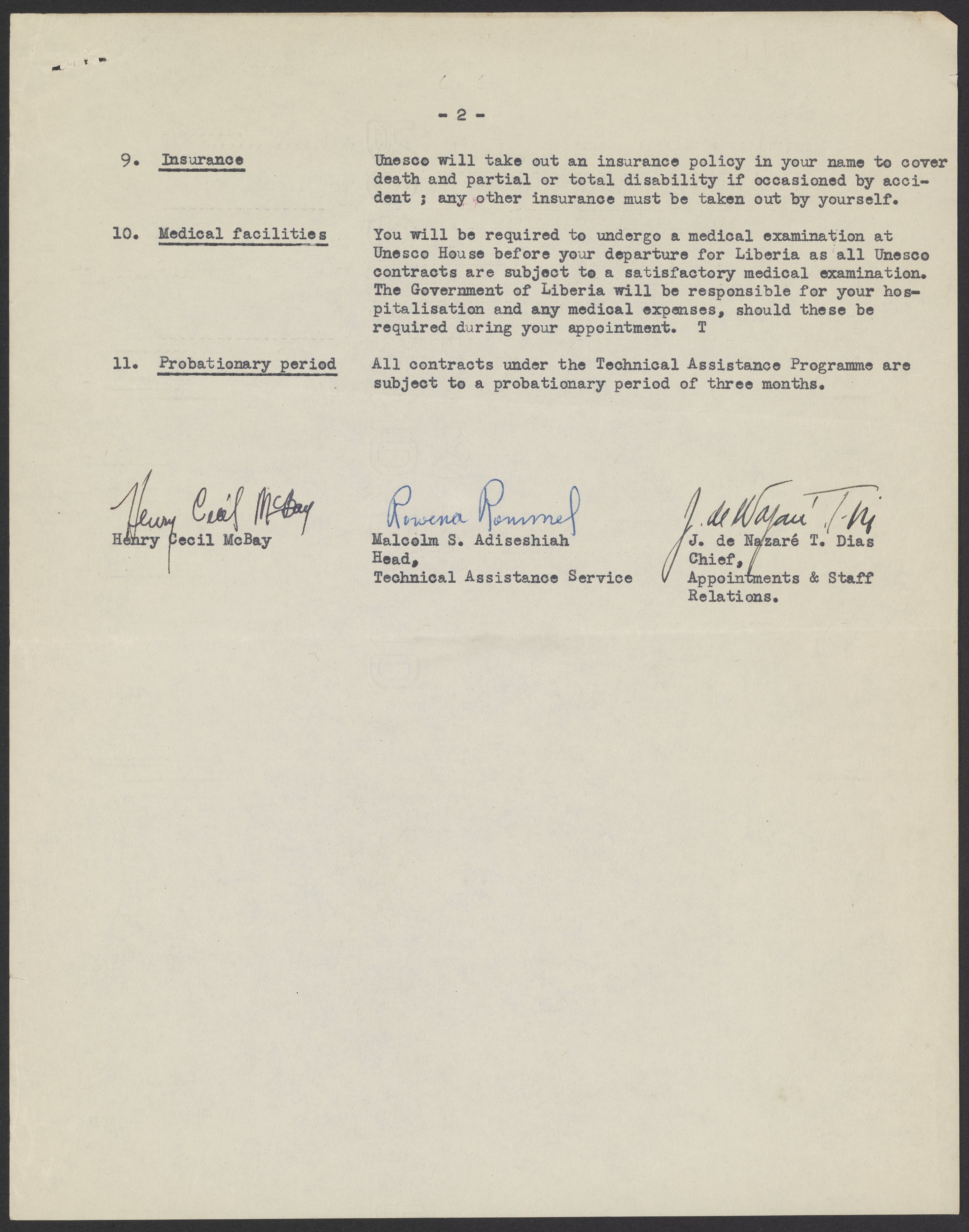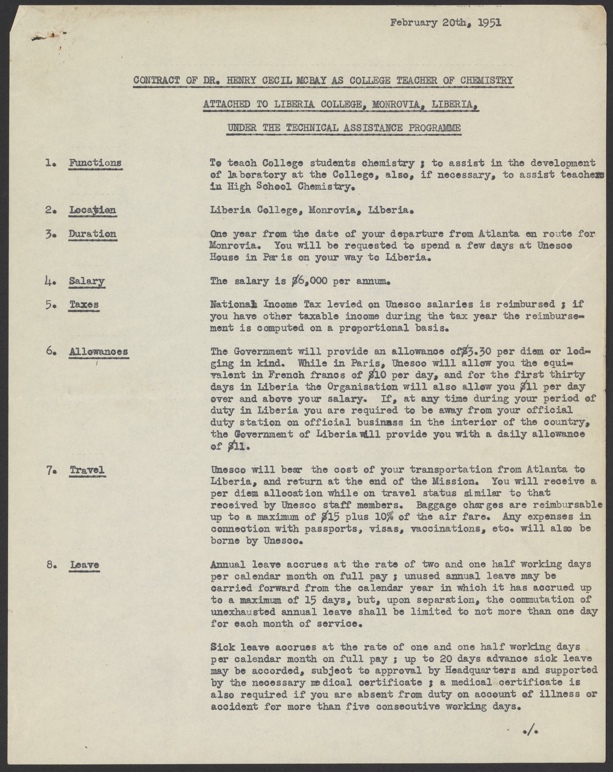 Contract for the appointment of Henry McBay (1914-1995) as a chemistry professor at Liberia College, Monrovia, Liberia. In 1951, McBay developed a chemistry education program in Liberia on behalf of the United Nations Education, Scientific, and Cultural Organization (UNESCO).