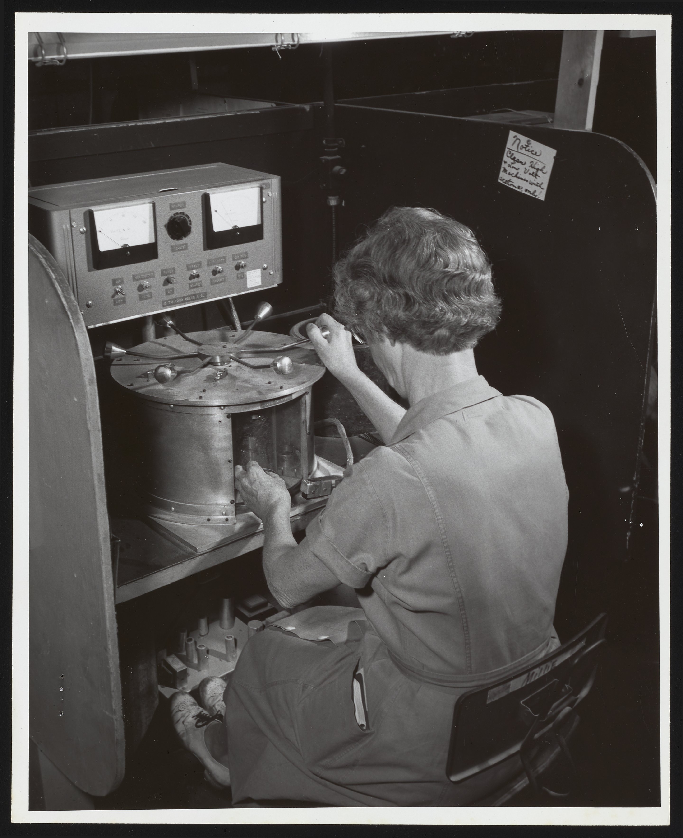 General view of an unidentified female employee operating an apparatus used to test special electric detonators manufactured at the Hercules Powder Company plant in Port Ewen, New York. Formed in 1912 as part of an anti-trust settlement with DuPont, the Hercules Powder Company (later Hercules Inc.) specialized in the manufacture of explosives and smokeless powders. The company's Port Ewen plant produced a range of special detonators designed for military use, as well as construction jobs that required blasts of dynamite, such as the clearing of quarries, mines, and tunnels.