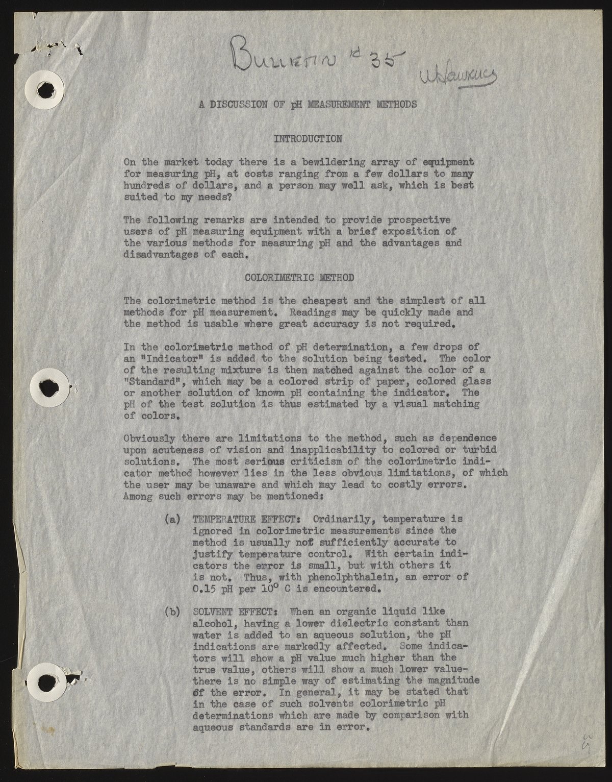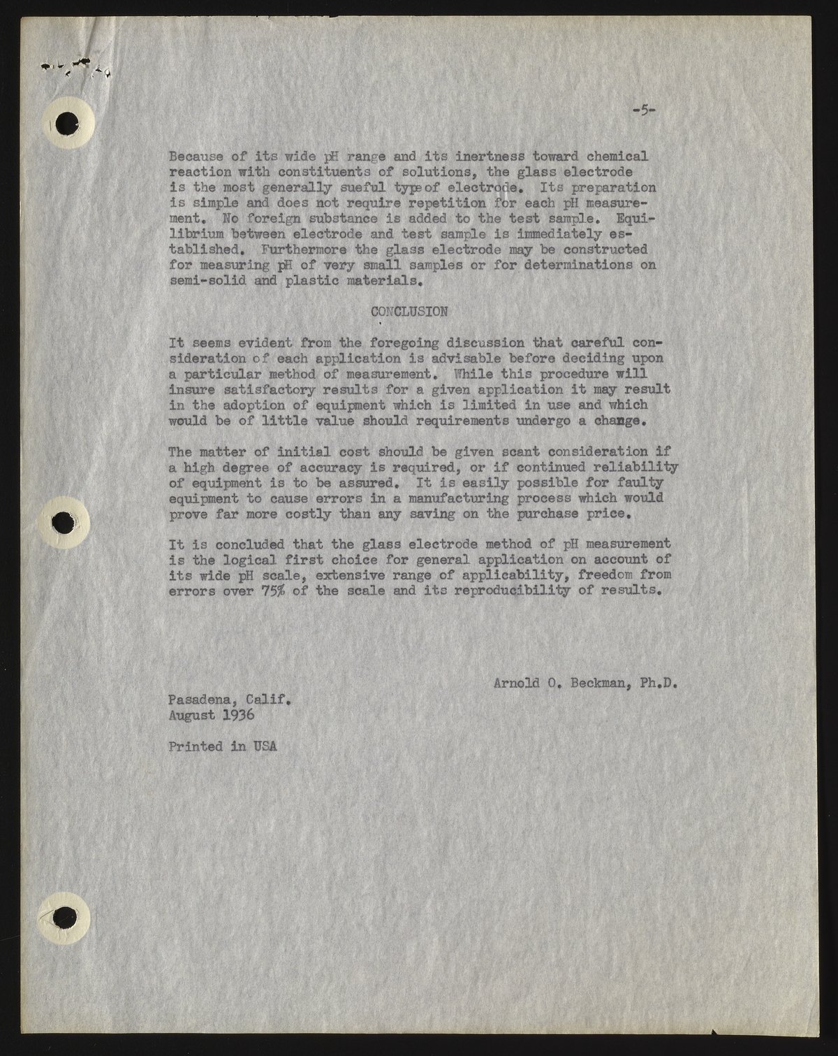 Beckman, Arnold O. “A Discussion of PH Measurement Methods,” August 1936. Beckman Historical Collection, Box 104, Folder 11. Science History Institute. Philadelphia. https://digital.sciencehistory.org/works/2801pg85d.