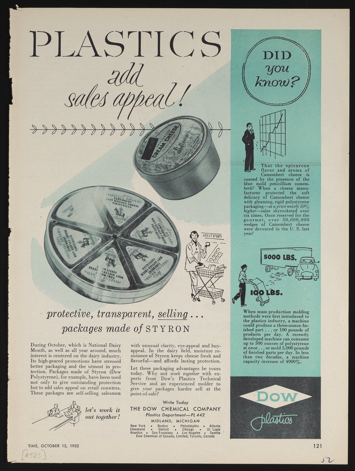 Color print advertisement for Dow Plastics. The advertisement features black-and-white illustrations of cream cheese and Camembert cheese in plastic packaging. There are also small illustrations of a woman with a shopping cart, a man consulting a graph, and a delivery truck. The accompanying text describes the benefits of plastic packaging for the dairy industry, particularly Styron, the trade name for Dow Styrenic plastics. This advertisement appeared on page 121 of the October 13, 1952 edition of Time. The advertisement text identifies October as National Dairy Month.