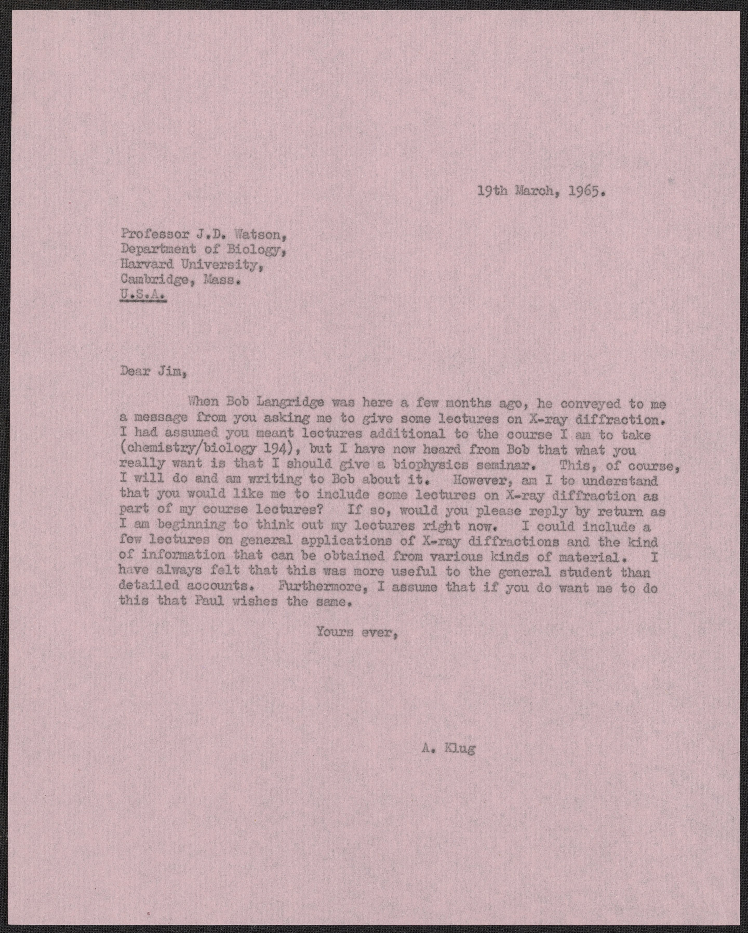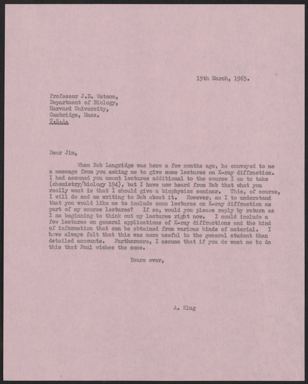 Letter from Aaron Klug to James Watson, March 19, 1965