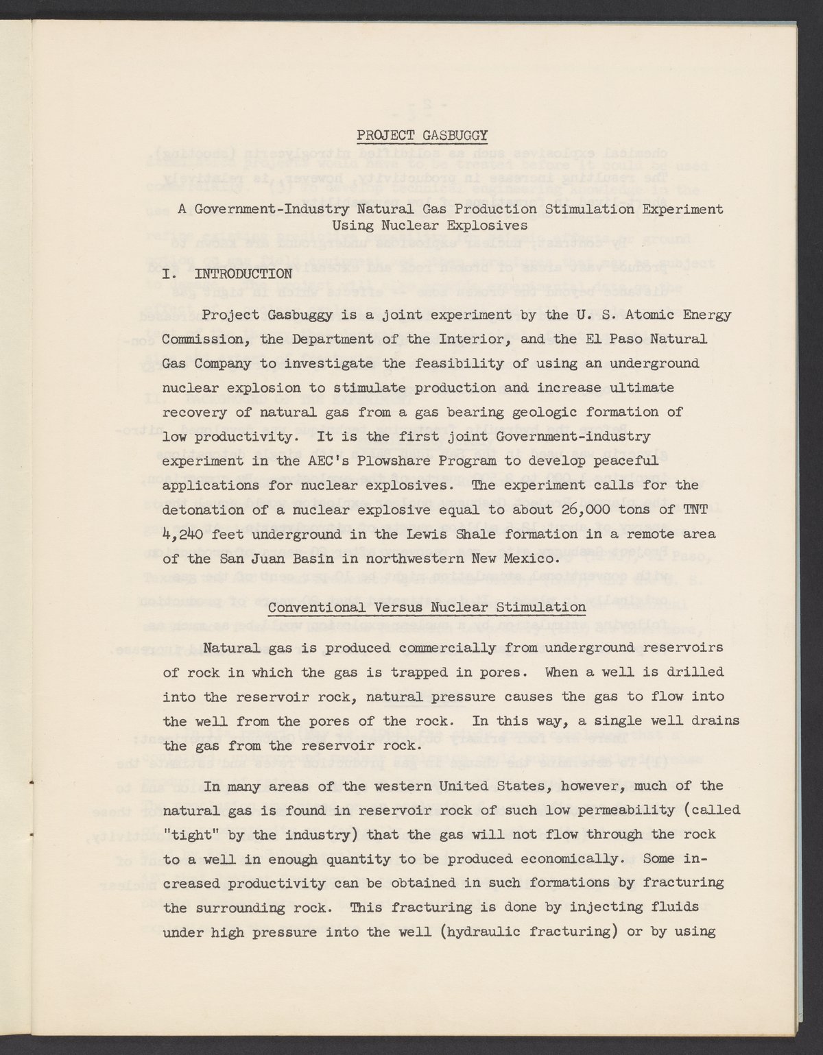 Project Gasbuggy: A Government-Industry Natural Gas Production Stimulation Experiment Using Nuclear Explosives
