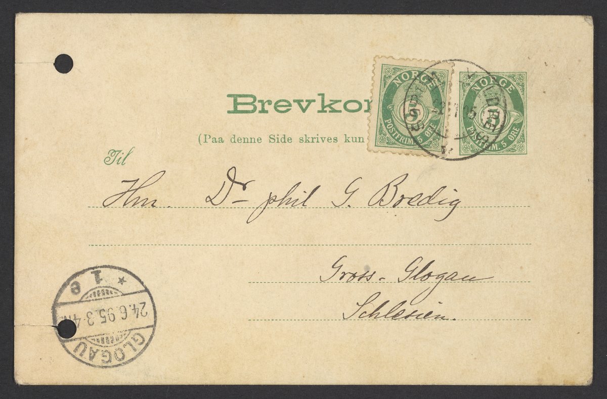 Small JPG1200 x 790px — 154 KBLarge JPG2880 x 1897px — 801 KBFull-sized JPG3534 x 2328px — 1.1 MBOriginal fileTIFF — 3534 x 2328px — 23.6 MBPostcard from Svante Arrhenius (1859-1927) to Georg Bredig (1864-1944). Arrhenius tells Bredig of his travels in Norway and Christiana.