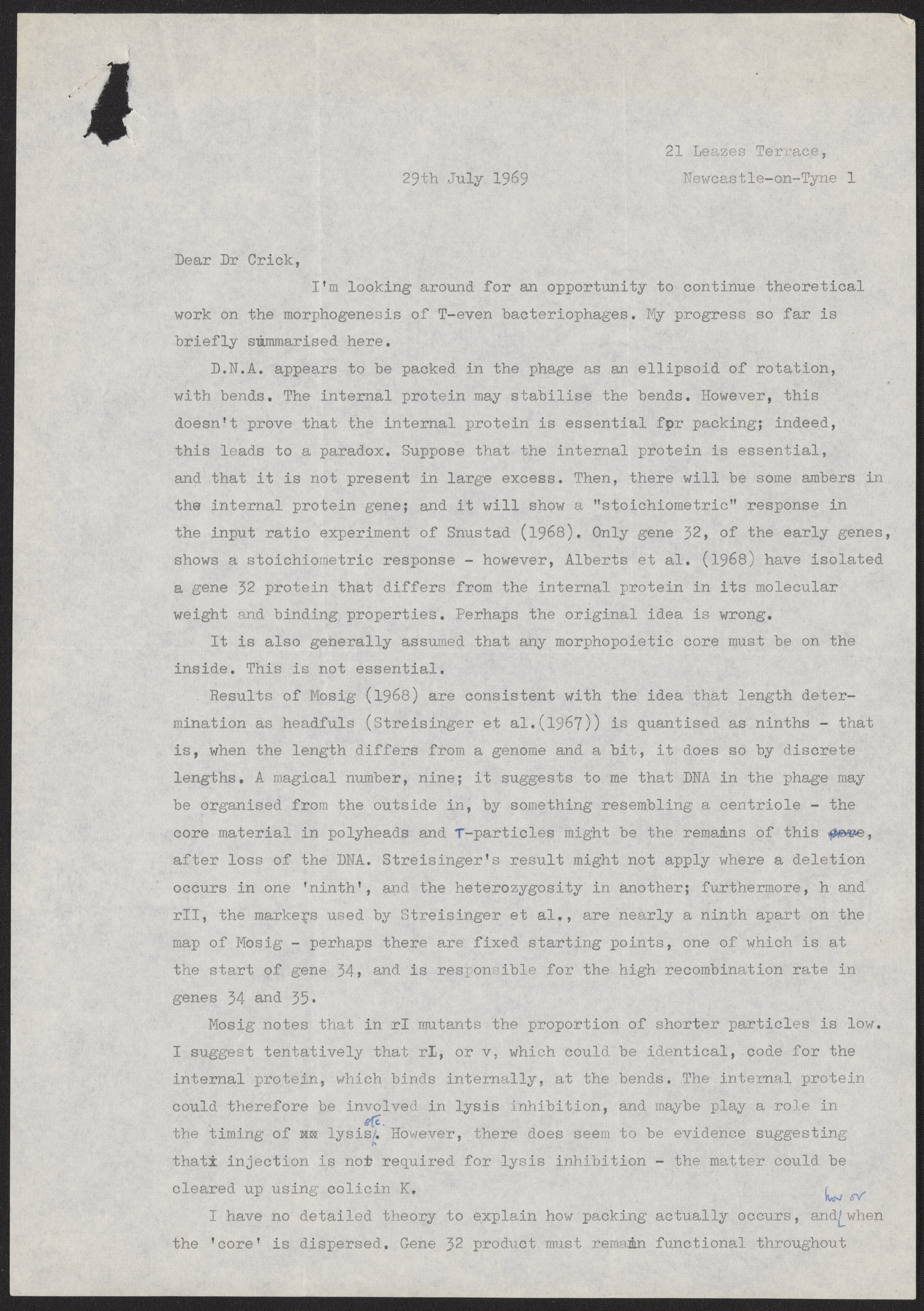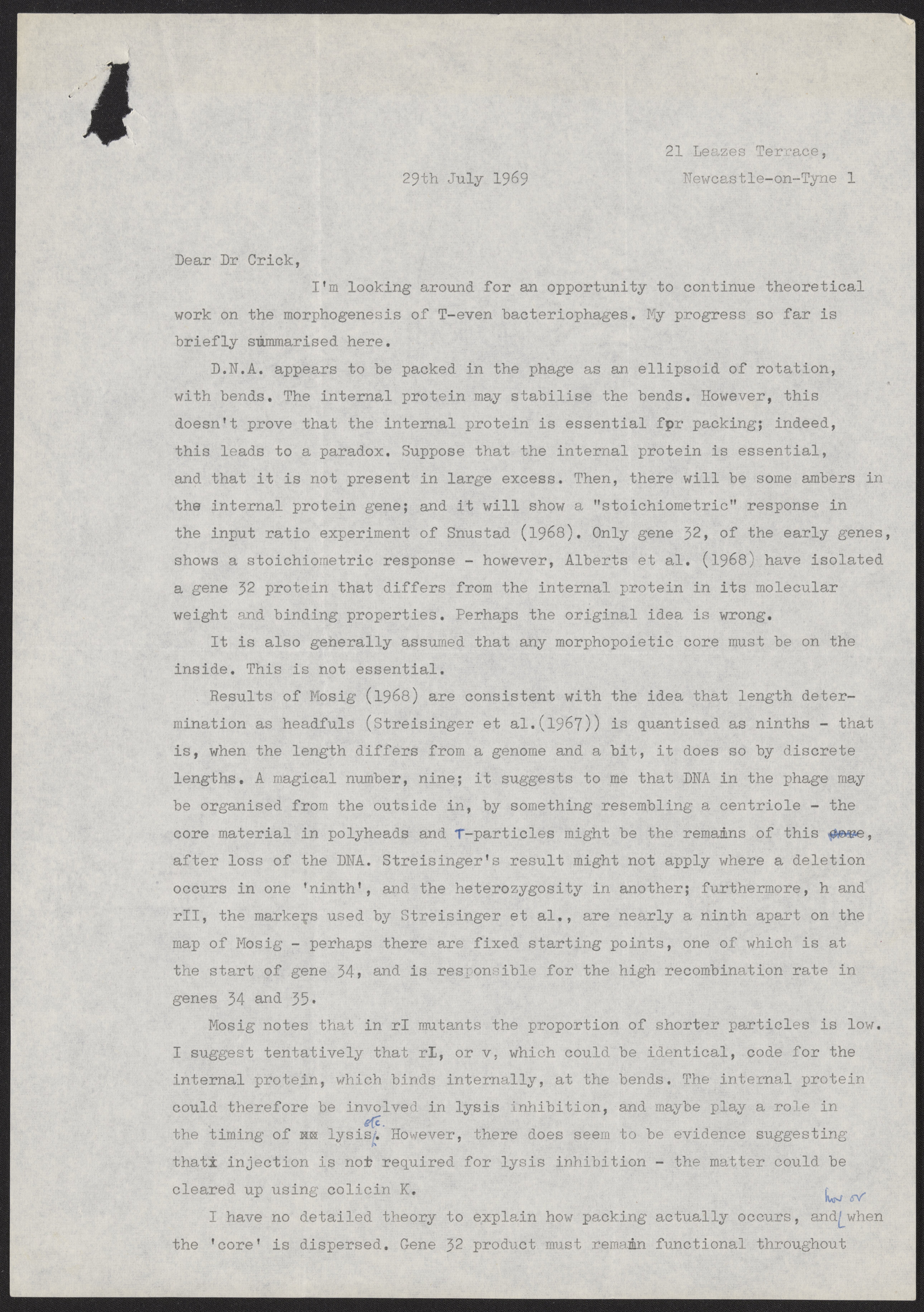 Micklethwait, Peter. “Letter from Peter Micklethwait to Francis Crick, July 29, 1969,” July 29, 1969. History of Molecular Biology Collection, Box 20, Folder 8. Science History Institute. Philadelphia. https://digital.sciencehistory.org/works/2e0h42n.