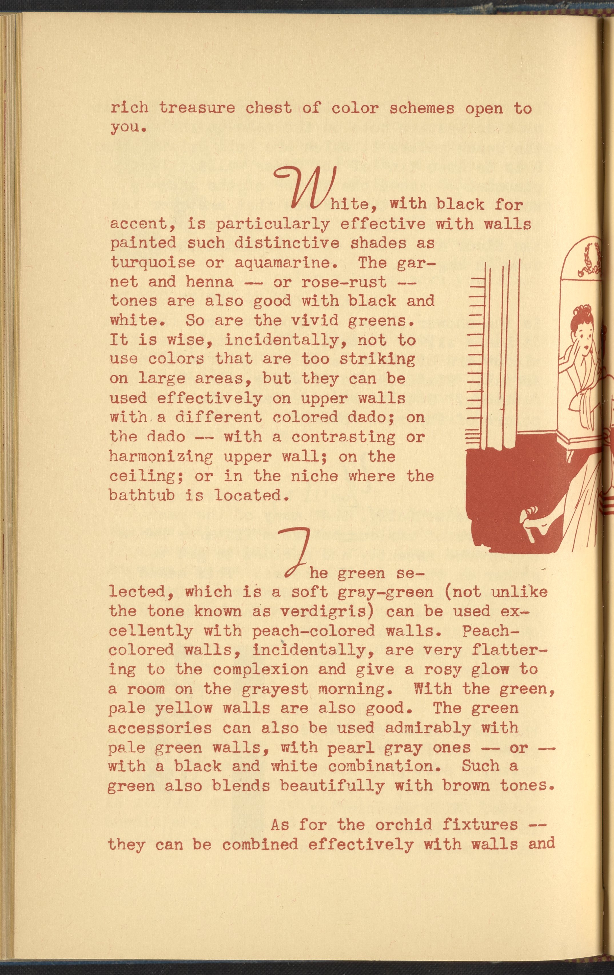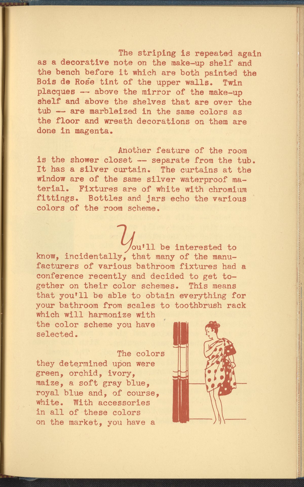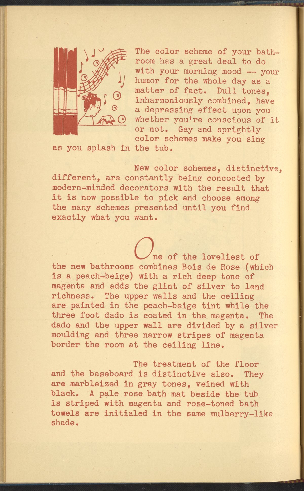 Booklet corresponding to a radio broadcast program created by the National Paint, Varnish, and Lacquer Association. The booklet describes various bathroom color schemes and fixtures to inspire readers to redecorate their home's bathrooms. Includes small stylized illustrations throughout and decorated covers.