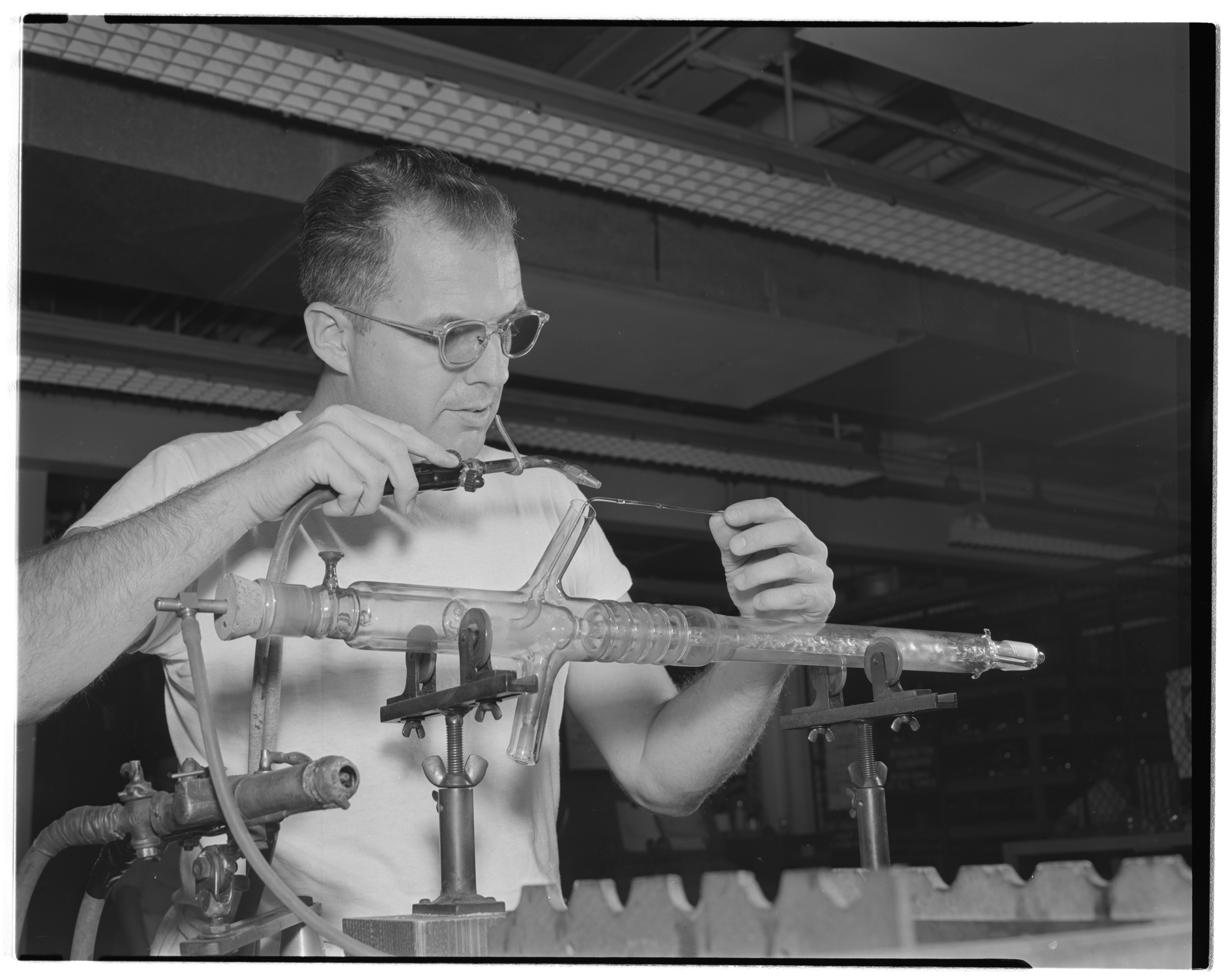 General view of Bill Pahl alternately heating and compressing a glass tube, part of a semi-microfractionation column manufactured in the Dow Chemical Company's Glass Fabrication department. Founded in 1925, the department was responsible for the fabrication and repair of specialty glass equipment used at the Company's plant in Midland, Michigan. This technique was used to increase the thickness of a particular part of the tube.