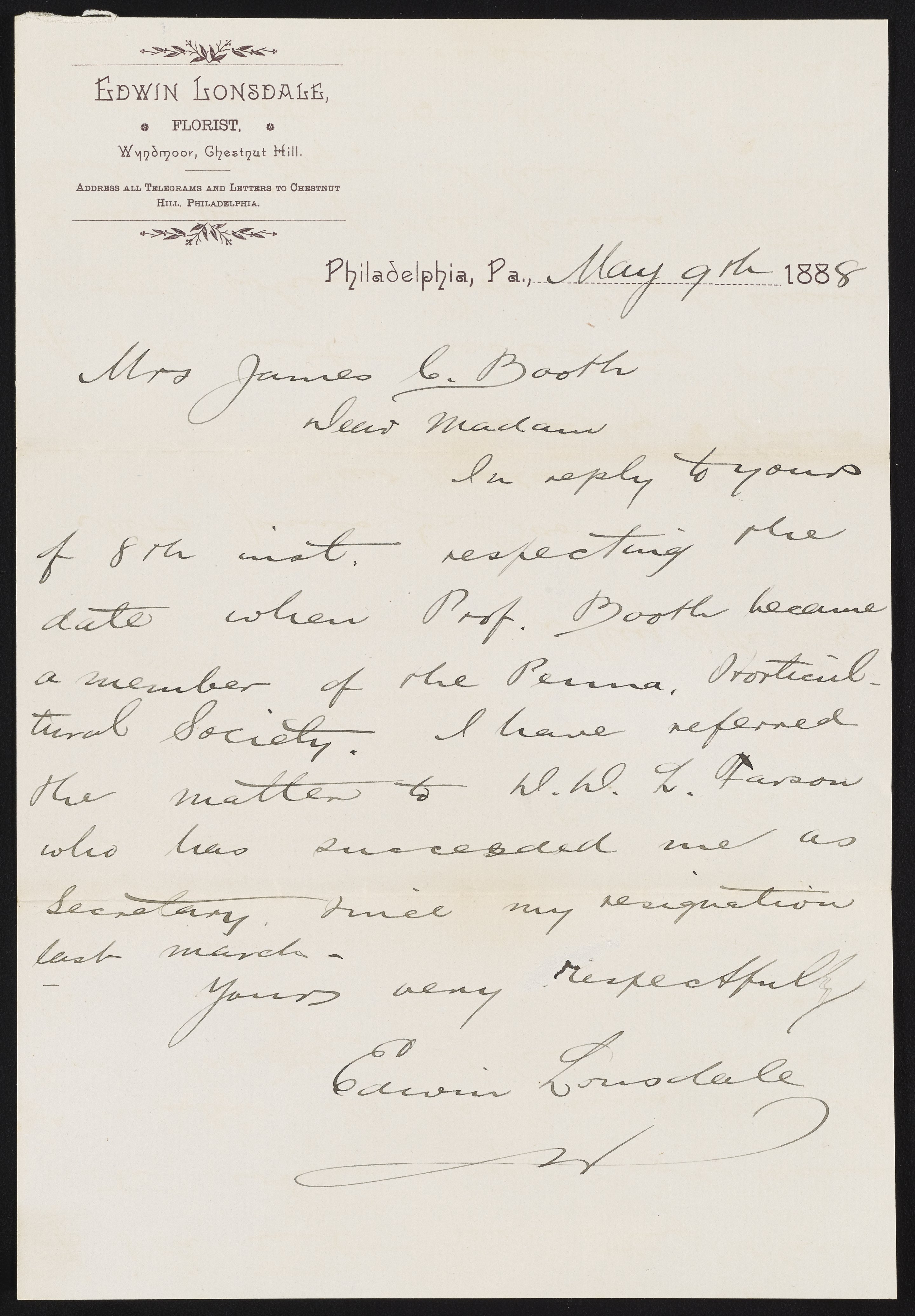 Small JPG1200 x 1725px — 221 KBLarge JPG2880 x 4141px — 1.3 MBFull-sized JPG3806 x 5472px — 2.1 MBOriginal fileTIFF — 3806 x 5472px — 59.6 MBEdwin Lonsdale, a florist, forwards a request to Margaret M. Booth, wife of James Curtis Booth (1810-1888), for information concerning the date of Booth's election to the Horticultural Society for his successor as Secretary, D.D.L. Farson.