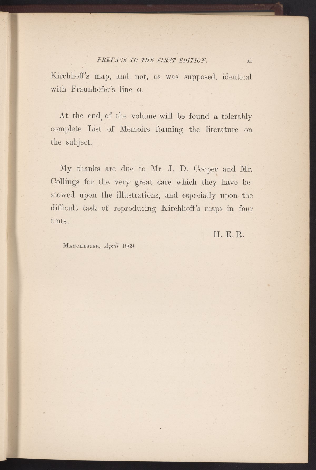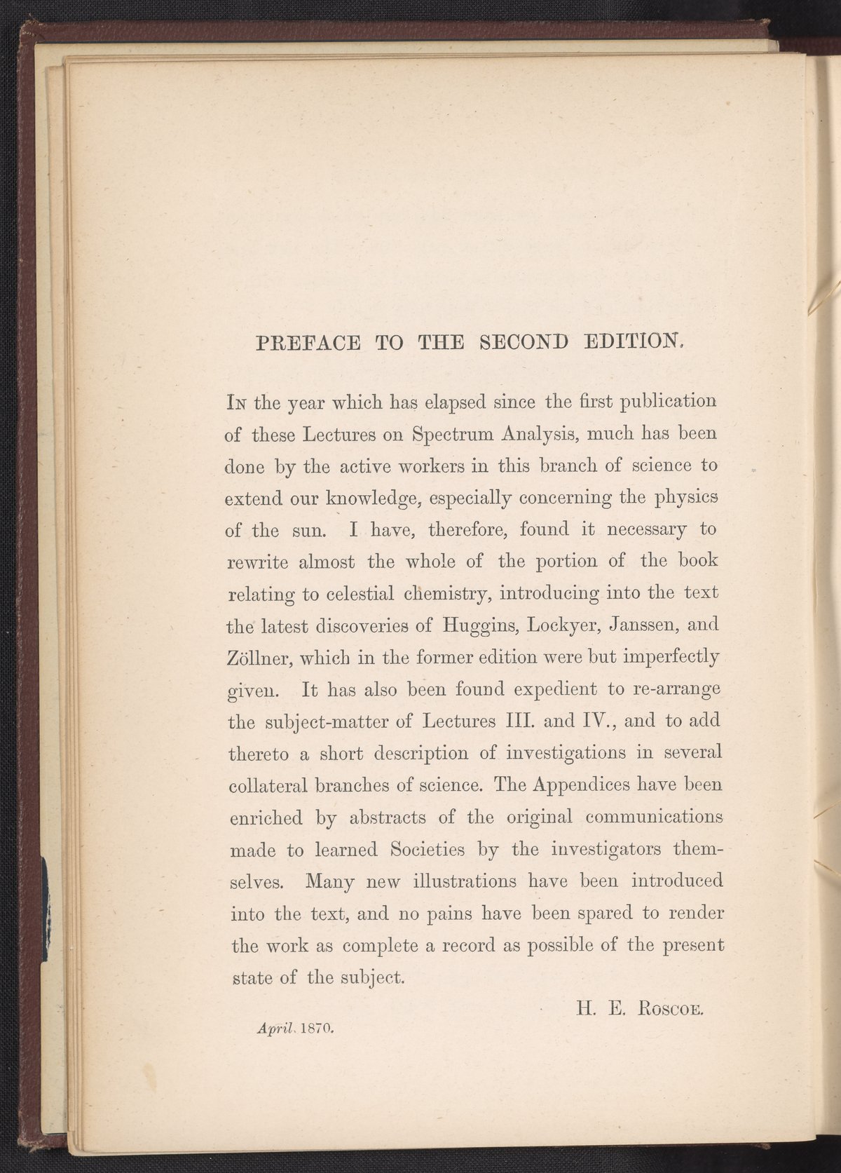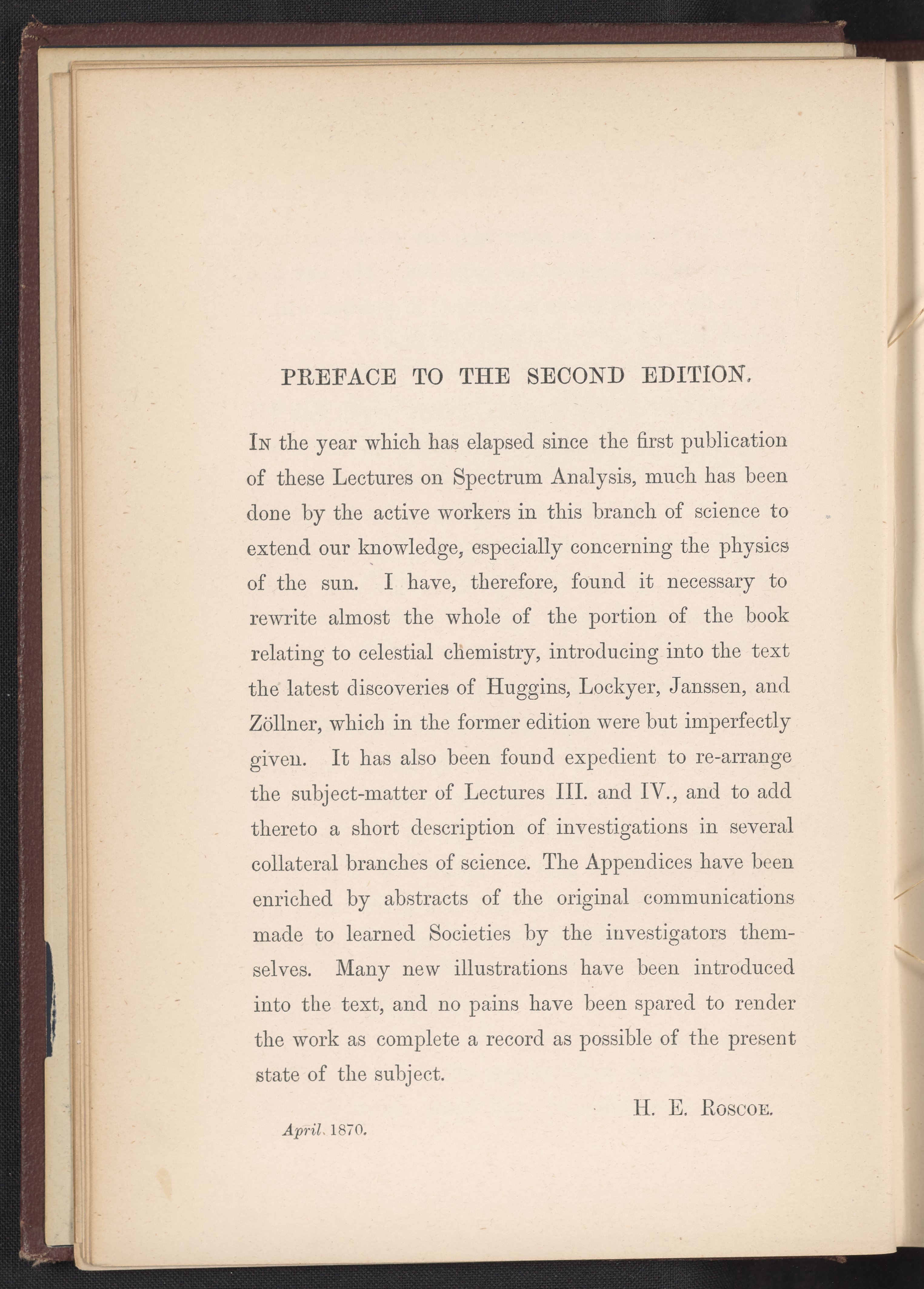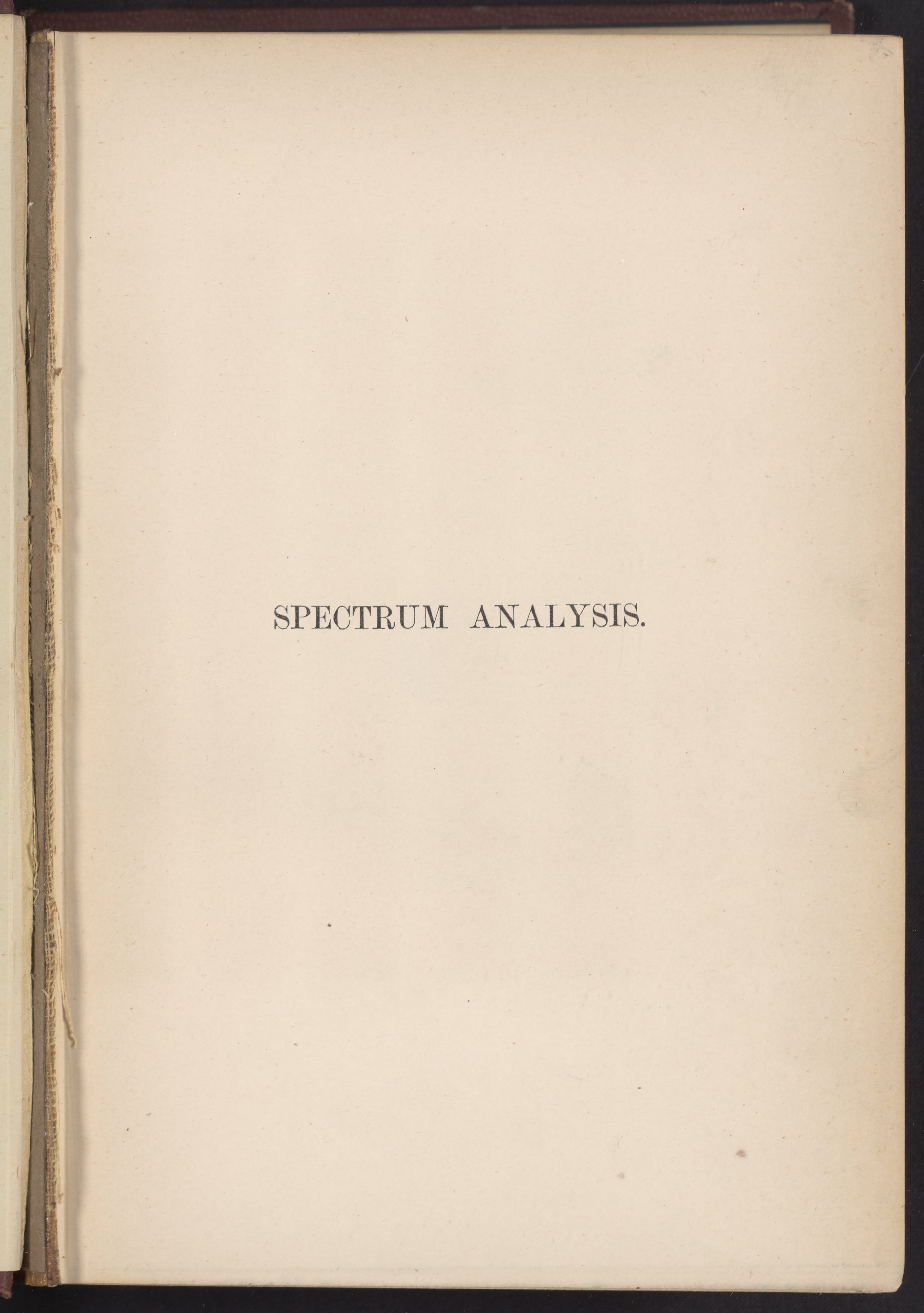 Small JPG1200 x 1573px — 391 KBLarge JPG2880 x 3776px — 1.7 MBFull-sized JPG3188 x 4180px — 2.0 MBOriginal fileTIFF — 3188 x 4180px — 38.2 MBThird edition volume of Spectrum Analysis by Henry Enfield Roscoe (1833-1915) with numerous engravings and colored plates. Roscoe has included a series of six lectures on the subject of spectrum analysis with appendices, for which he hopes these principle memoirs will "prove interesting to all, as it will certainly be useful to those specially engaged in scientific inquiry..." These lectures were delivered in 1868 to the Society of Apothecaries of London, extant today as one of the largest livery companies of the City of London.