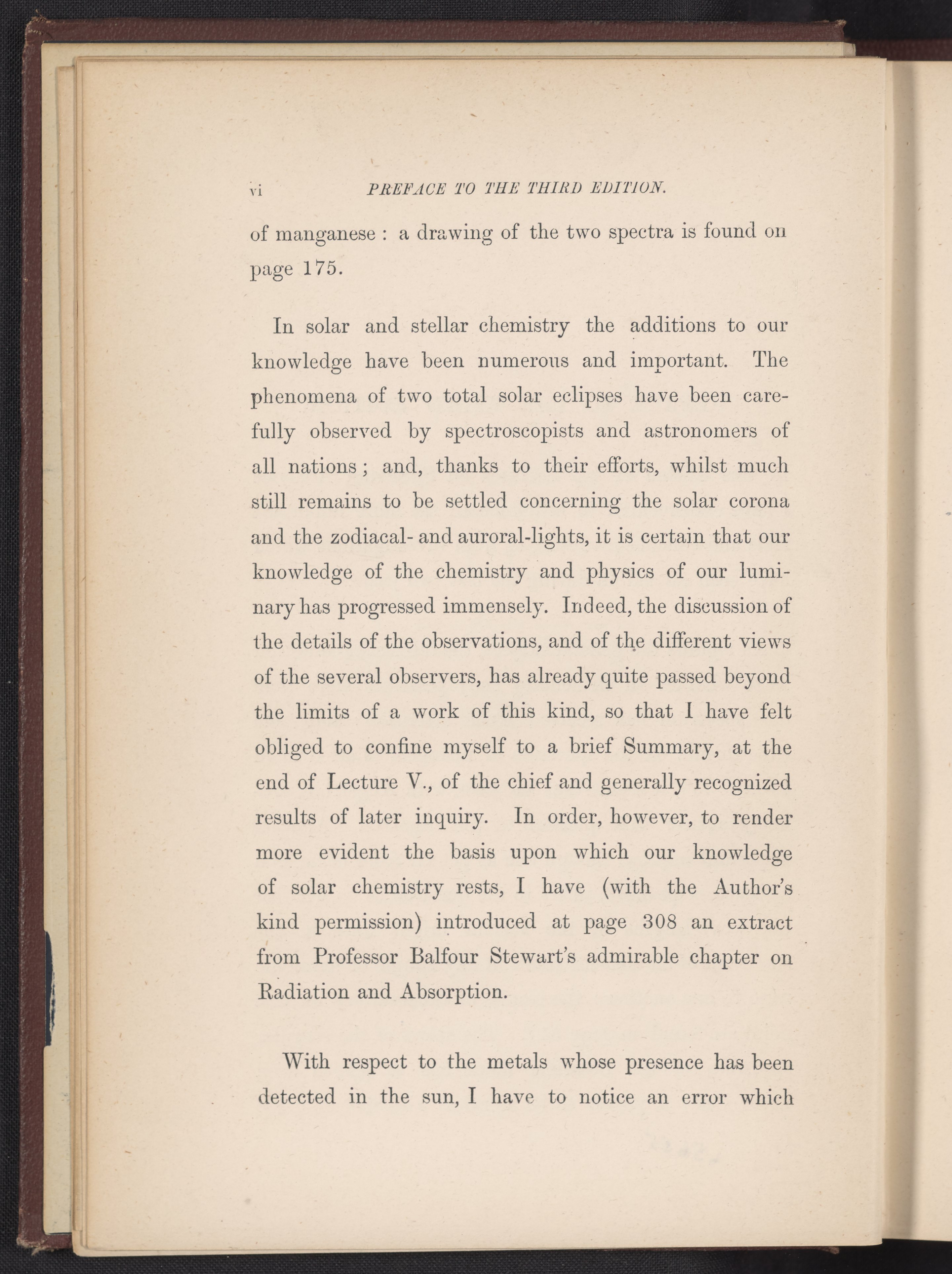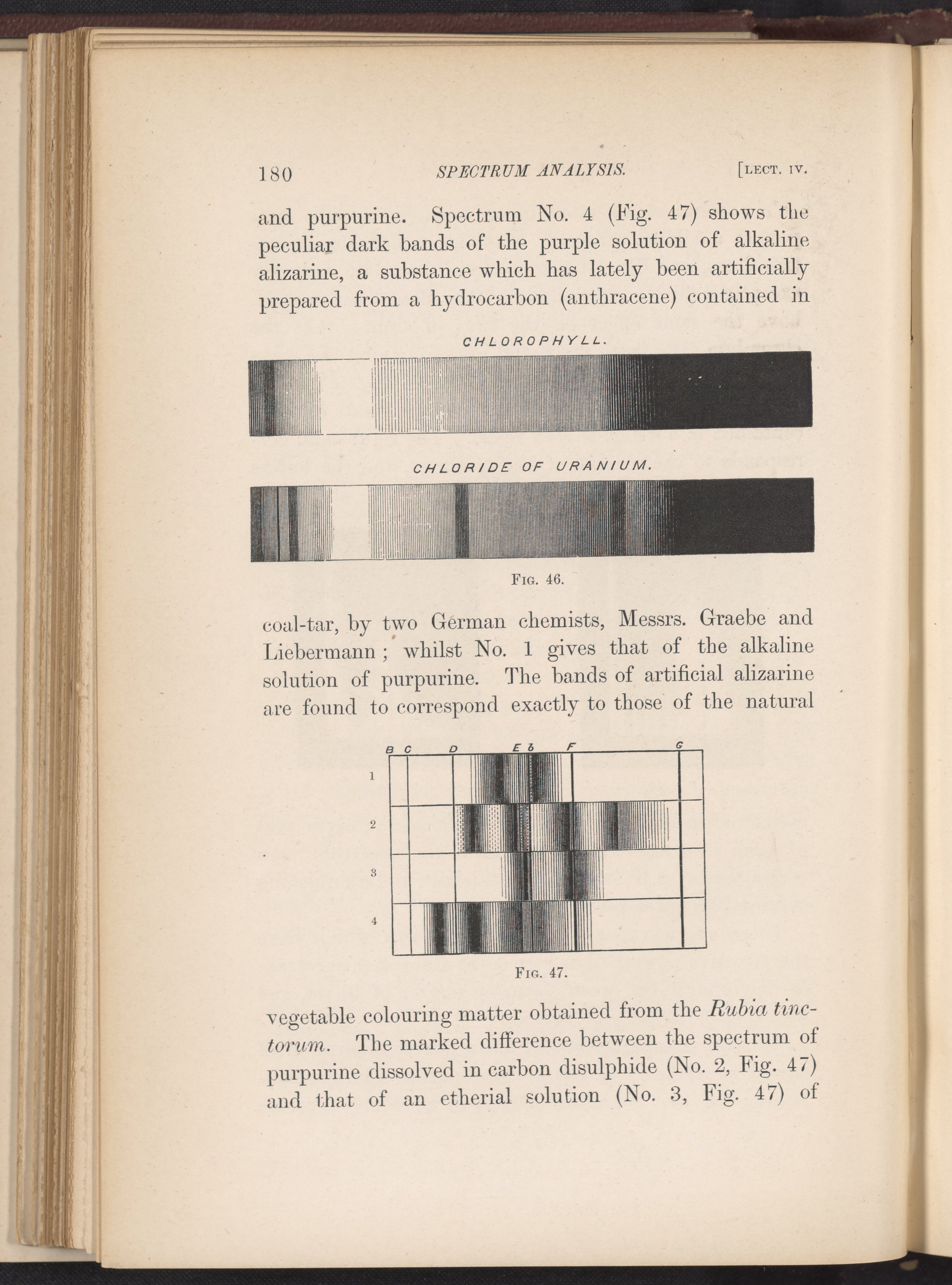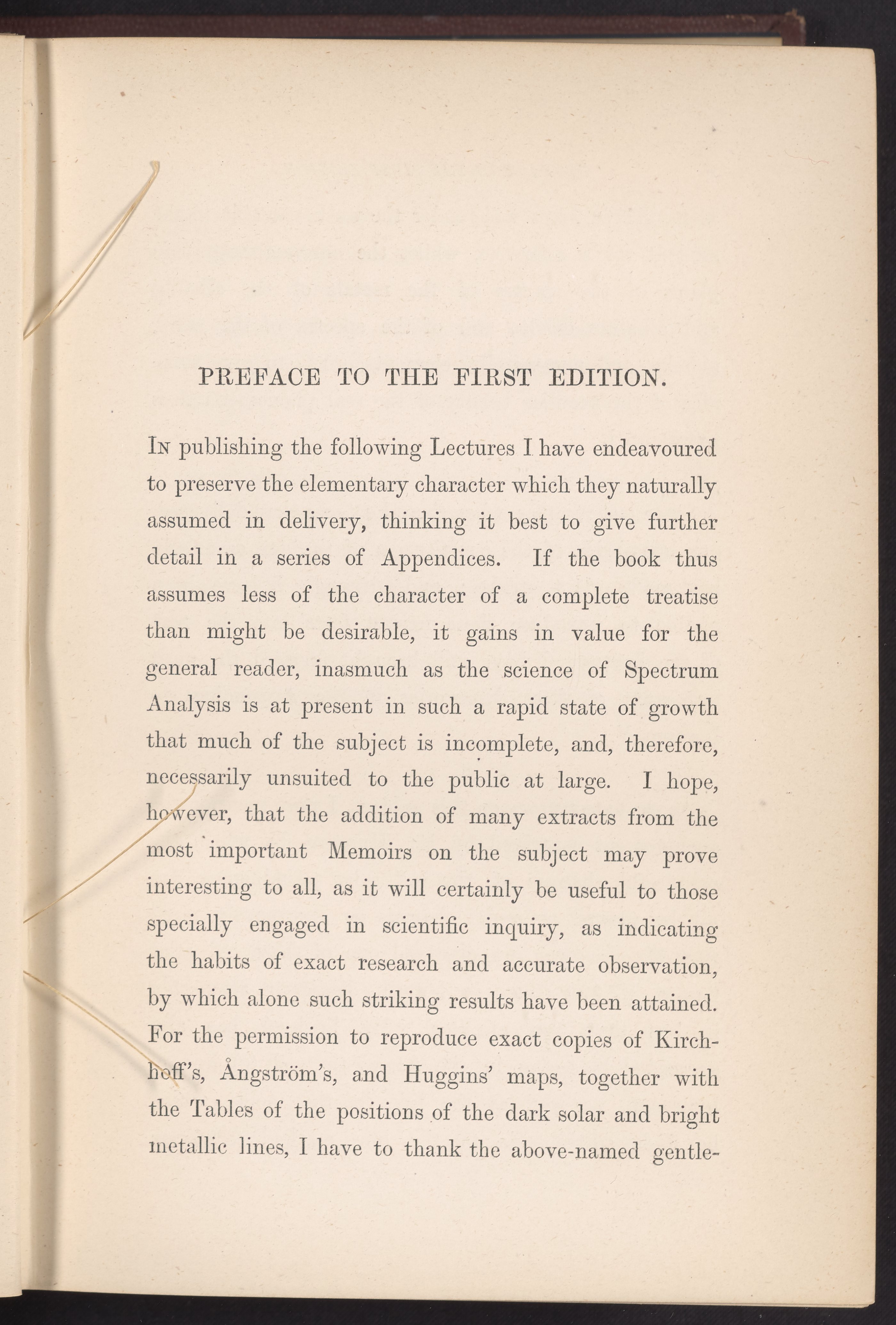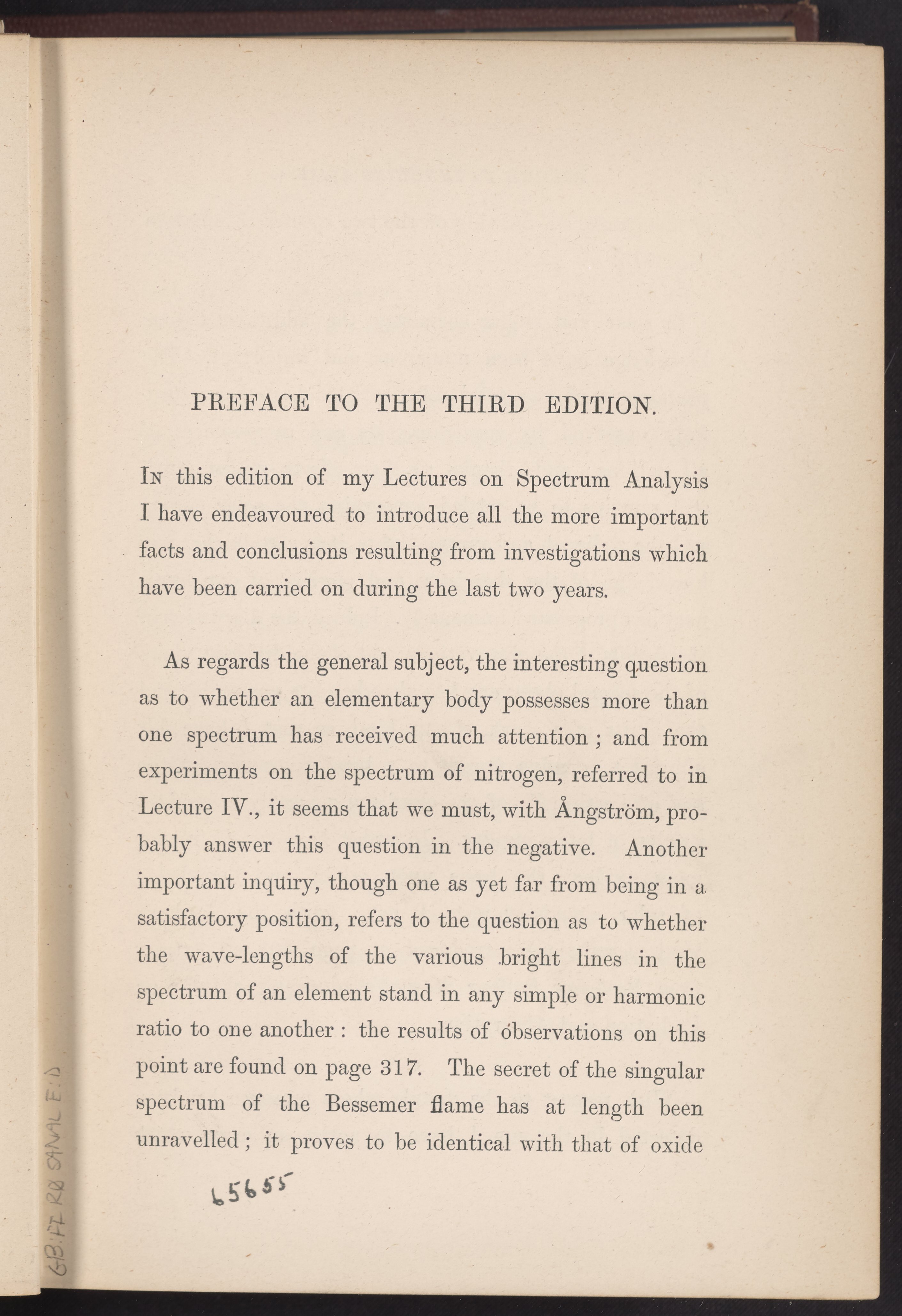 Small JPG1200 x 1573px — 391 KBLarge JPG2880 x 3776px — 1.7 MBFull-sized JPG3188 x 4180px — 2.0 MBOriginal fileTIFF — 3188 x 4180px — 38.2 MBThird edition volume of Spectrum Analysis by Henry Enfield Roscoe (1833-1915) with numerous engravings and colored plates. Roscoe has included a series of six lectures on the subject of spectrum analysis with appendices, for which he hopes these principle memoirs will "prove interesting to all, as it will certainly be useful to those specially engaged in scientific inquiry..." These lectures were delivered in 1868 to the Society of Apothecaries of London, extant today as one of the largest livery companies of the City of London.