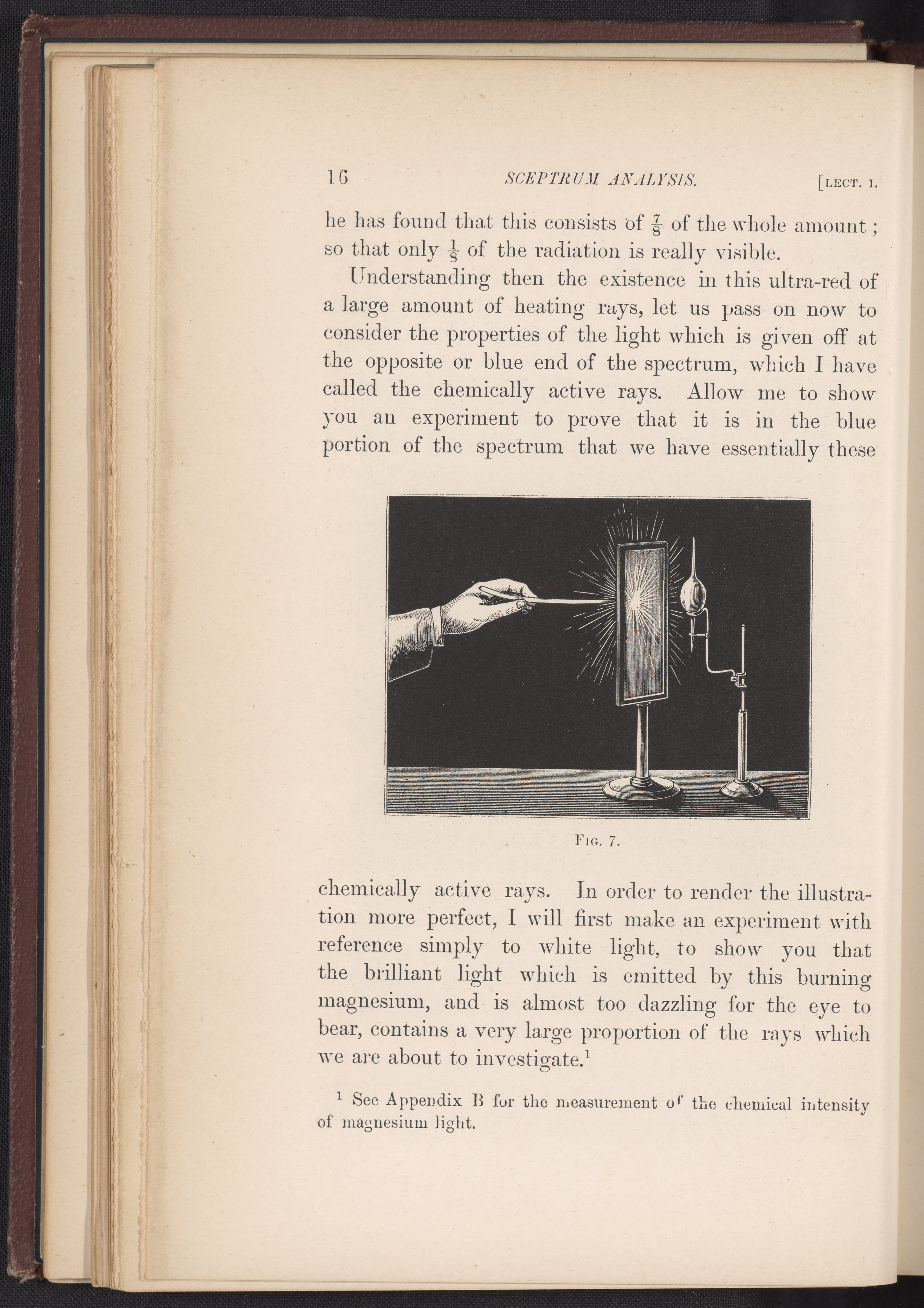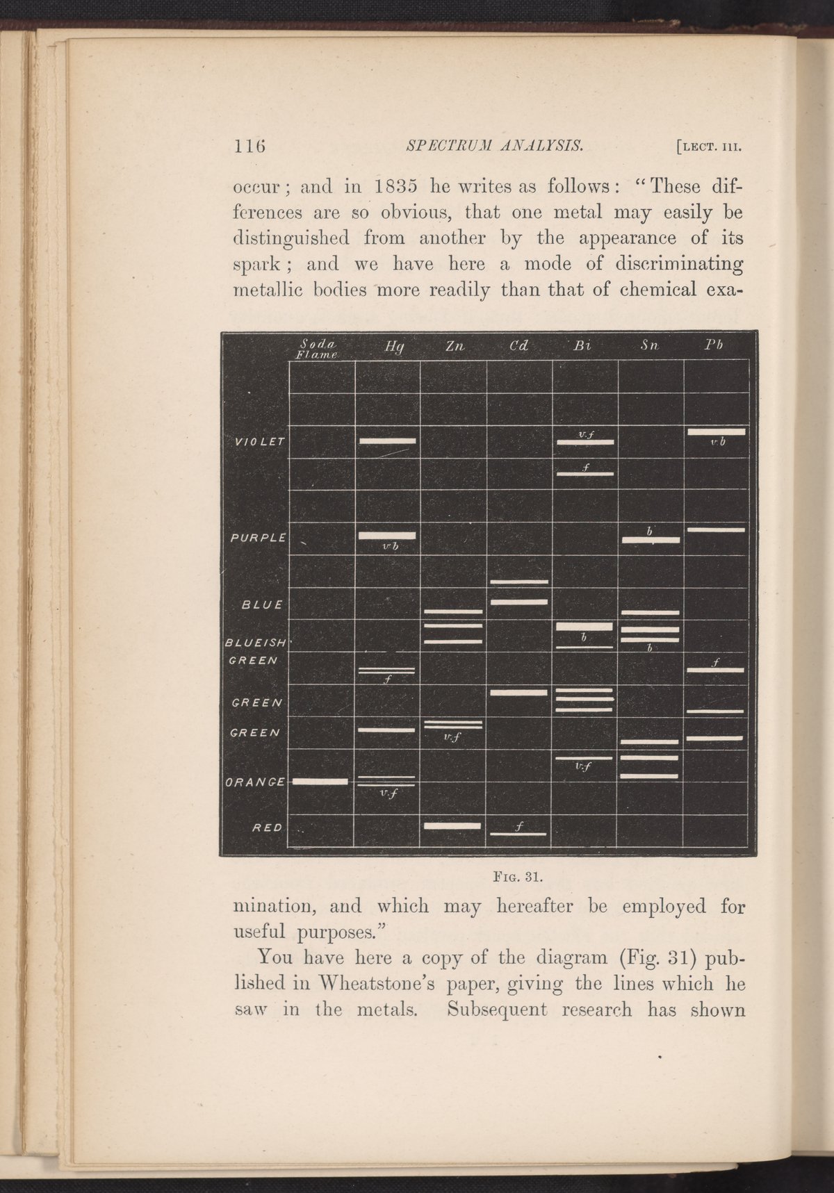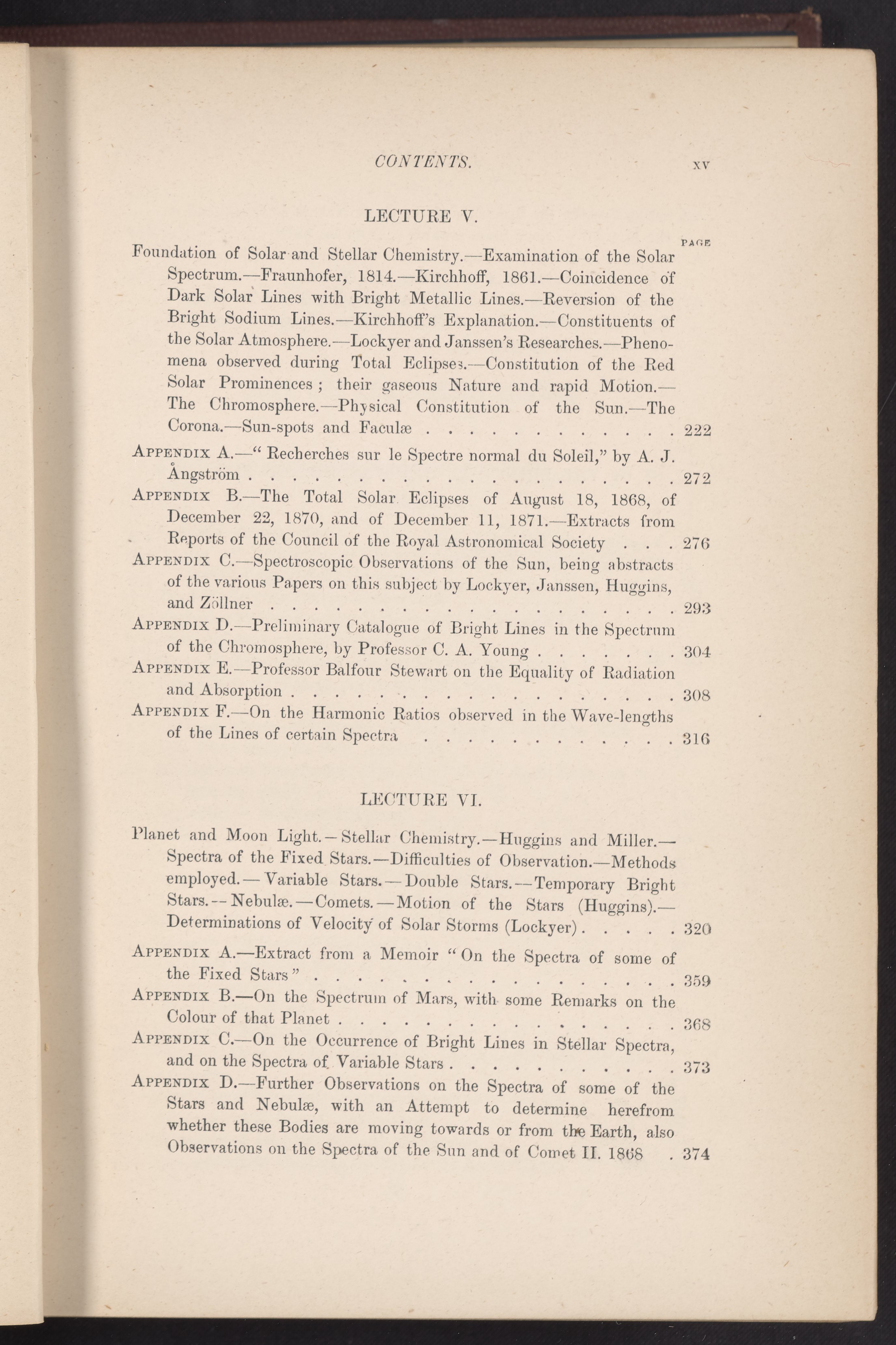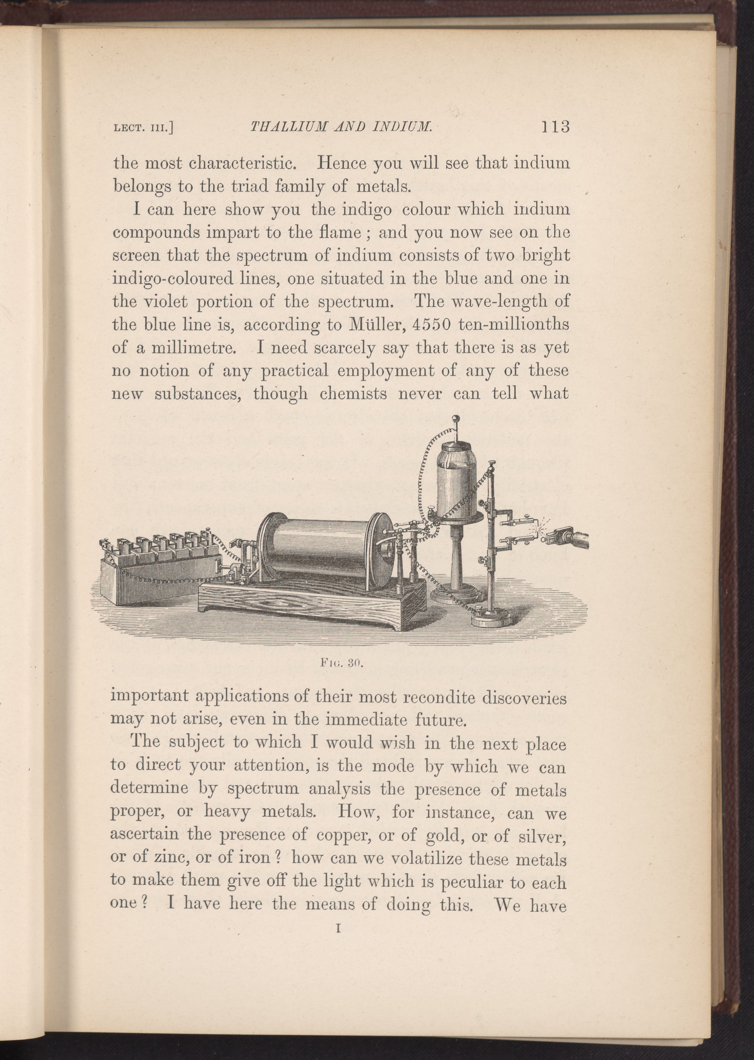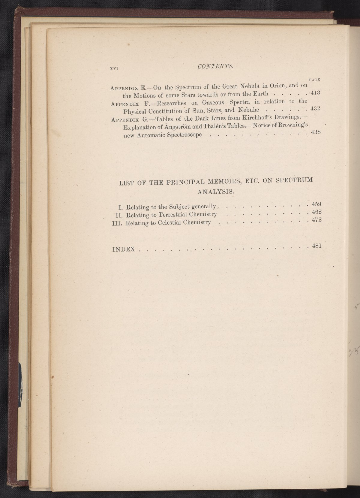 Small JPG1200 x 1573px — 391 KBLarge JPG2880 x 3776px — 1.7 MBFull-sized JPG3188 x 4180px — 2.0 MBOriginal fileTIFF — 3188 x 4180px — 38.2 MBThird edition volume of Spectrum Analysis by Henry Enfield Roscoe (1833-1915) with numerous engravings and colored plates. Roscoe has included a series of six lectures on the subject of spectrum analysis with appendices, for which he hopes these principle memoirs will "prove interesting to all, as it will certainly be useful to those specially engaged in scientific inquiry..." These lectures were delivered in 1868 to the Society of Apothecaries of London, extant today as one of the largest livery companies of the City of London.