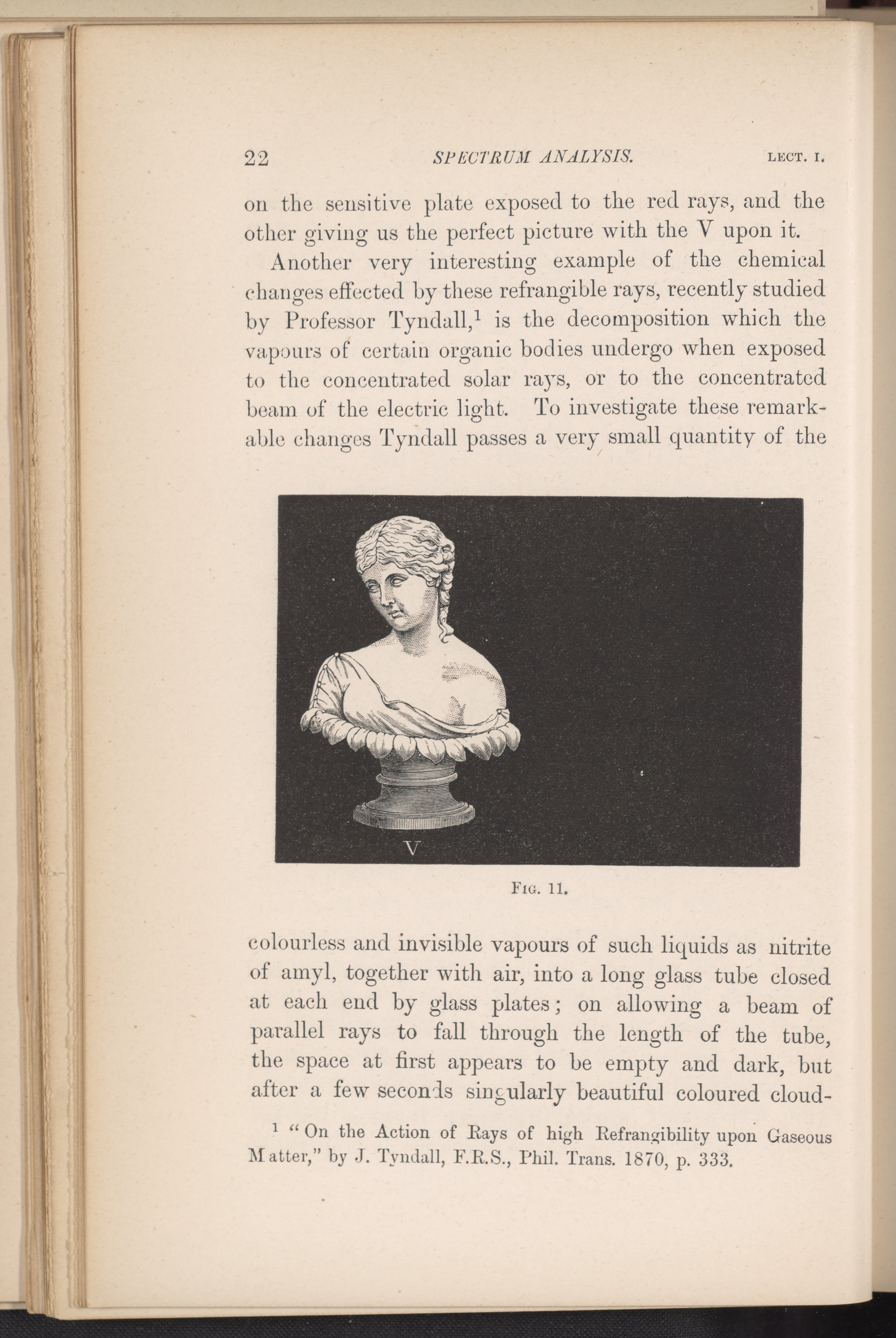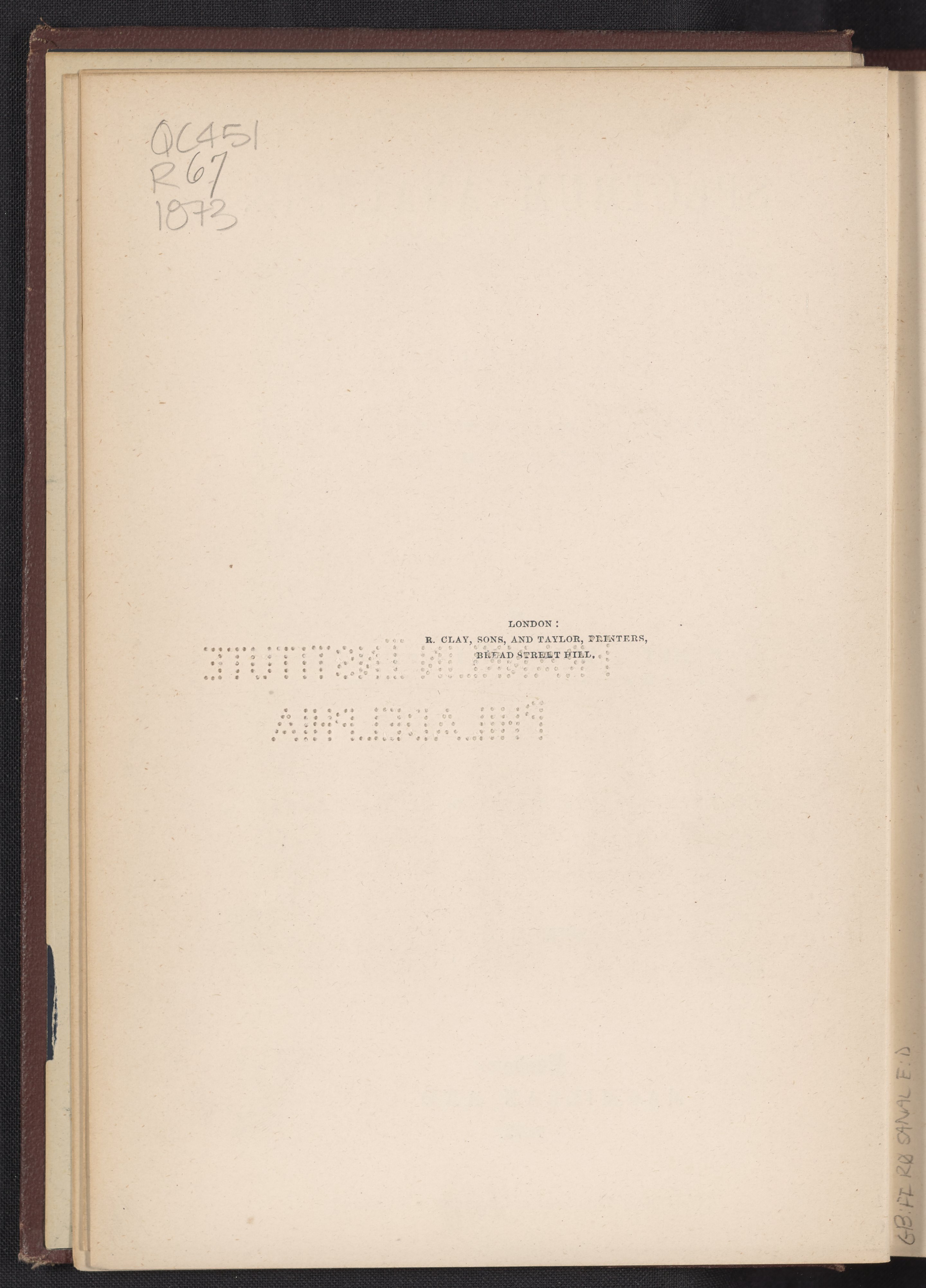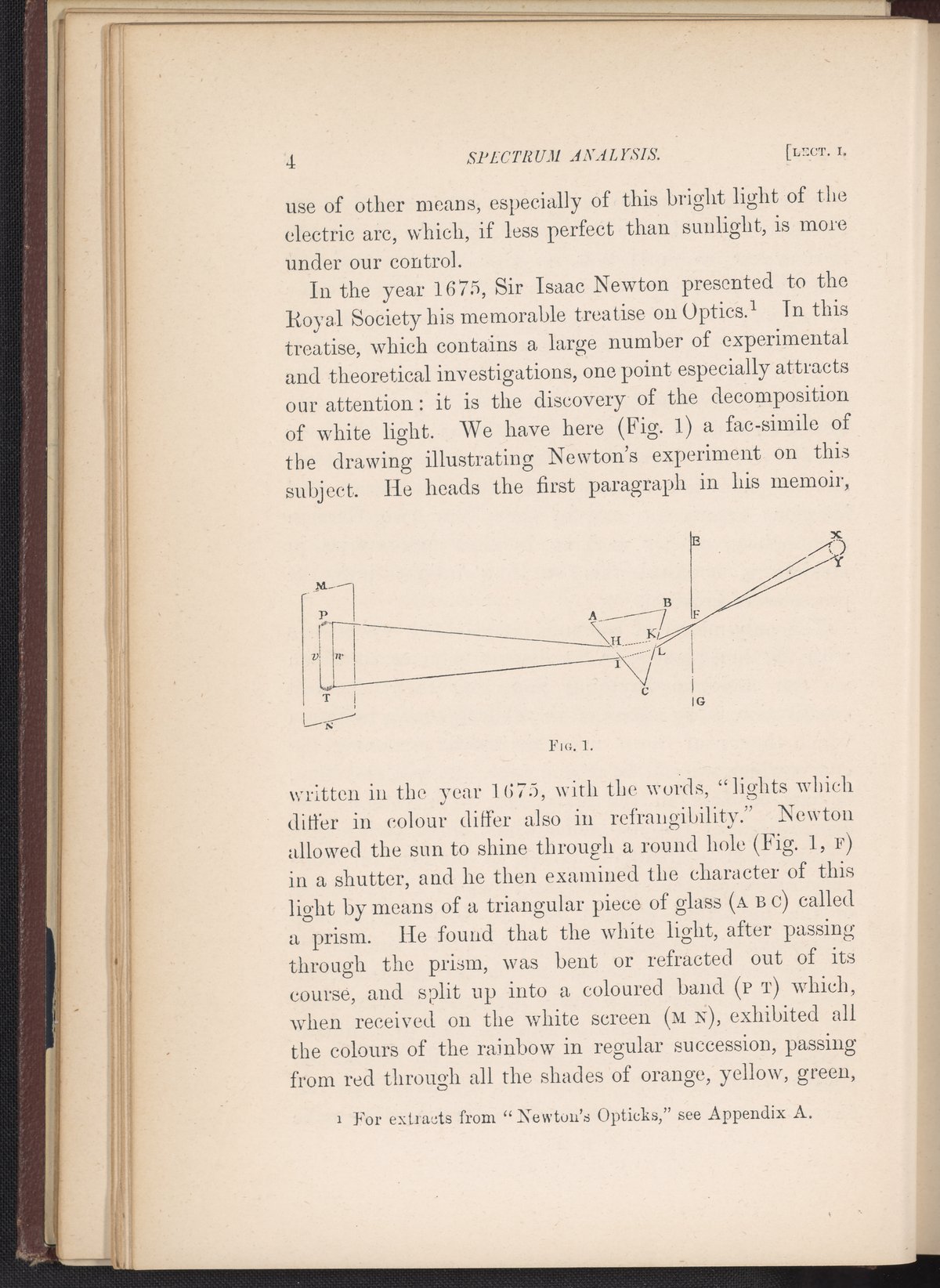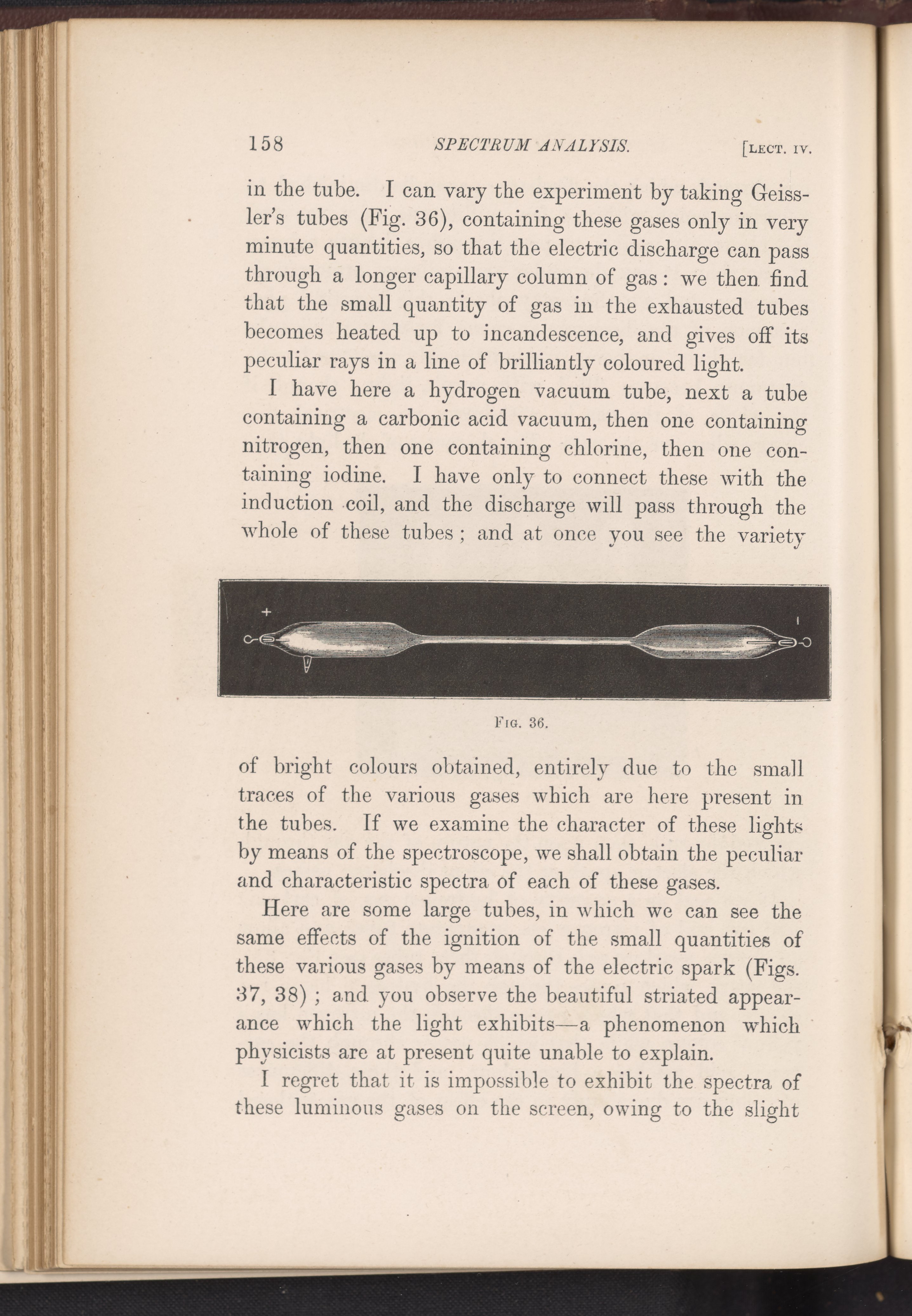 Small JPG1200 x 1573px — 391 KBLarge JPG2880 x 3776px — 1.7 MBFull-sized JPG3188 x 4180px — 2.0 MBOriginal fileTIFF — 3188 x 4180px — 38.2 MBThird edition volume of Spectrum Analysis by Henry Enfield Roscoe (1833-1915) with numerous engravings and colored plates. Roscoe has included a series of six lectures on the subject of spectrum analysis with appendices, for which he hopes these principle memoirs will "prove interesting to all, as it will certainly be useful to those specially engaged in scientific inquiry..." These lectures were delivered in 1868 to the Society of Apothecaries of London, extant today as one of the largest livery companies of the City of London.
