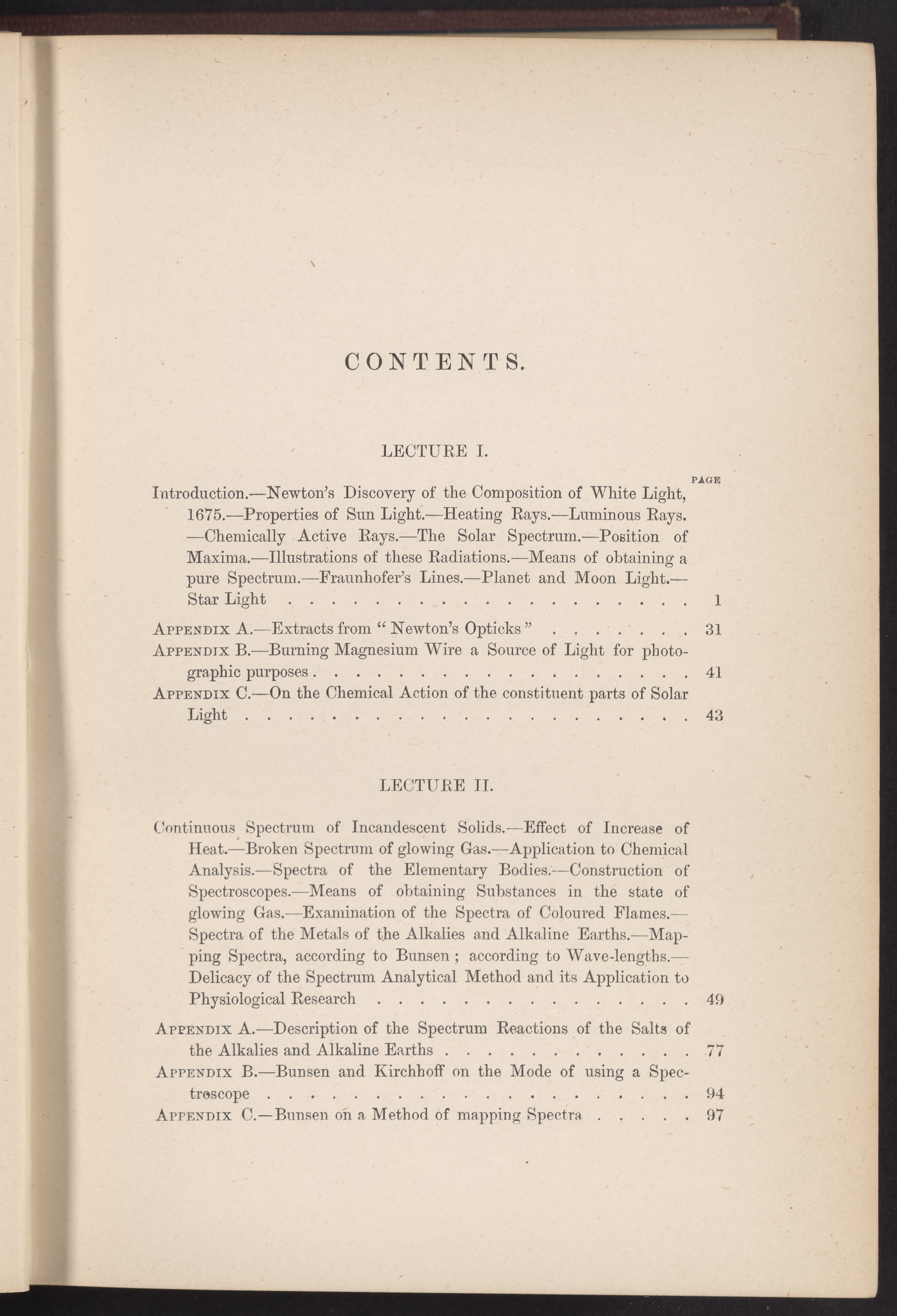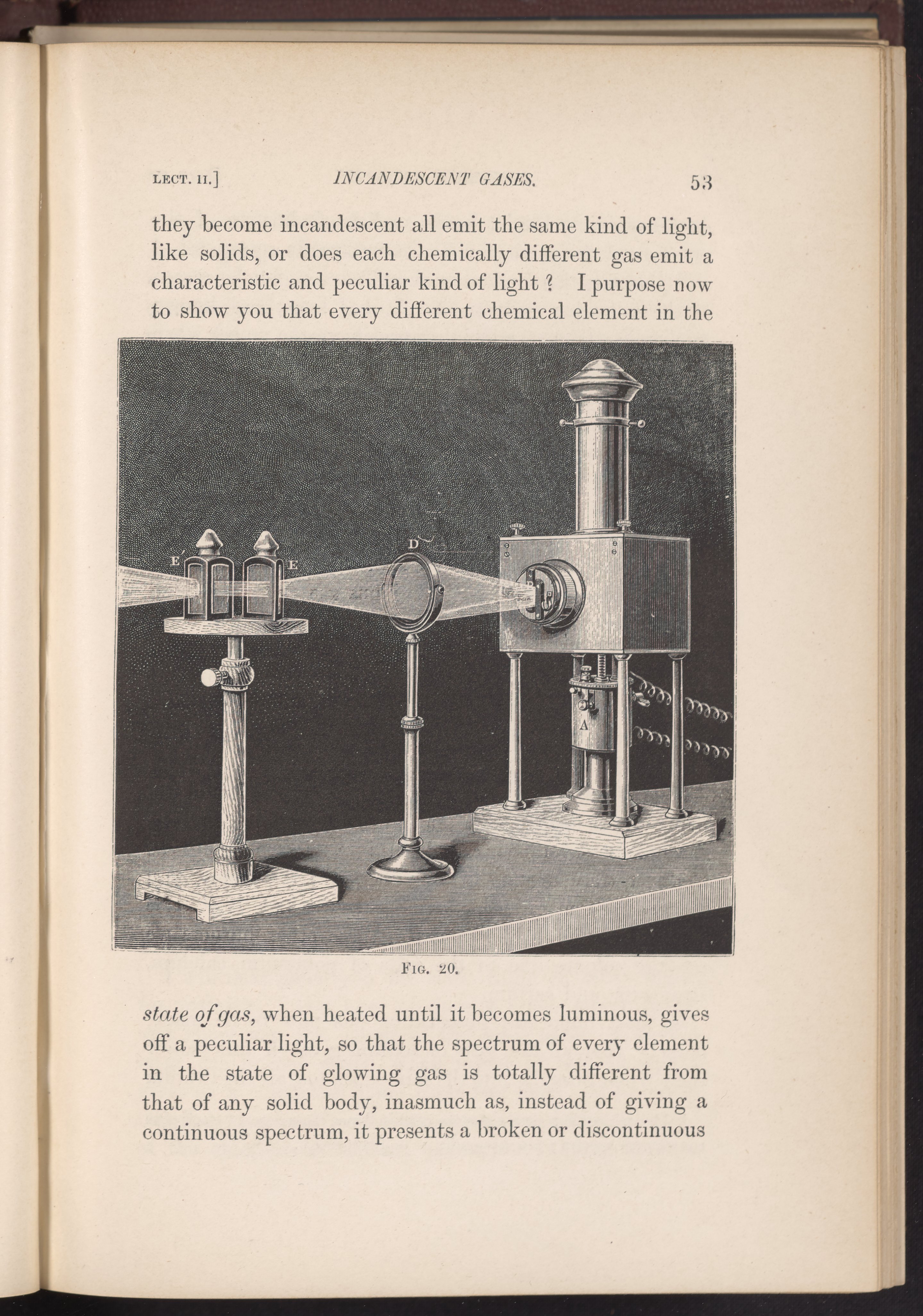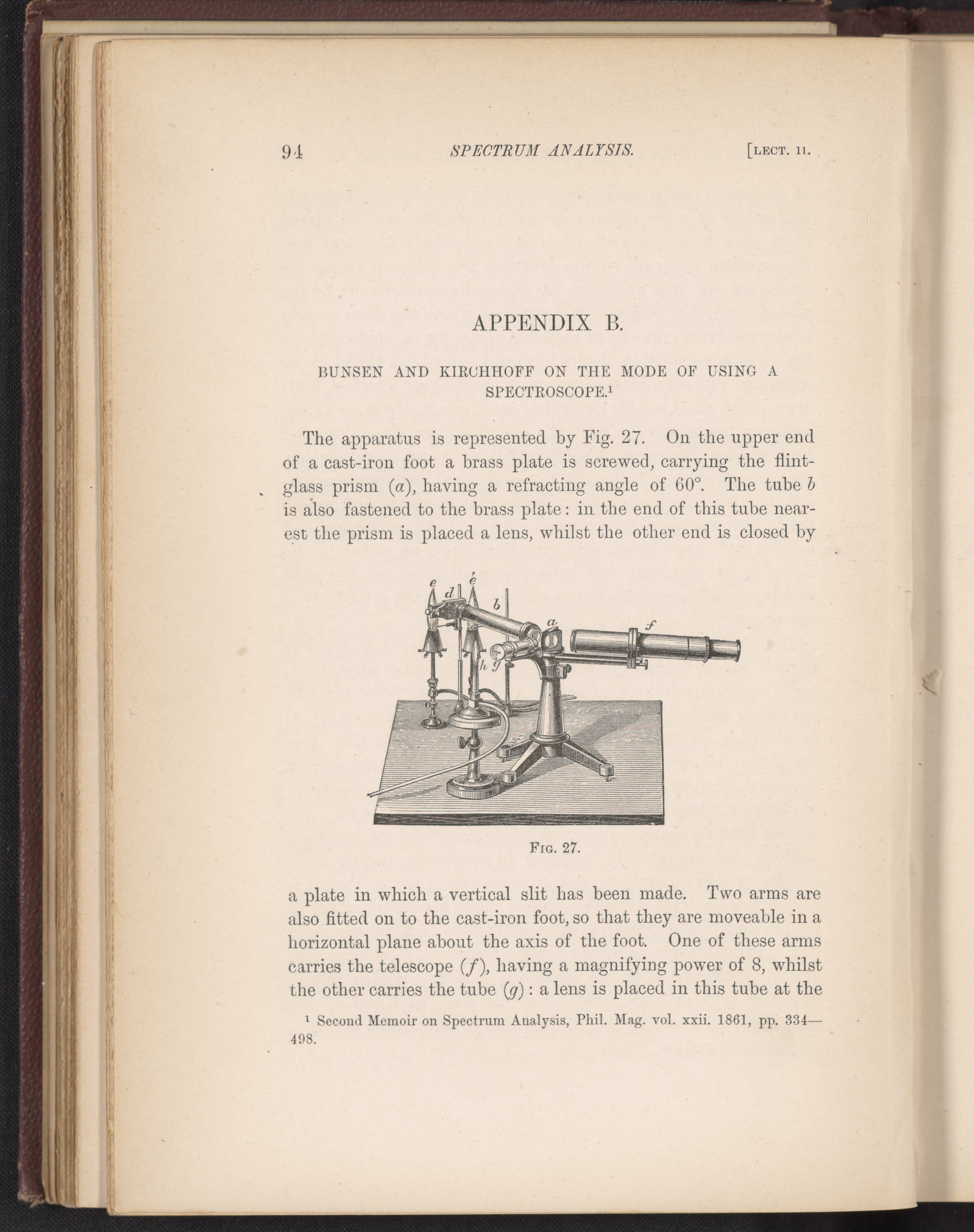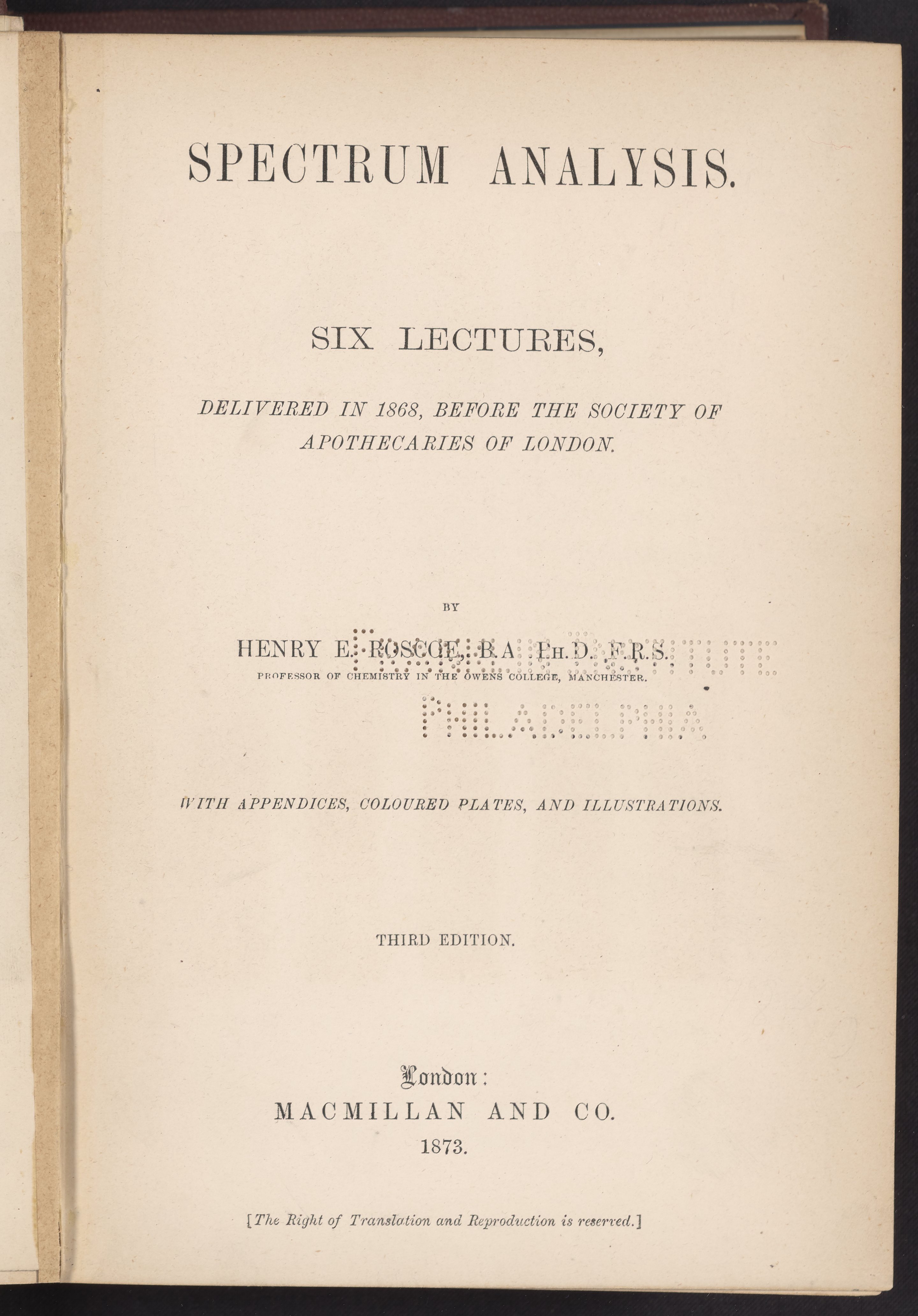 Roscoe, Henry E. (Henry Enfield). “Spectrum Analysis: Six Lectures, Delivered in 1868, Before the Society of Apothecaries of London.” London, England: Macmillan & Co., 1873. QC451 .R673 1873. Science History Institute. Philadelphia. https://digital.sciencehistory.org/works/2fskon7.