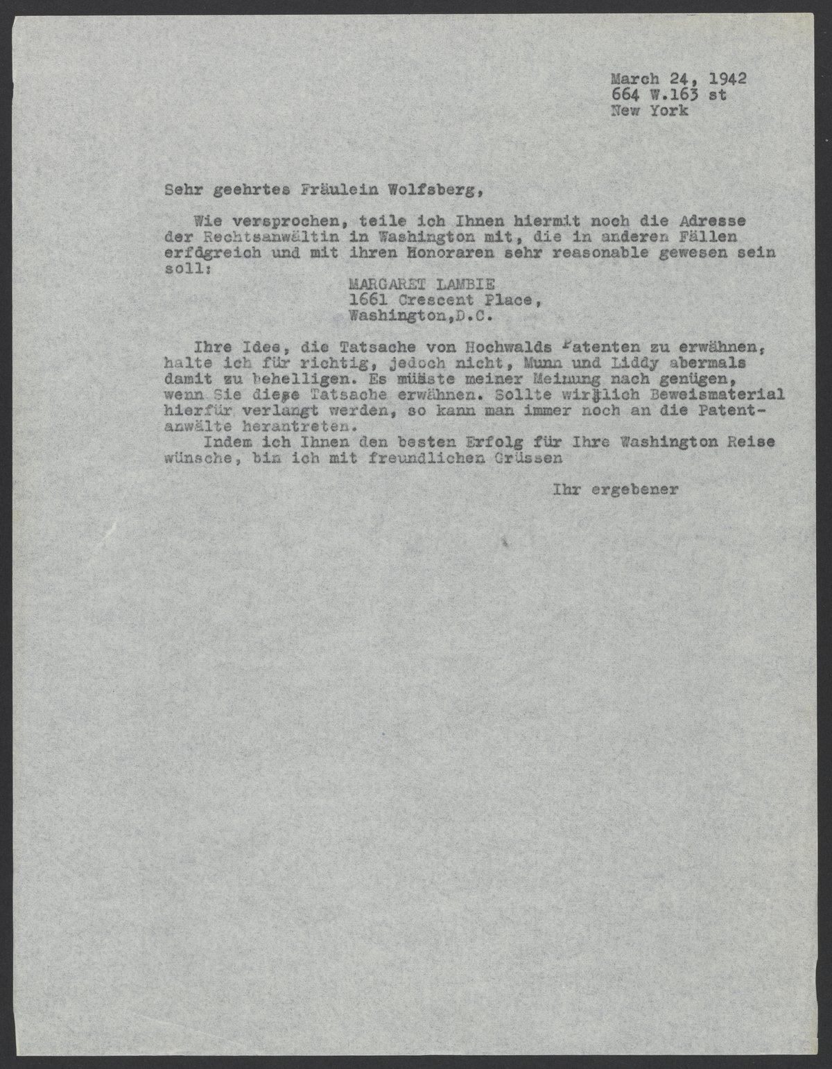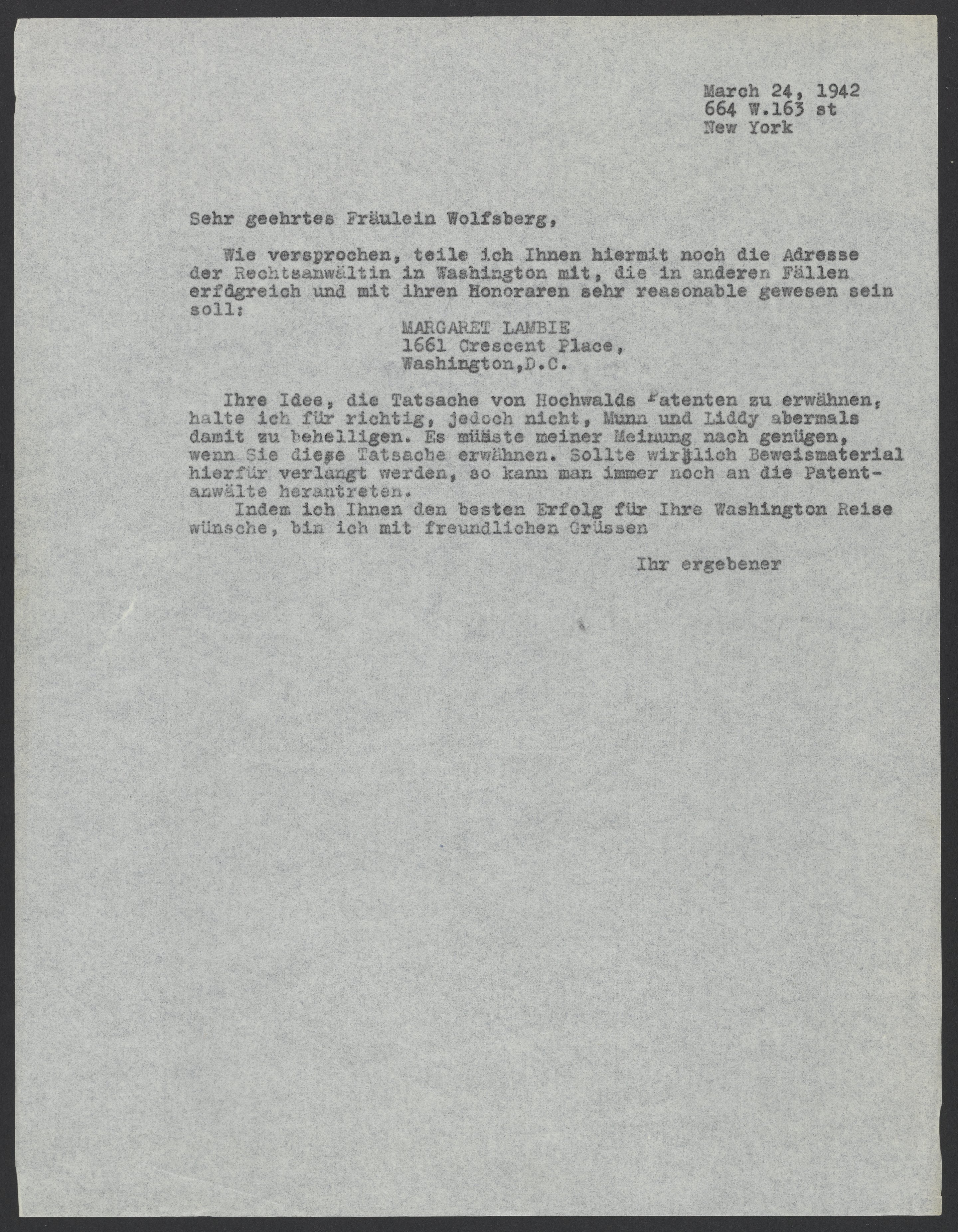 Max Bredig (1902-1977) provides Ilse Wolfsberg with Margaret Lambie's contact information, and advises Wolfsberg against contacting Munn, Anderson, and Liddy, a New York-based law firm, again regarding Fritz Hochwald's (1897-1989) patents.