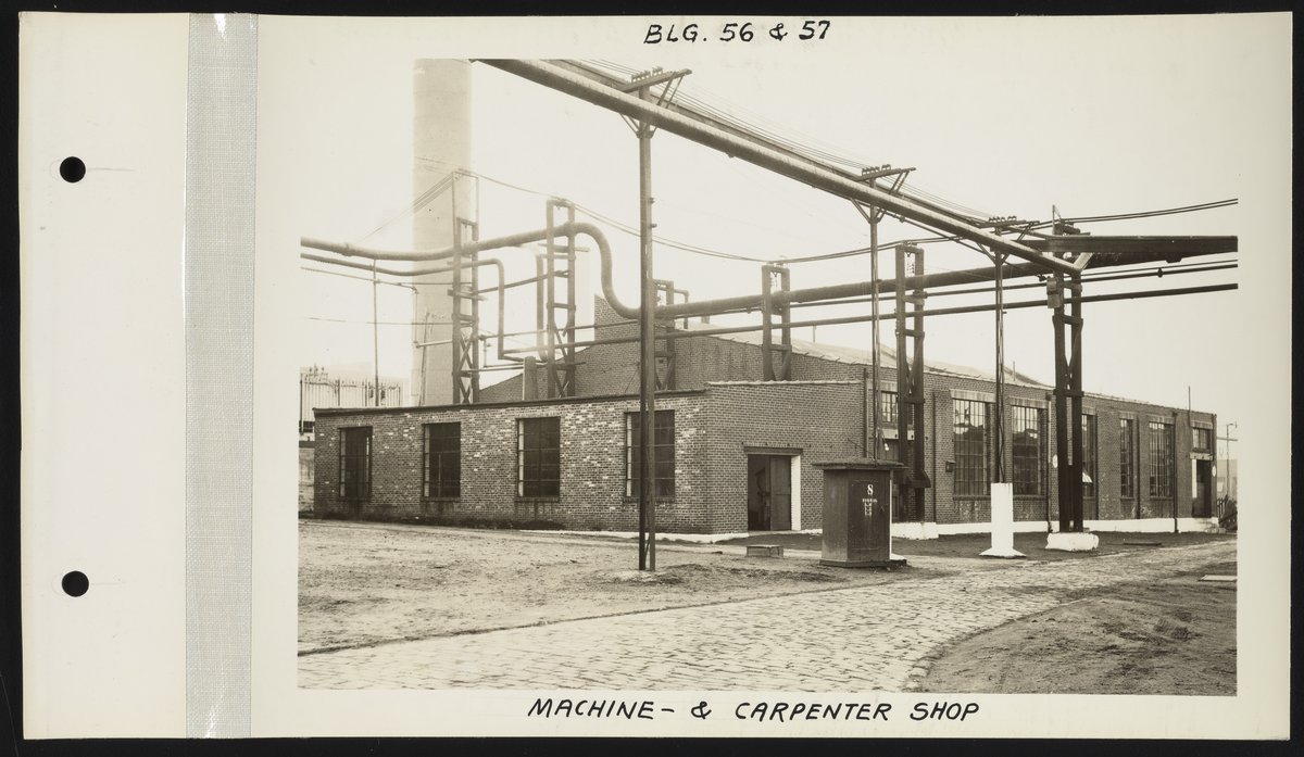 General view of the exterior of the machine (Building 56) and carpenter shops (Building 57) at the Charles Lennig and Company chemical manufacturing plant in Bridesburg, a neighborhood located along the Delaware River in the Northeast section of Philadelphia, Pennsylvania. Charles Lennig and Company operated as a subsidiary of the Rohm and Haas Company, an international chemical company headquartered in Philadelphia, from 1920 to 1947.