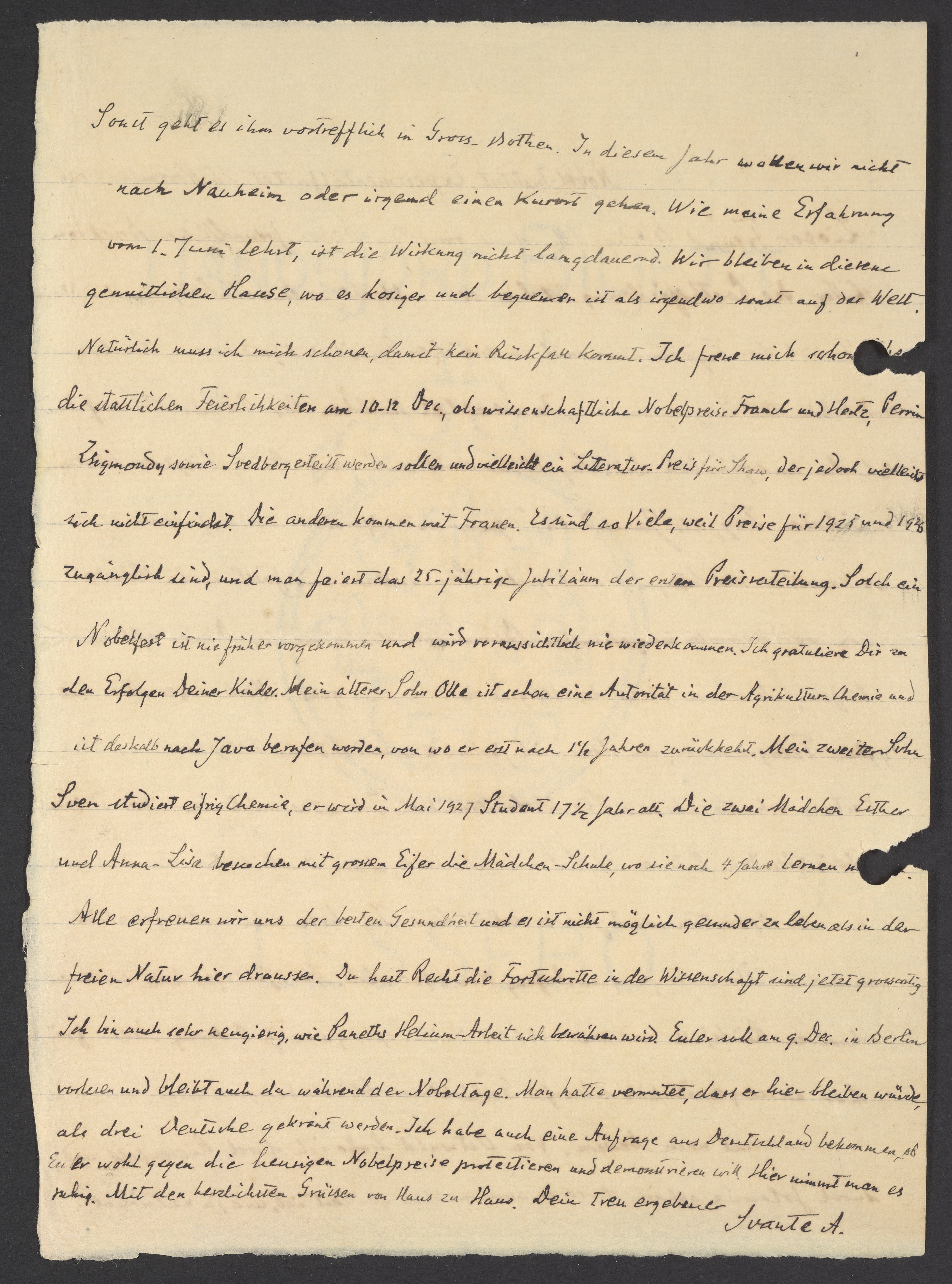 Sonst geht es ihm vortrefflich in Gross- Bothen. In diesem Jahr werden wir nicht nach Nauheim oder irgend einen Kurort gehen. Wie meine Erfahrung vom 1. Juni lehrt, ist die Wirkung nicht langdauernd. Wir bleiben in diesem gemütlichen Hause, wo es kosiger und bequemer ist als irgendwo sonst auf der Welt. Natürlich muss ich mich schonen, damit kein Rückfall kommt. Ich freue mich auf die stattlichen Feierlichkeiten am 10-12 Dec., als wissenschaftliche Nobelpreise Franck und Hertz, Perrin, Zsigmondy sowie Svedberg erteilt werden sollen und vielleicht ein Litteratur-Preis für Shaw, der jedoch vielleicht sich nicht einfindet. Die anderen kommen mit Frauen. Es sind so viele, weil Preise für 1925 und 1926 zugänglich sind, und man feiert das 25-jährige Jubiläum der ersten Preiserteilung. Solch ein Nobelfest ist nie früher vorgekommen und wird voraussichtlich nie wiederkommen. Ich gratuliere Dir zu den Erfolgen Deiner Kinder. Mein älterer Sohn Olle ist schon eine Autorität in der Agrikultur-Chemie und ist deshalb nach Java berufen worden, von wo er erst nach 1 ½ Jahren zurückkehrt. Mein zweiter Sohn Sven studiert eifrig Chemie, er wird im Mai 1927 Student 17 ½ Jahr alt. Die zwei Mädchen Esther und Anna-Lisa besuchen mit grossen Eifer die Mädchen-Schule, wie sie noch 4 Jahre lernen [werden]. Alle erfreuen wir uns der besten Gesundheit und es ist nicht möglich gesunder zu leben als in der freien Natur hier draussen. Du hast Recht die Fortschritte in der Wissenschaft sind jetzt grossartig. Ich bin auch sehr neugierig, wie Paneths Helium-Arbeit sich bewähren wird. Euler soll am 9. Dec. in Berlin vorlesen und bleibt auch da während der Nobeltage. Man hatte vermutet, dass er hier bleiben würde, als drei Deutsche gekrönt werden. Ich habe auch eine Anfrage aus Deutschland bekommen ob Euler wohl gegen die heutigen Nobelpreise protestieren und demonstrieren will. Hier nimmt man es ruhig. Mit den herzlichsten Grüssen von Haus zu Haus. Dein treu ergebener Svante A.