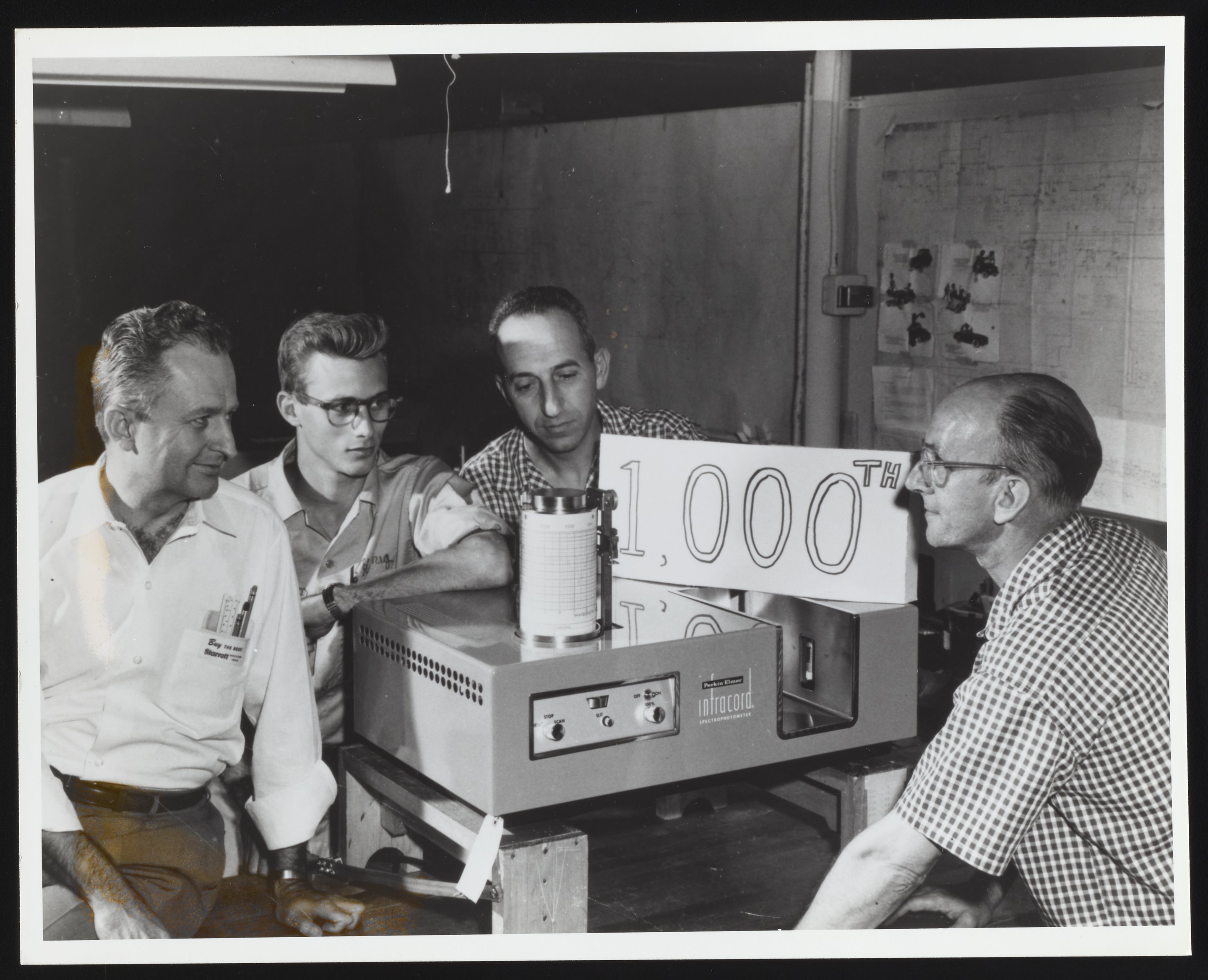 Group photograph of four unidentified individuals posed around a Perkin-Elmer Model 137 Infracord Spectrophotometer. A hand-written sign reading "1,000th" is mounted on top of the instrument, suggesting that this spectrophotometer may have been the 1,000th manufactured or sold by Perkin-Elmer.