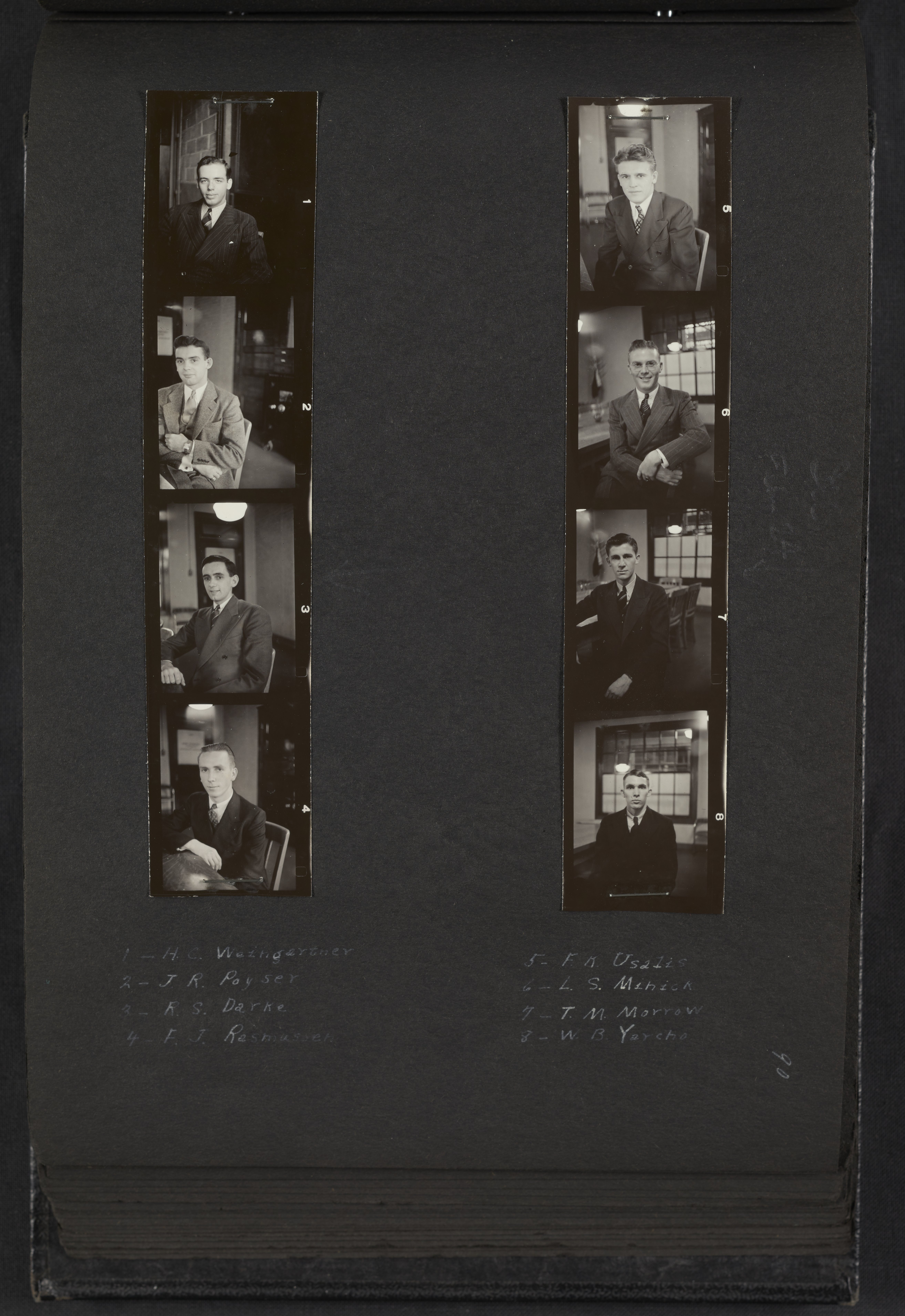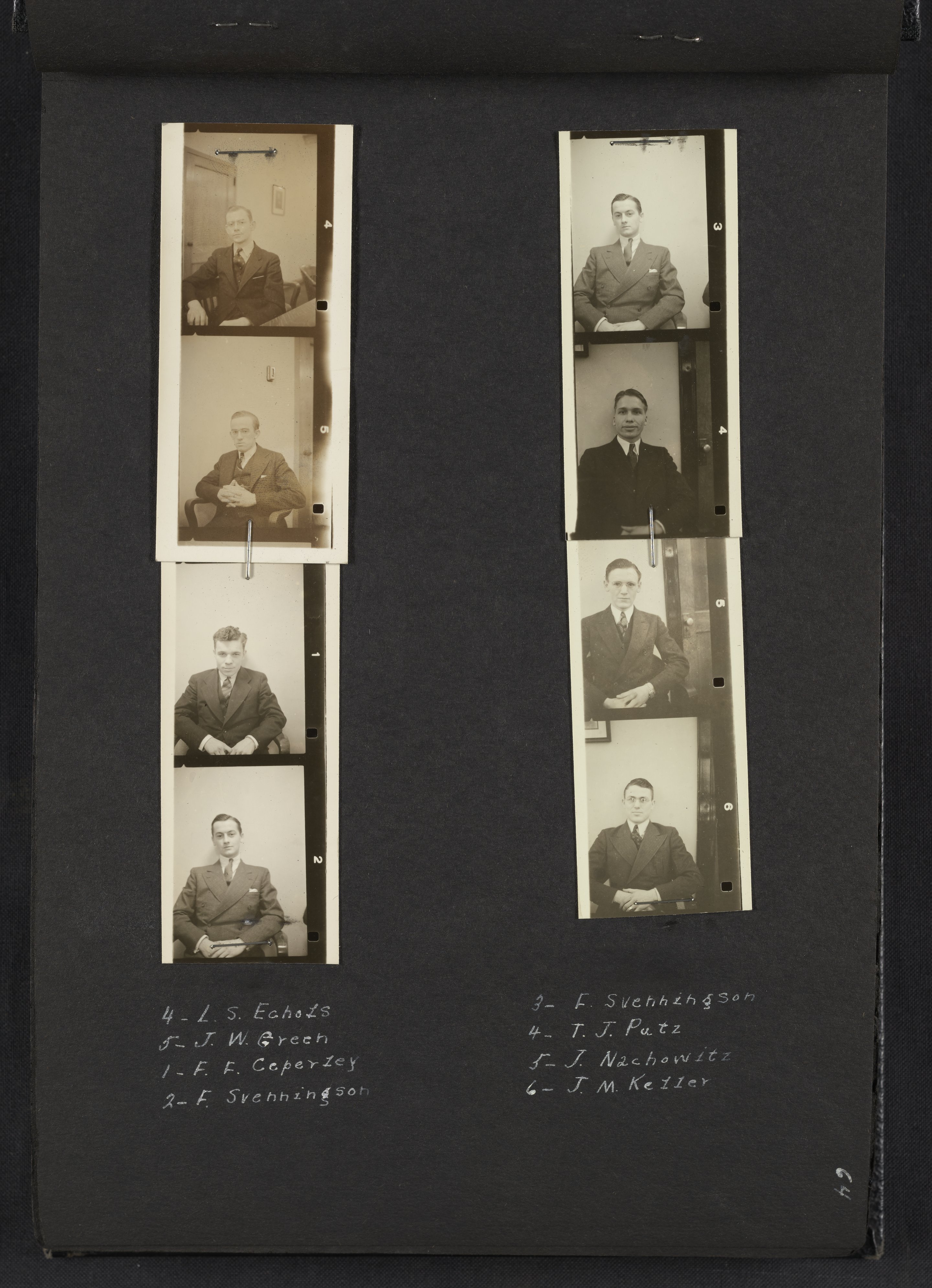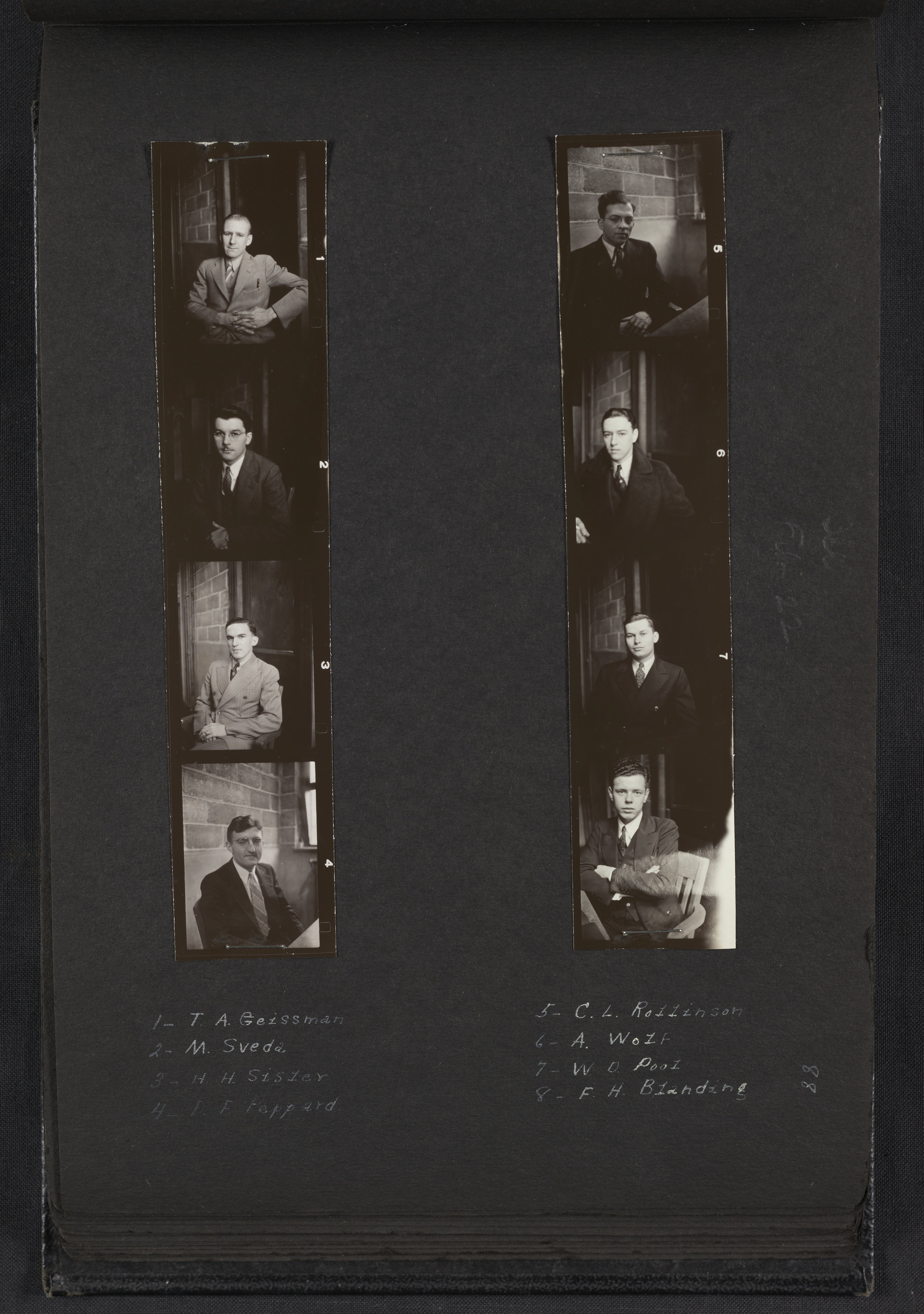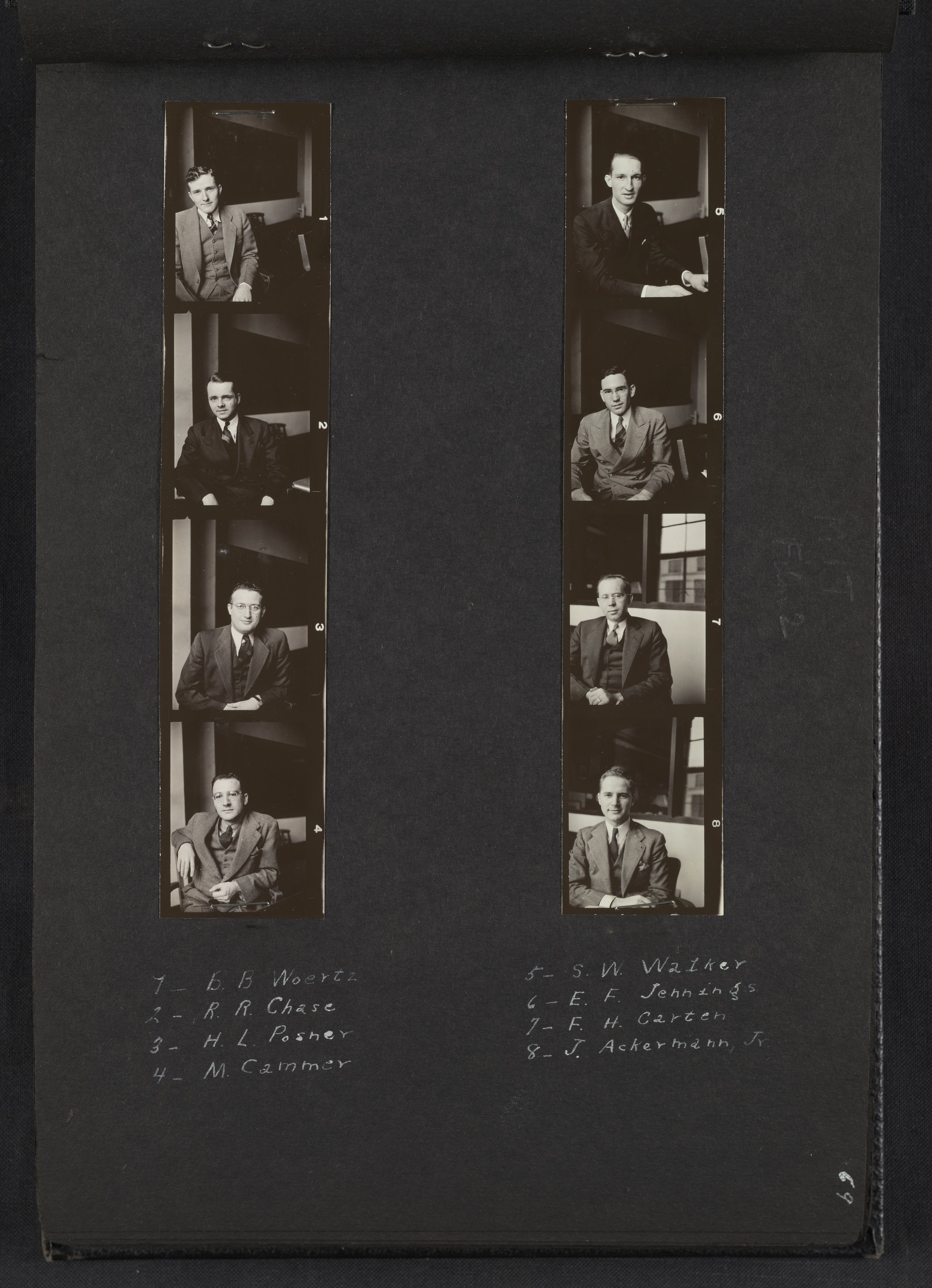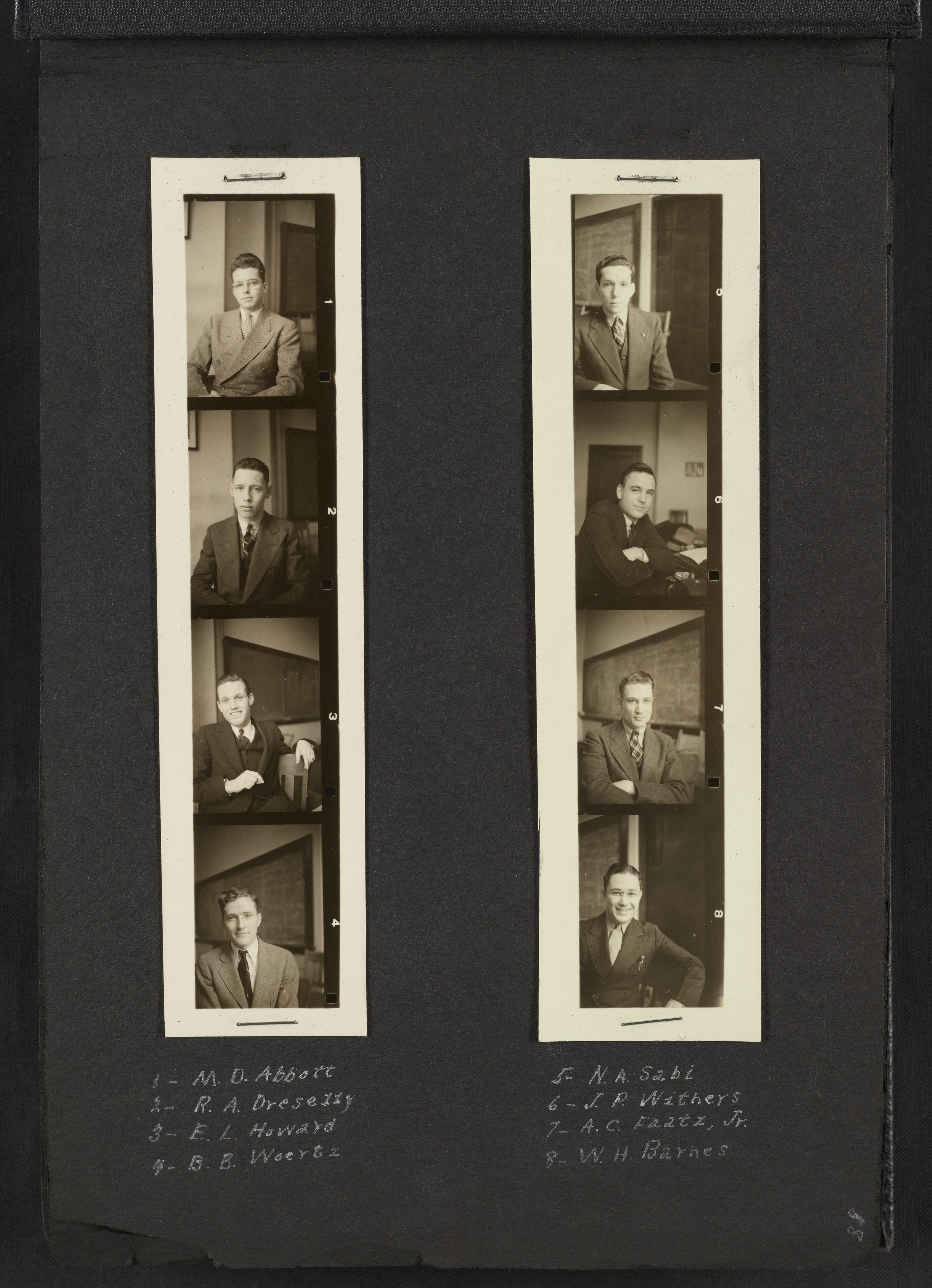 Small JPG1200 x 774px — 253 KBLarge JPG2880 x 1857px — 1.3 MBFull-sized JPG8122 x 5238px — 8.2 MBOriginal fileTIFF — 8122 x 5238px — 122 MBPhotographic album containing approximately 440 black and white portraits of new members of the American Chemical Society for the years 1938-1939. The names and institutional affiliation of each individual are inscribed on the album page. The portraits are grouped by institutional affiliation, including members from Yale, Princeton, Cornell, MIT, Ohio State University, and Purdue.