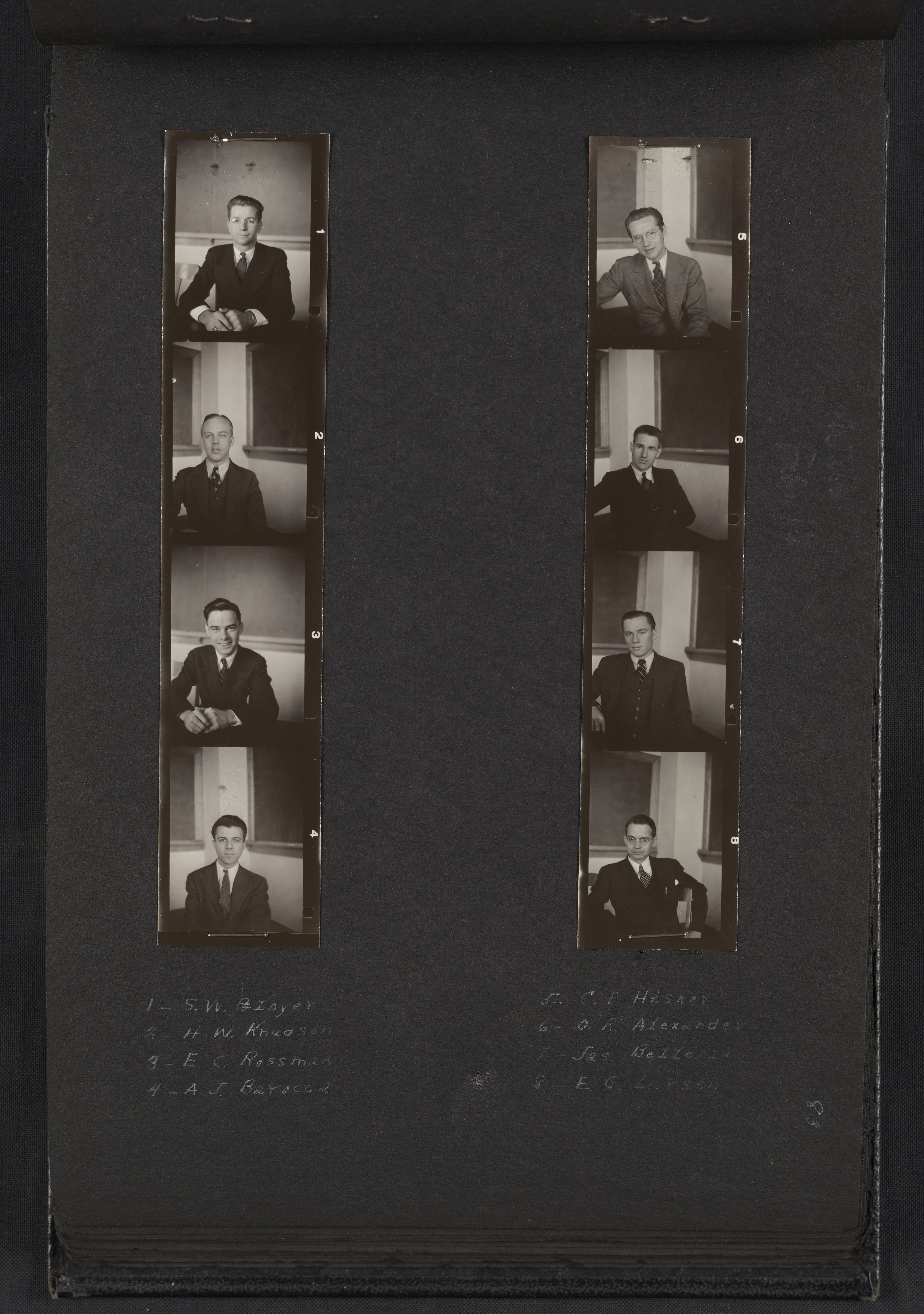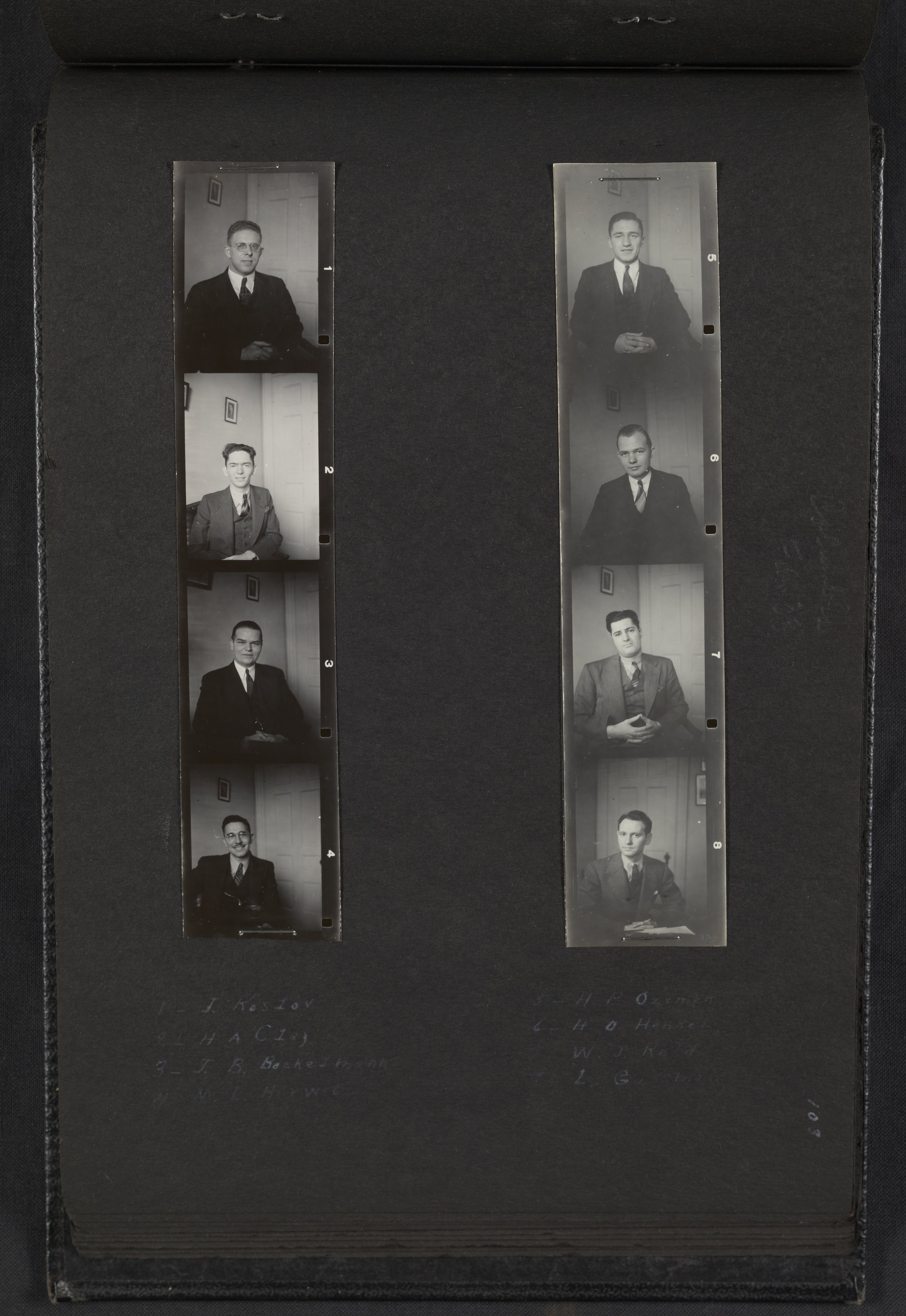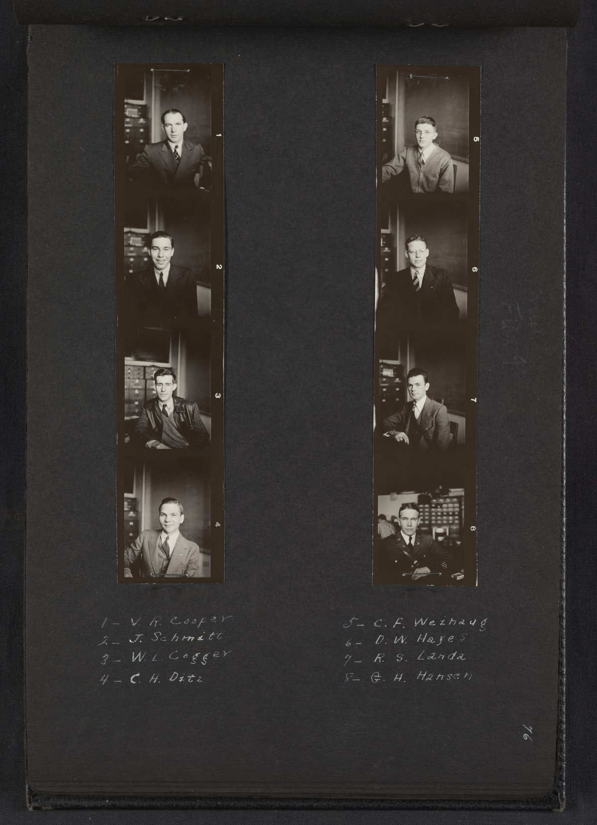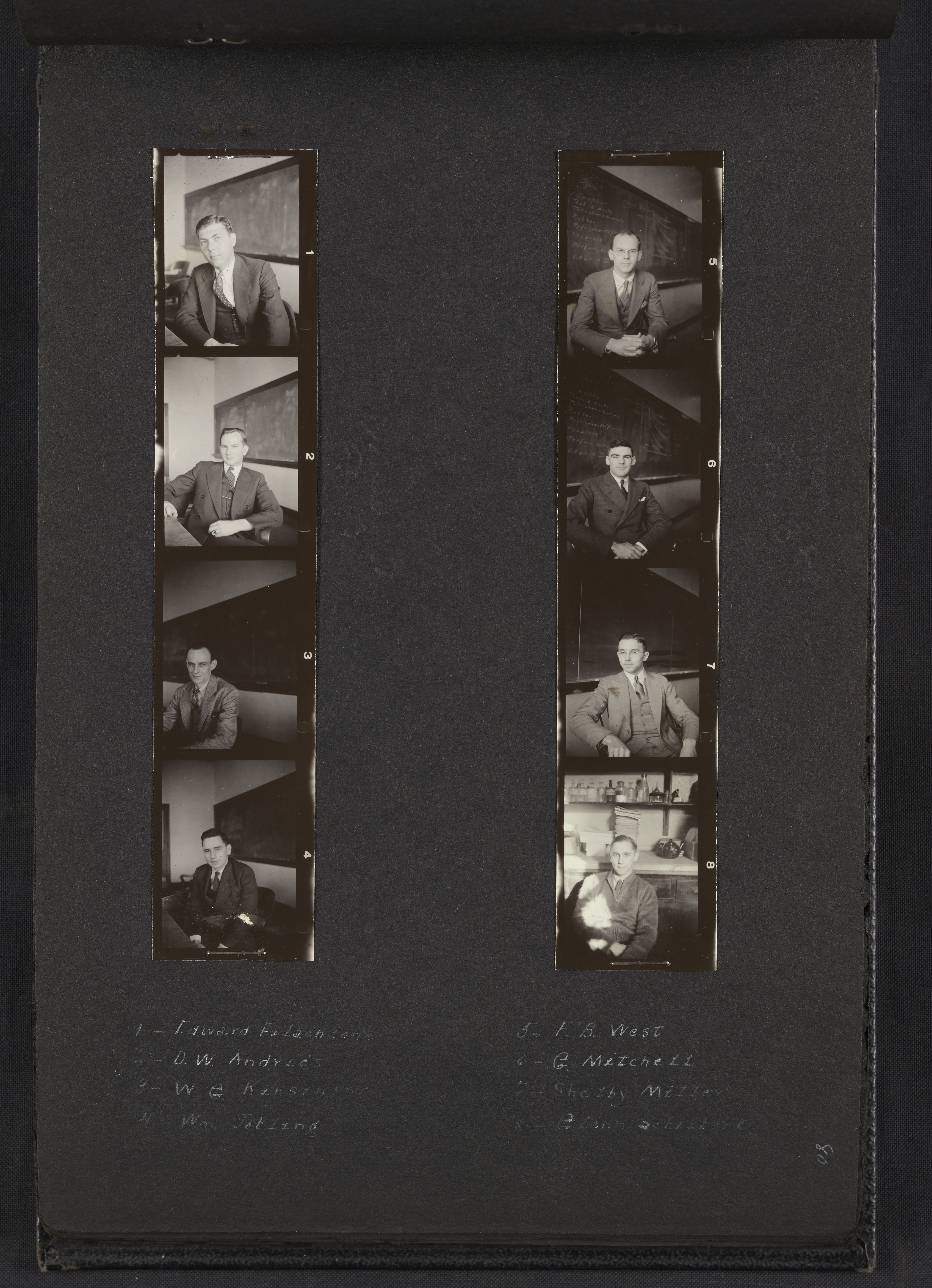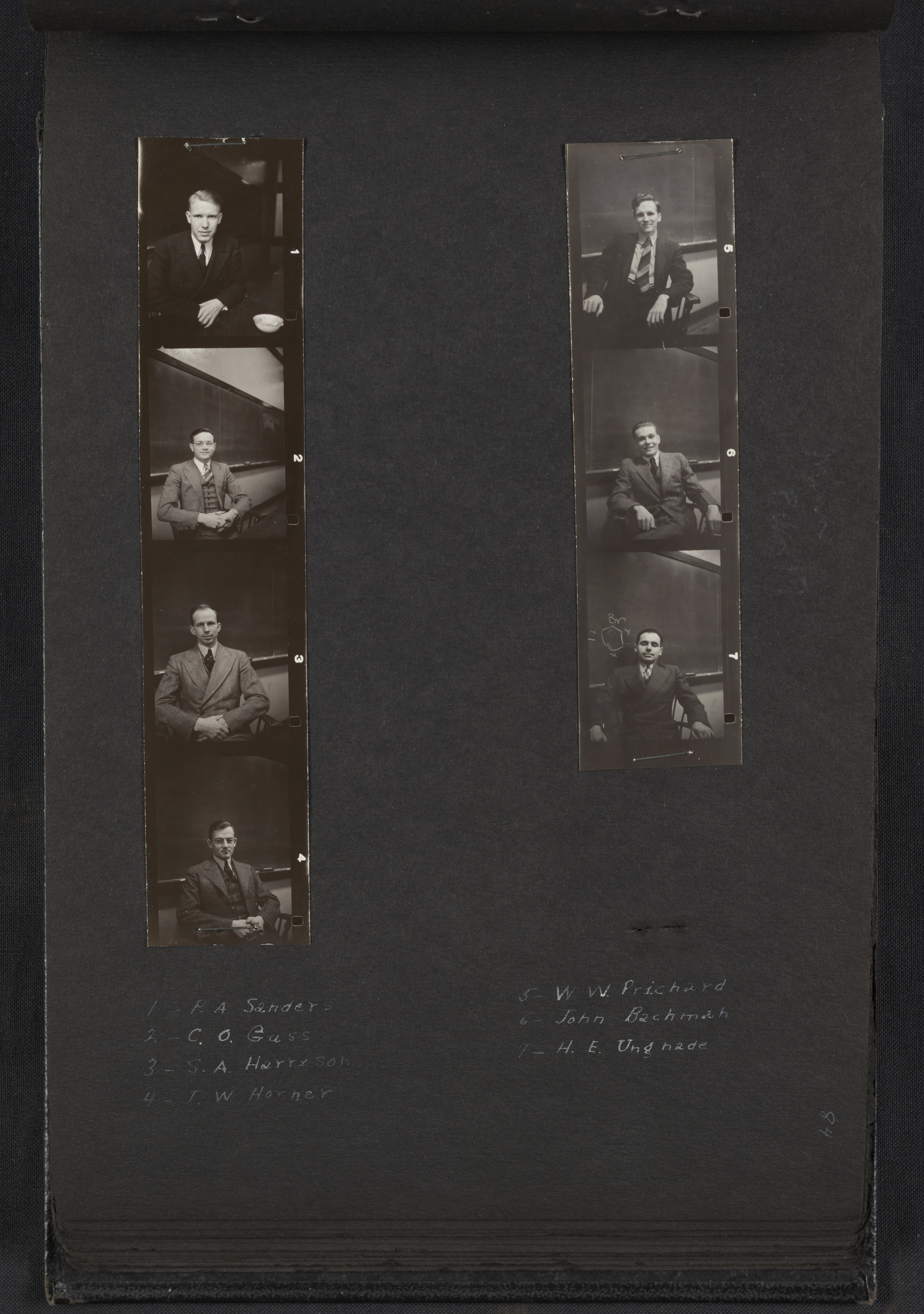 Small JPG1200 x 774px — 253 KBLarge JPG2880 x 1857px — 1.3 MBFull-sized JPG8122 x 5238px — 8.2 MBOriginal fileTIFF — 8122 x 5238px — 122 MBPhotographic album containing approximately 440 black and white portraits of new members of the American Chemical Society for the years 1938-1939. The names and institutional affiliation of each individual are inscribed on the album page. The portraits are grouped by institutional affiliation, including members from Yale, Princeton, Cornell, MIT, Ohio State University, and Purdue.