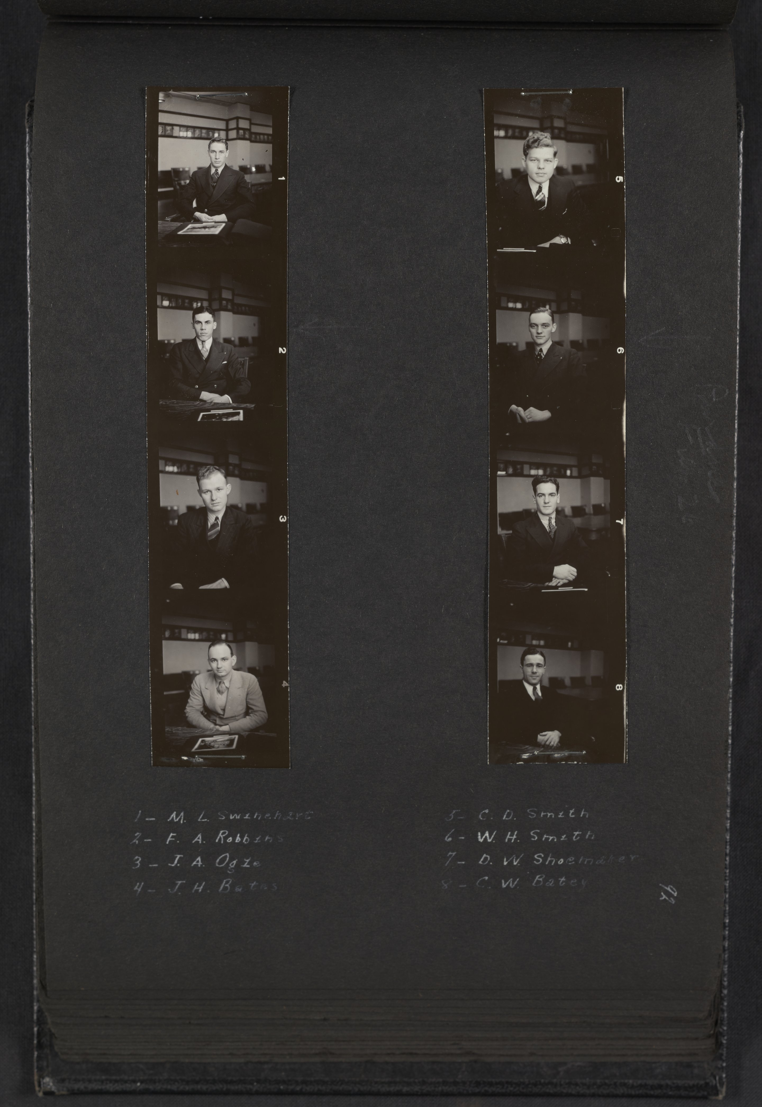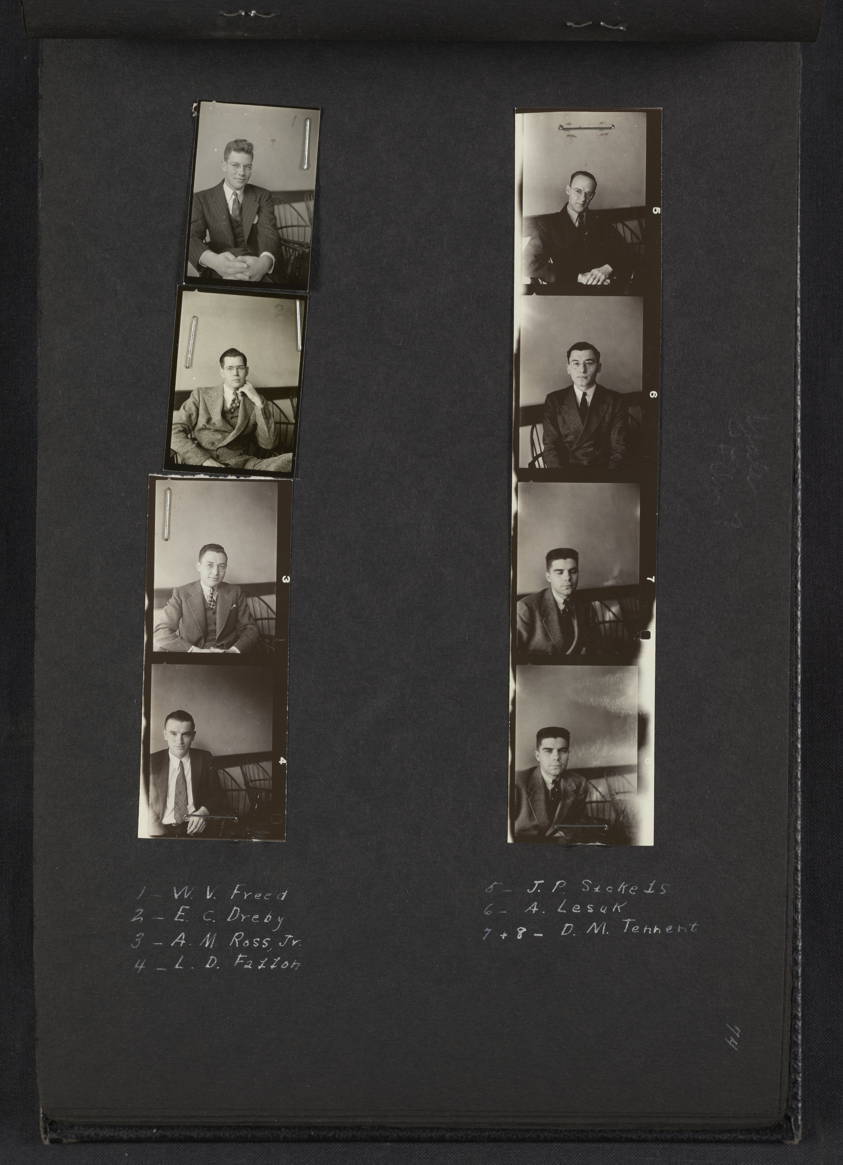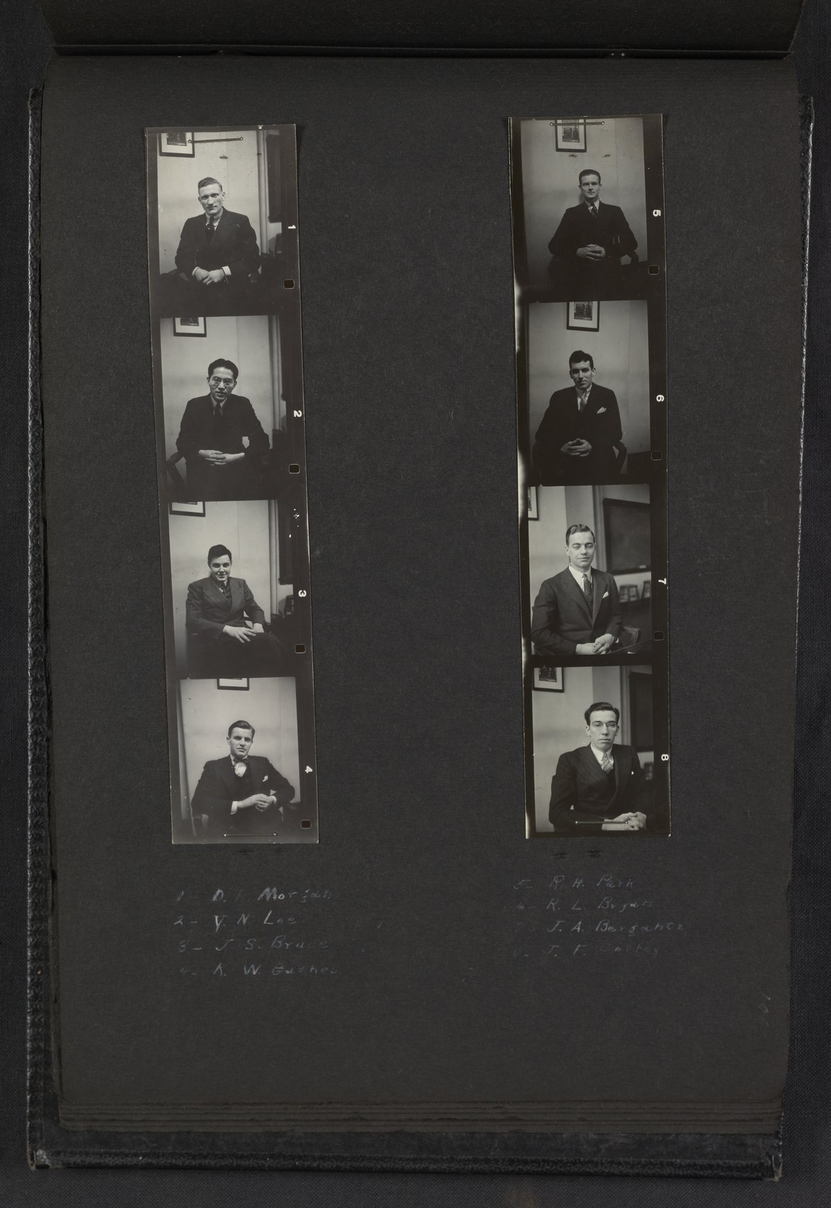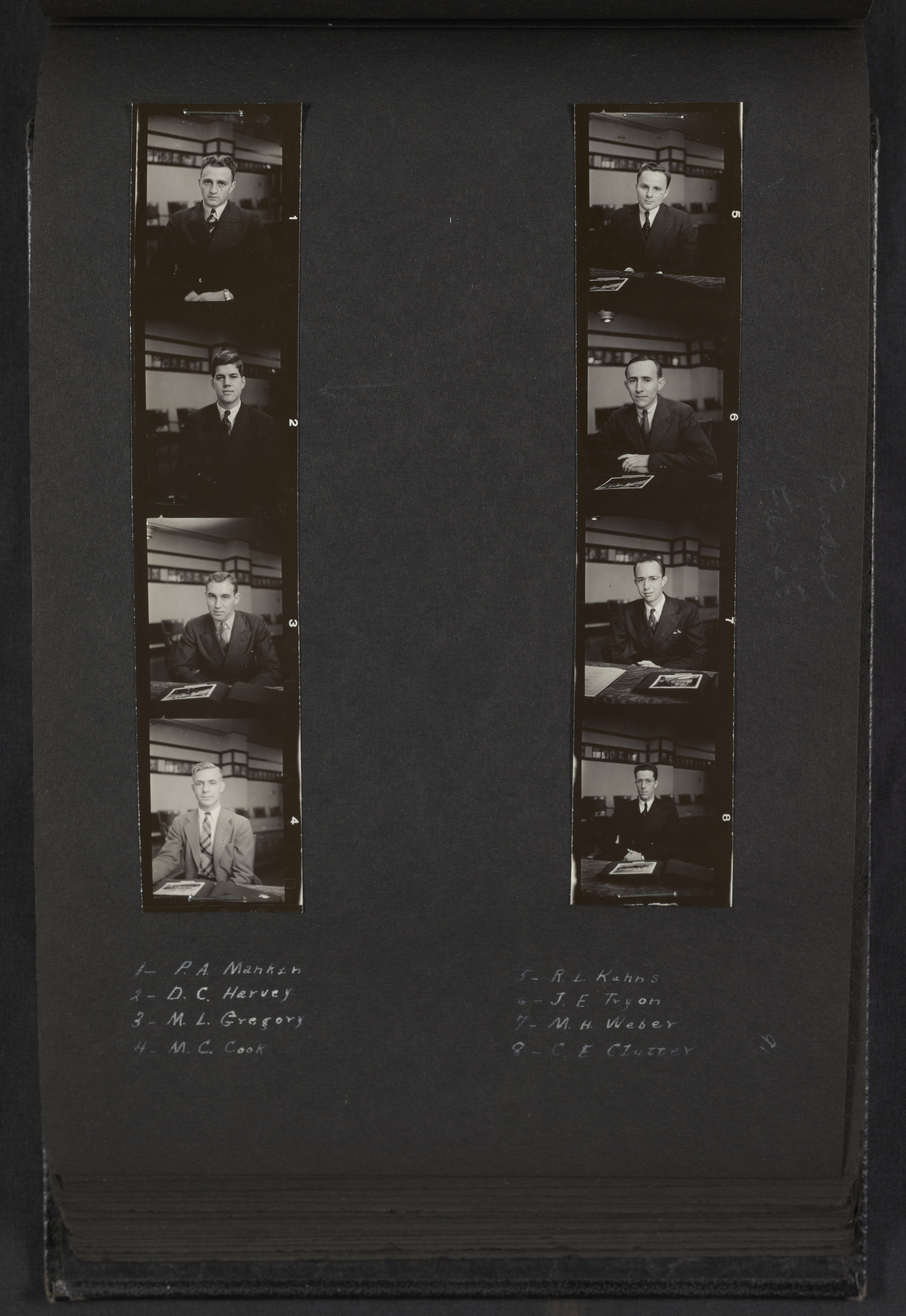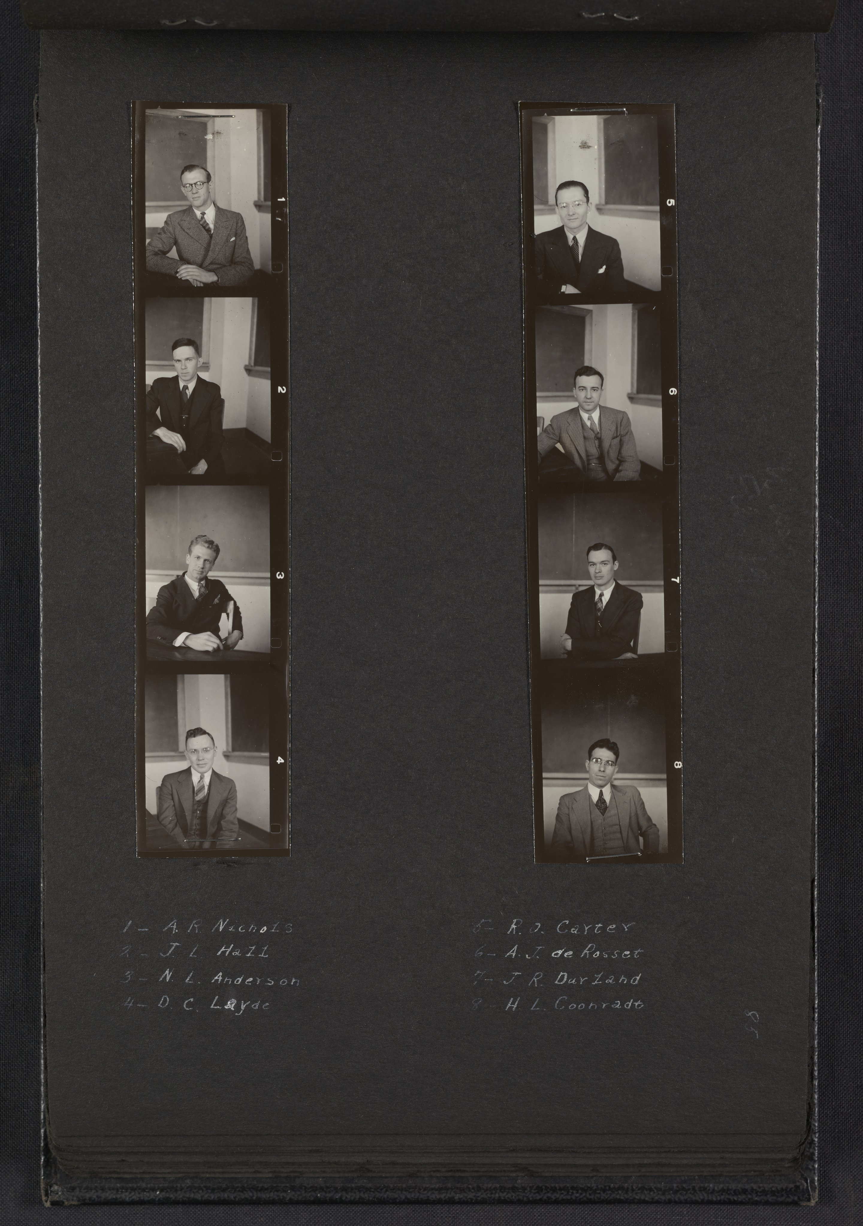 Small JPG1200 x 774px — 253 KBLarge JPG2880 x 1857px — 1.3 MBFull-sized JPG8122 x 5238px — 8.2 MBOriginal fileTIFF — 8122 x 5238px — 122 MBPhotographic album containing approximately 440 black and white portraits of new members of the American Chemical Society for the years 1938-1939. The names and institutional affiliation of each individual are inscribed on the album page. The portraits are grouped by institutional affiliation, including members from Yale, Princeton, Cornell, MIT, Ohio State University, and Purdue.