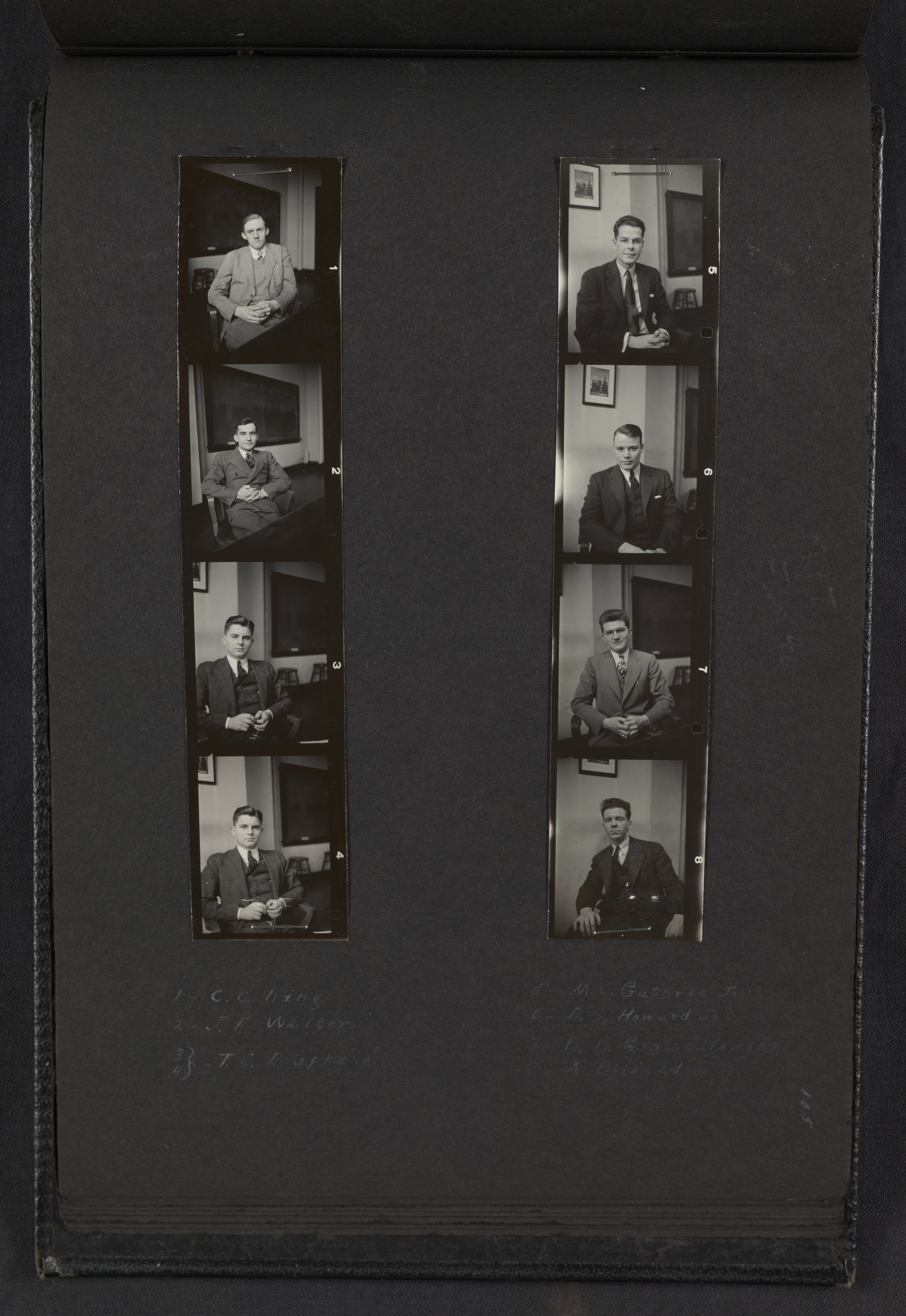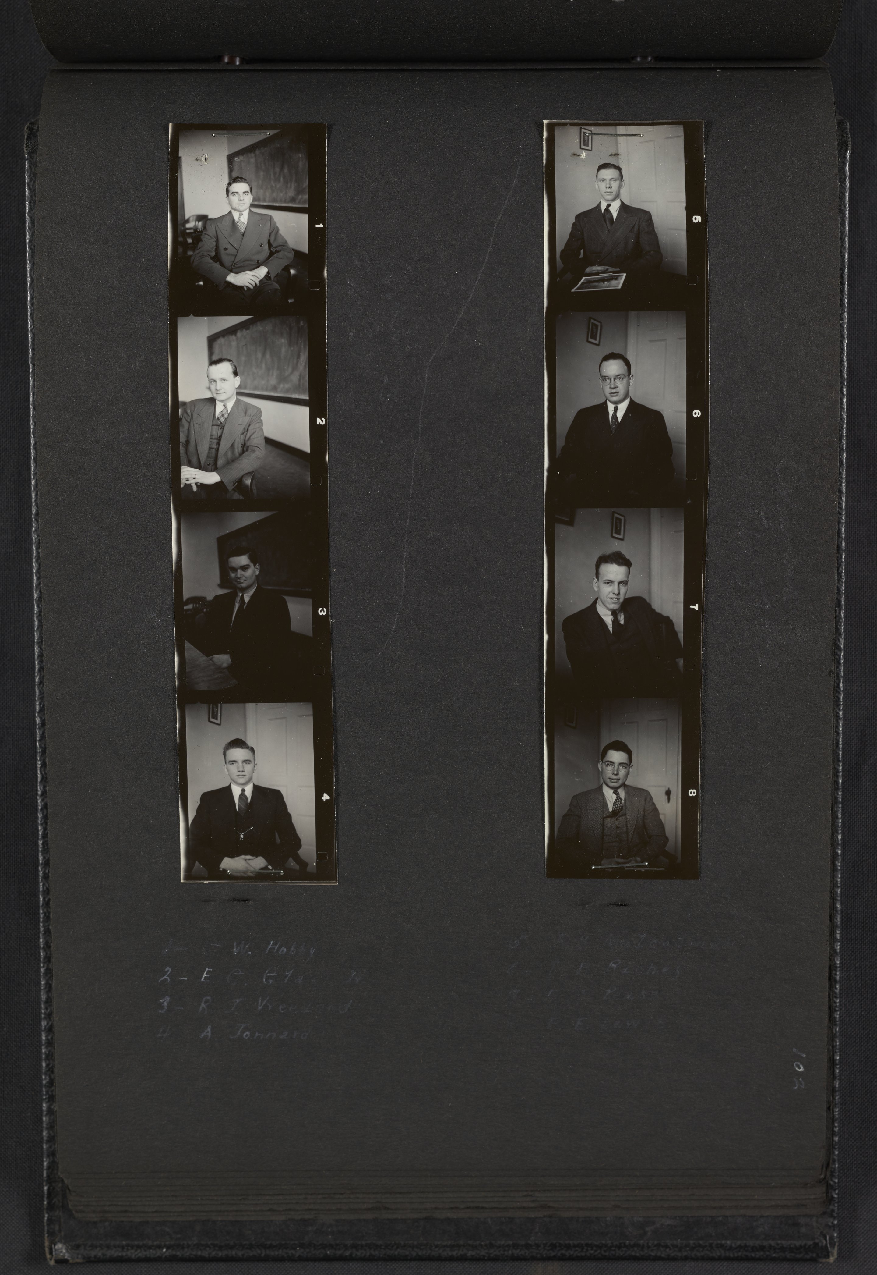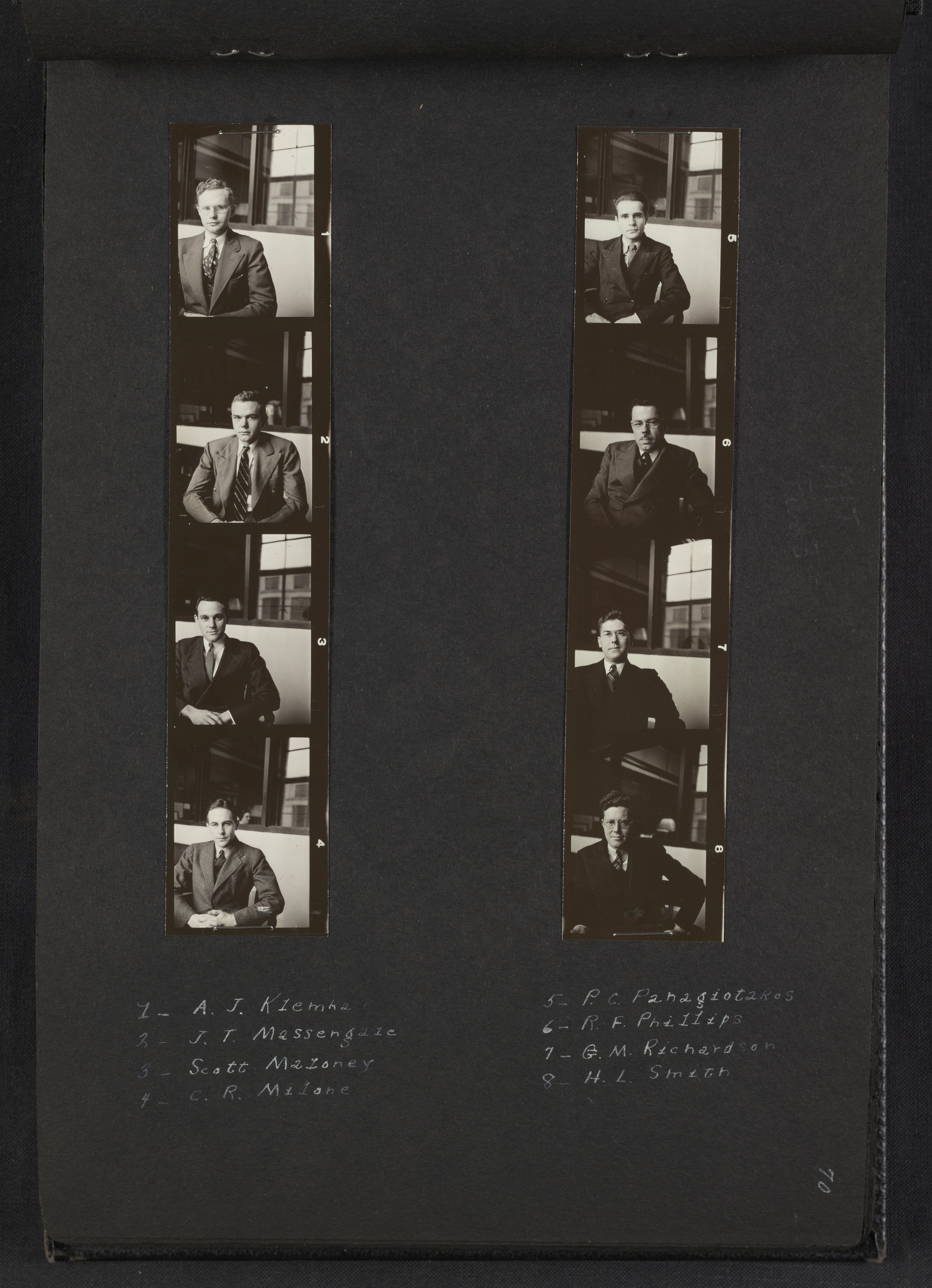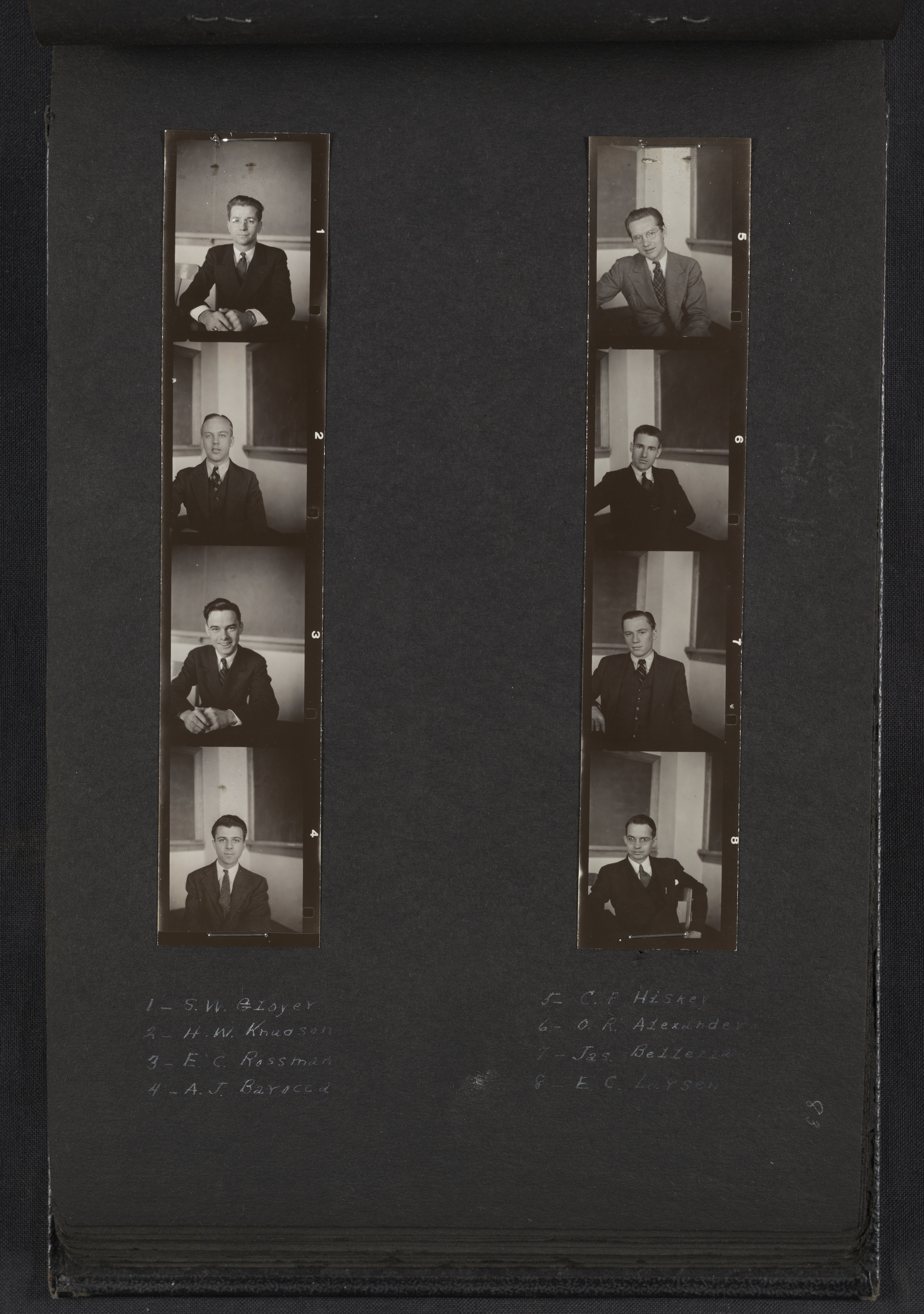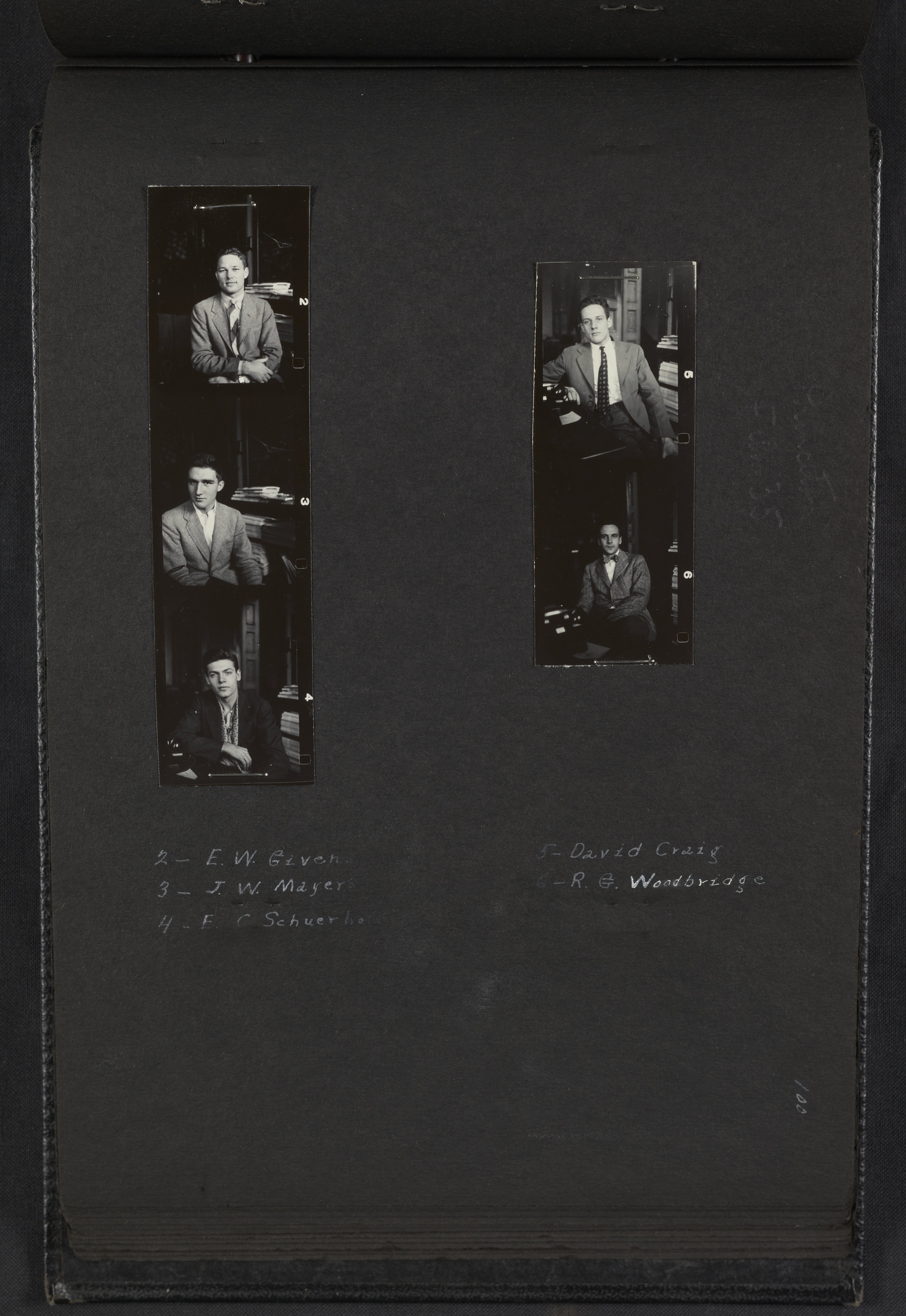 Small JPG1200 x 774px — 253 KBLarge JPG2880 x 1857px — 1.3 MBFull-sized JPG8122 x 5238px — 8.2 MBOriginal fileTIFF — 8122 x 5238px — 122 MBPhotographic album containing approximately 440 black and white portraits of new members of the American Chemical Society for the years 1938-1939. The names and institutional affiliation of each individual are inscribed on the album page. The portraits are grouped by institutional affiliation, including members from Yale, Princeton, Cornell, MIT, Ohio State University, and Purdue.