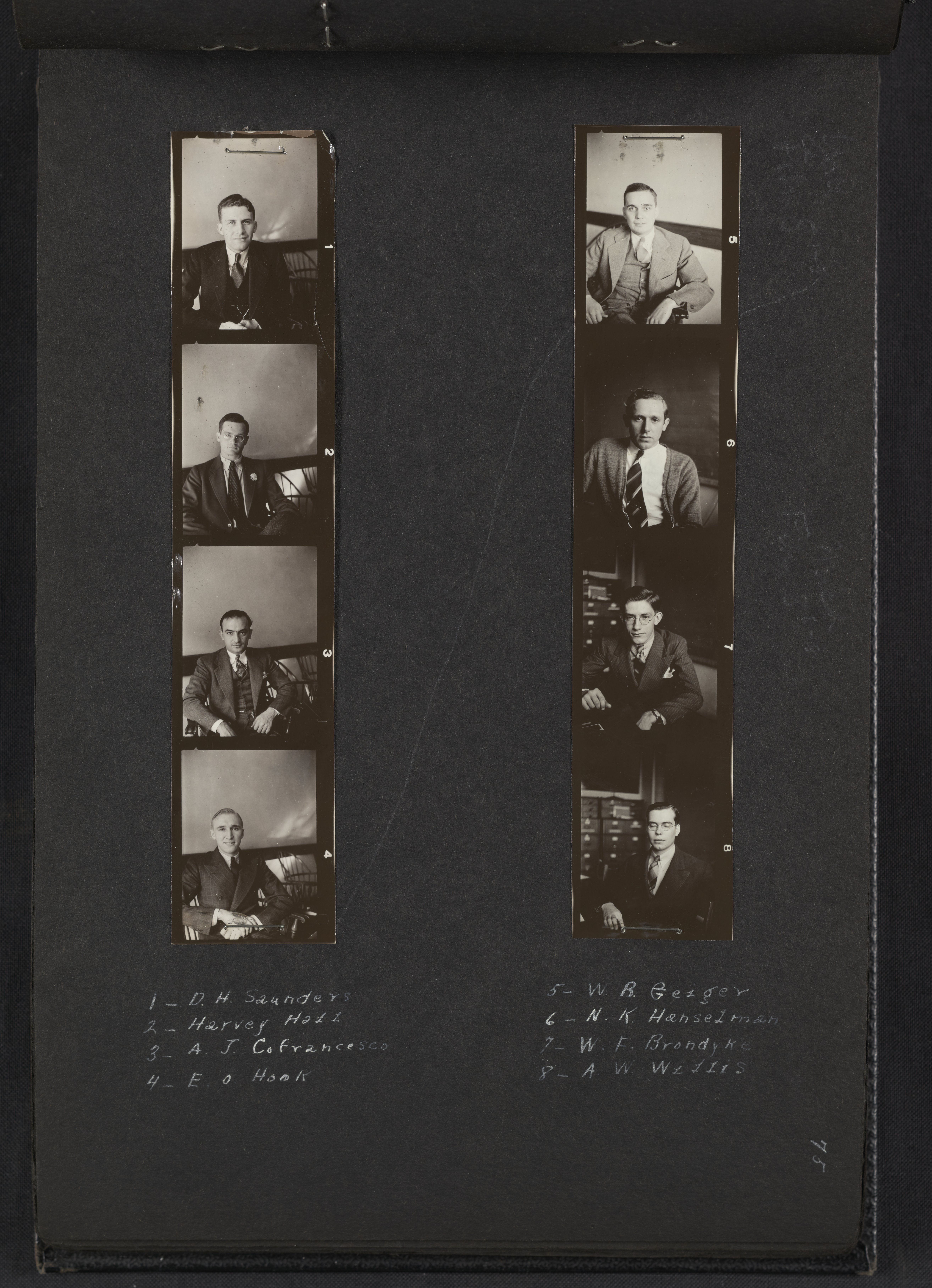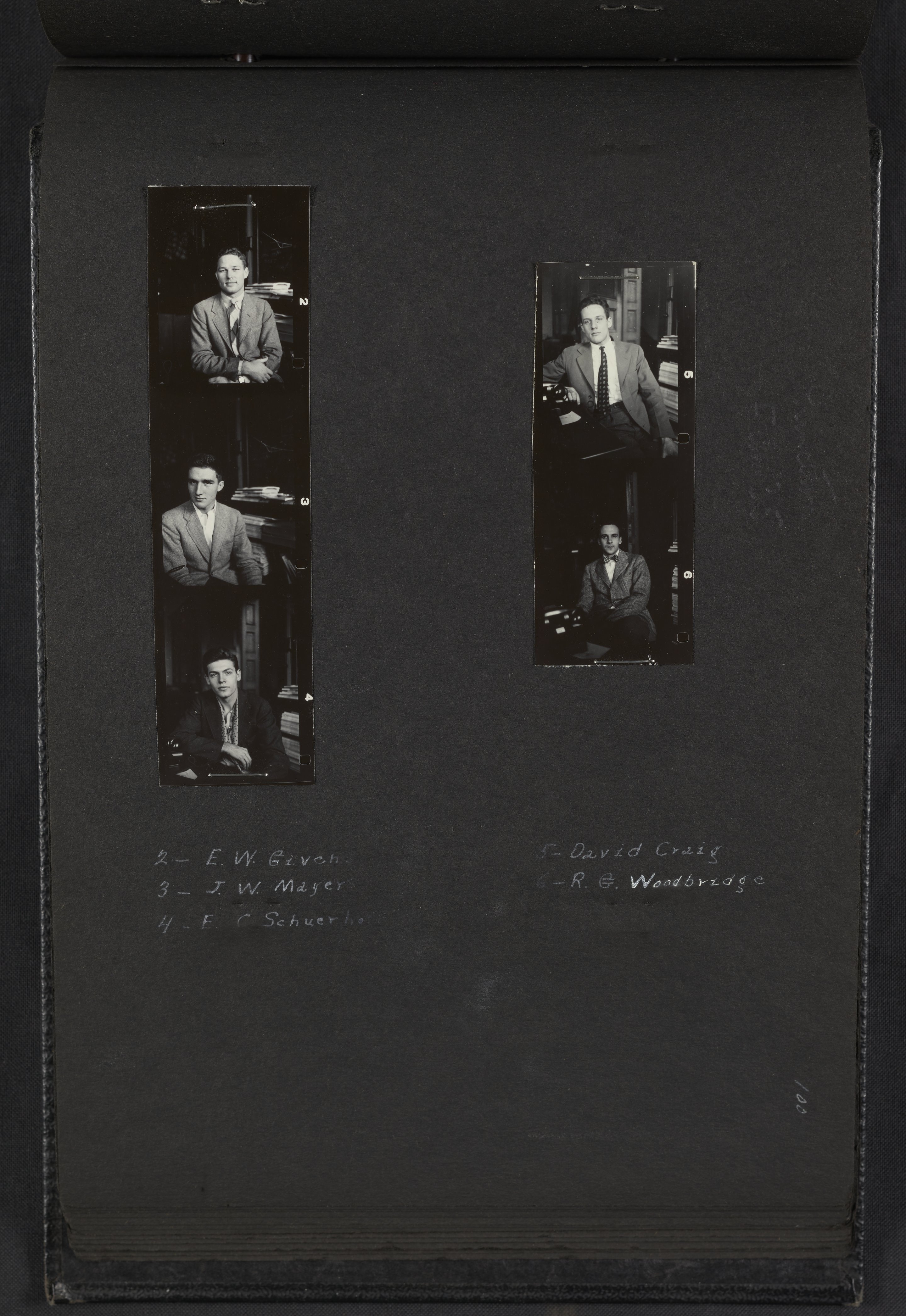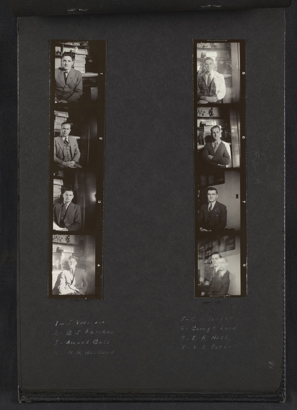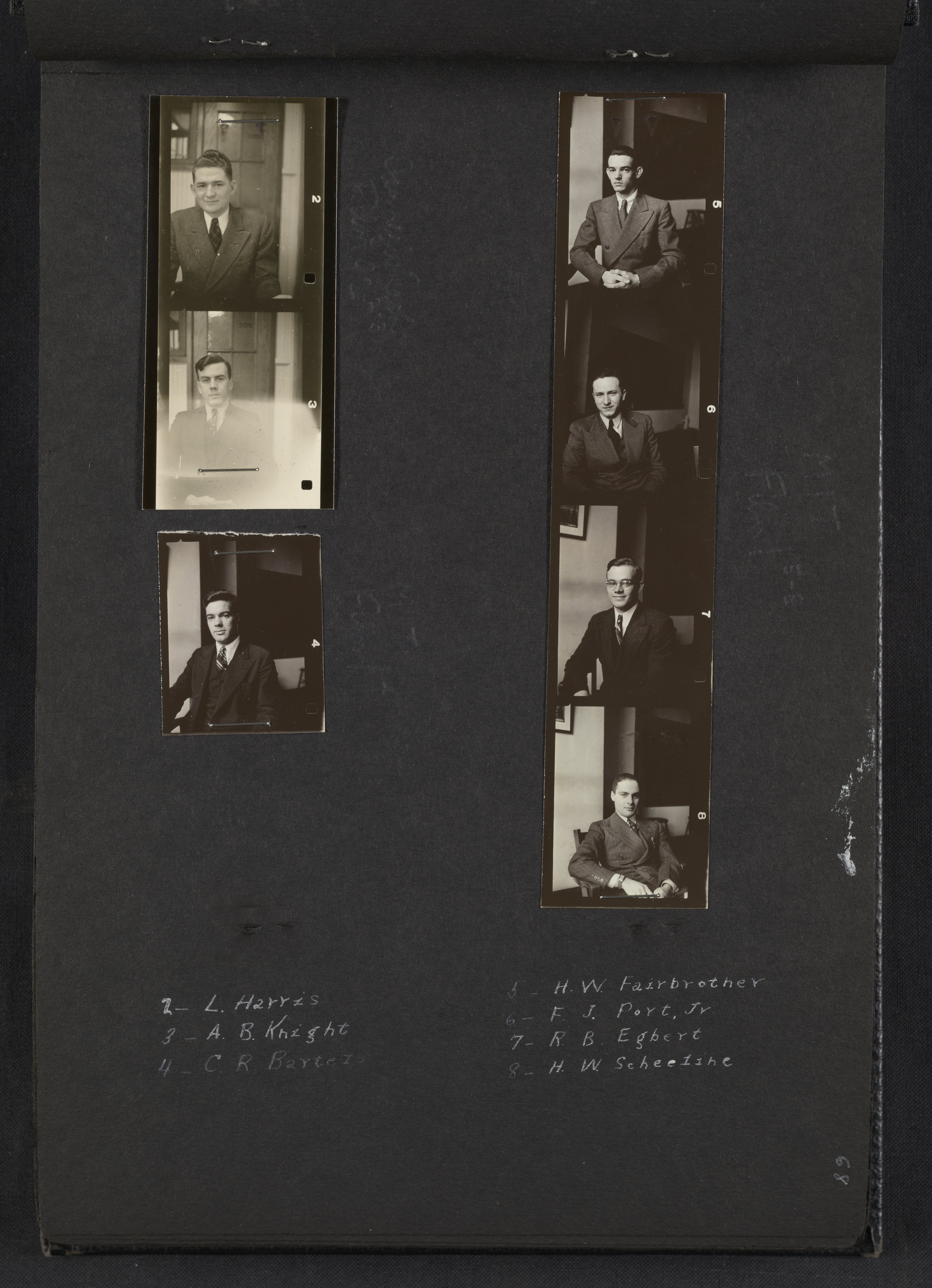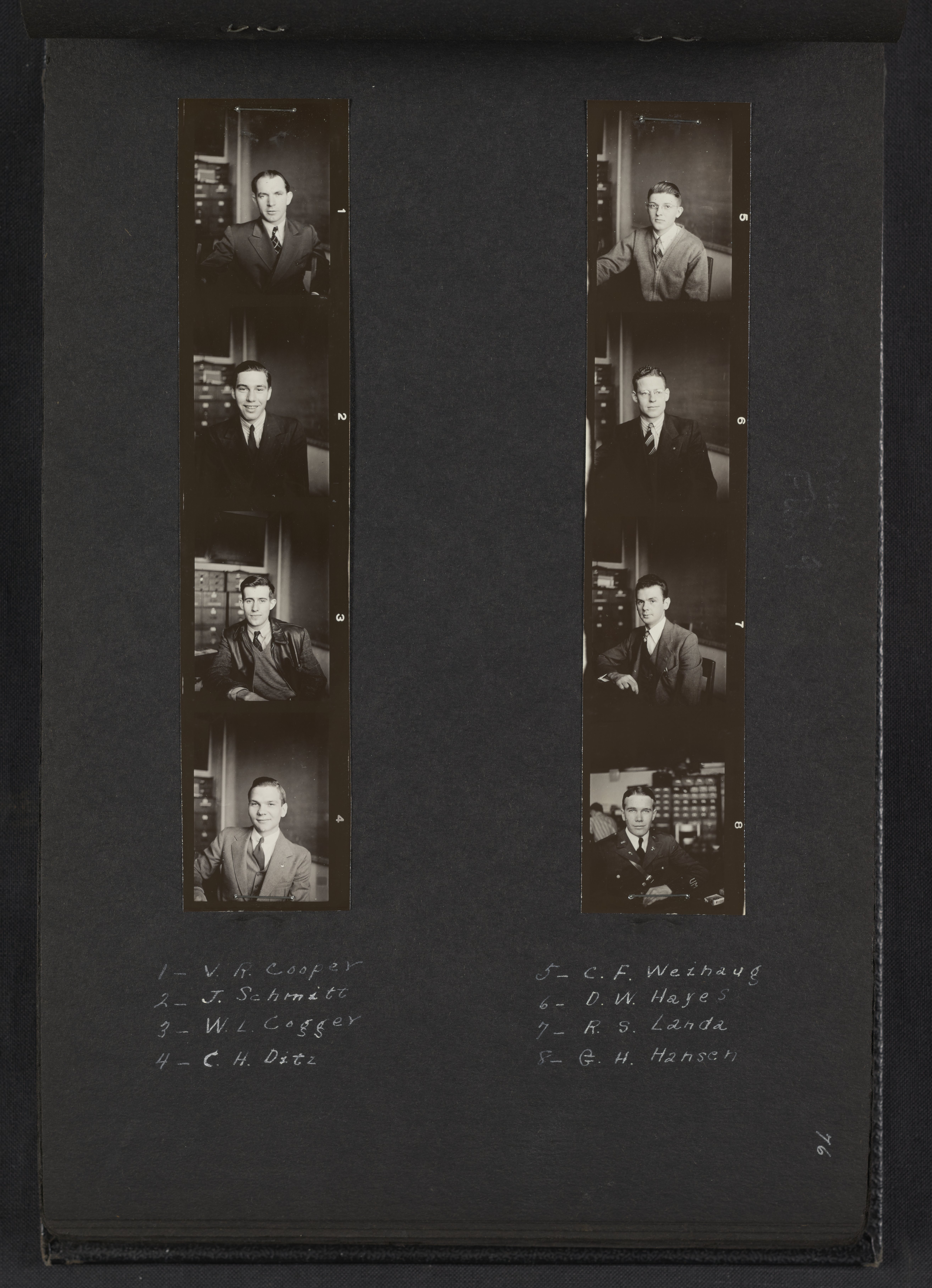 Small JPG1200 x 774px — 253 KBLarge JPG2880 x 1857px — 1.3 MBFull-sized JPG8122 x 5238px — 8.2 MBOriginal fileTIFF — 8122 x 5238px — 122 MBPhotographic album containing approximately 440 black and white portraits of new members of the American Chemical Society for the years 1938-1939. The names and institutional affiliation of each individual are inscribed on the album page. The portraits are grouped by institutional affiliation, including members from Yale, Princeton, Cornell, MIT, Ohio State University, and Purdue.