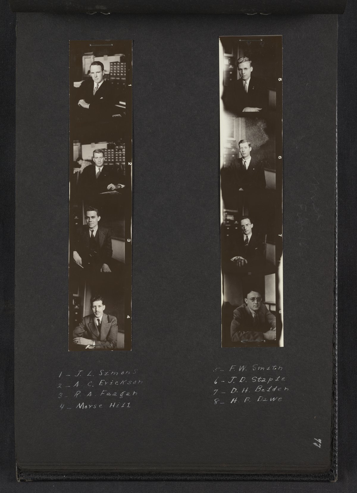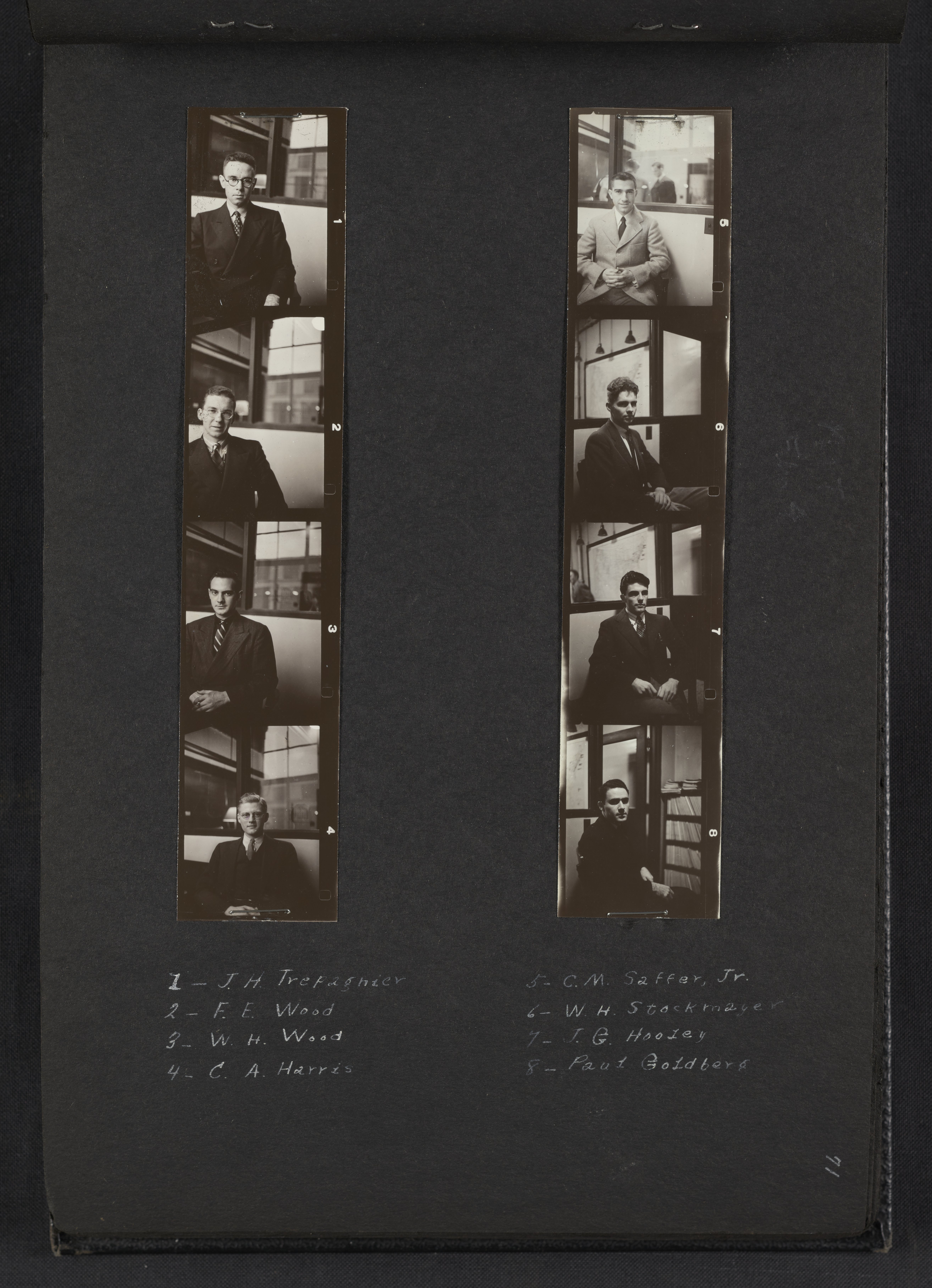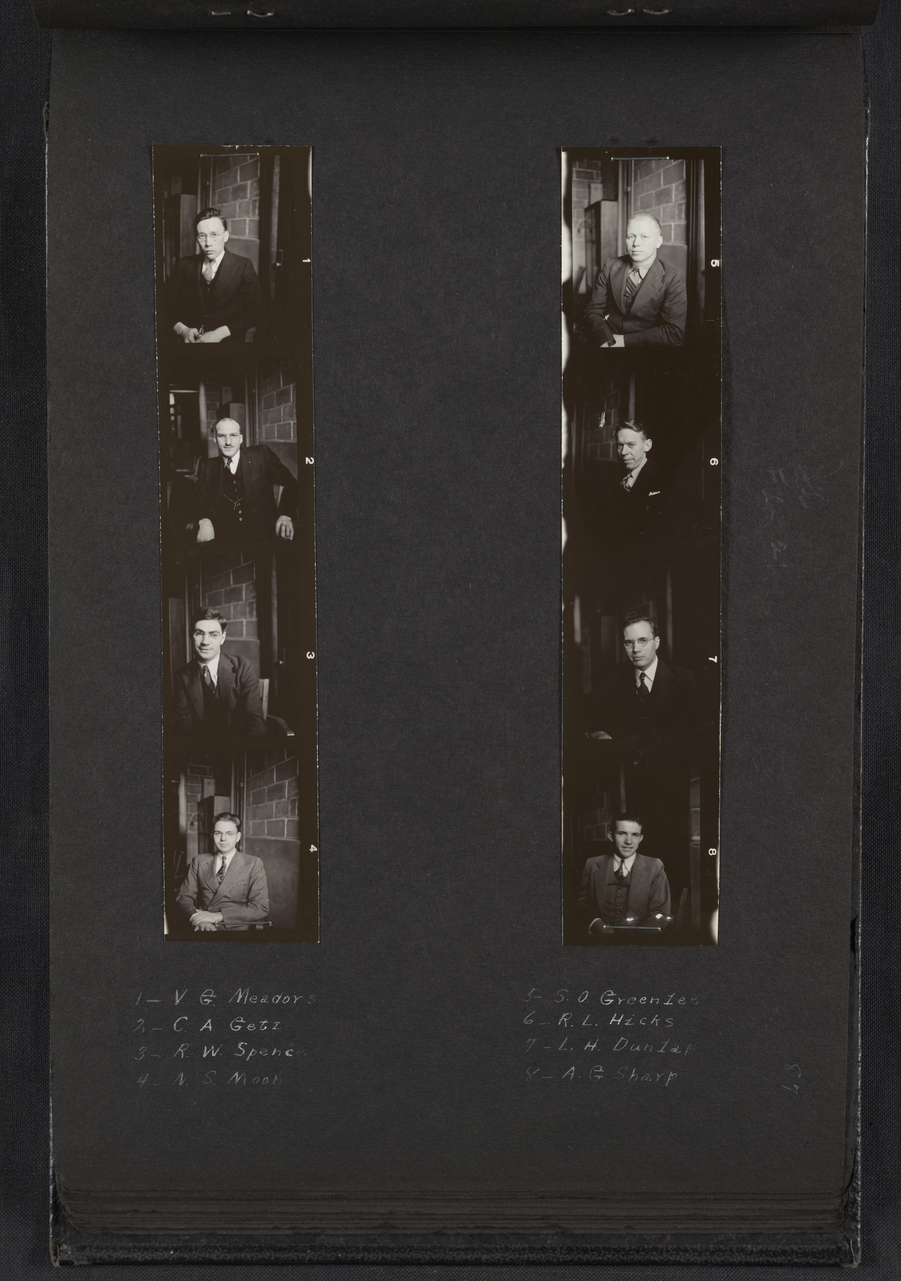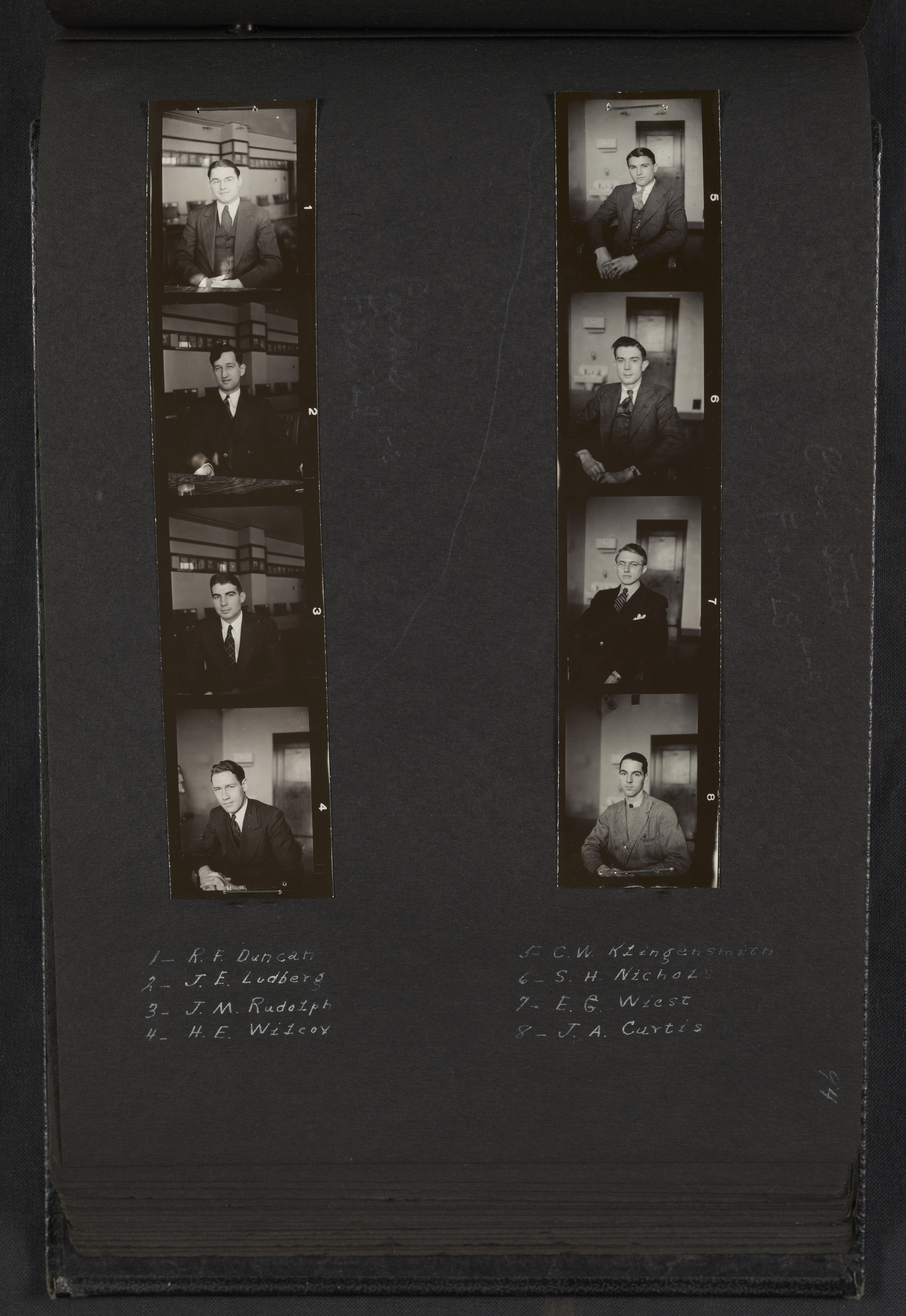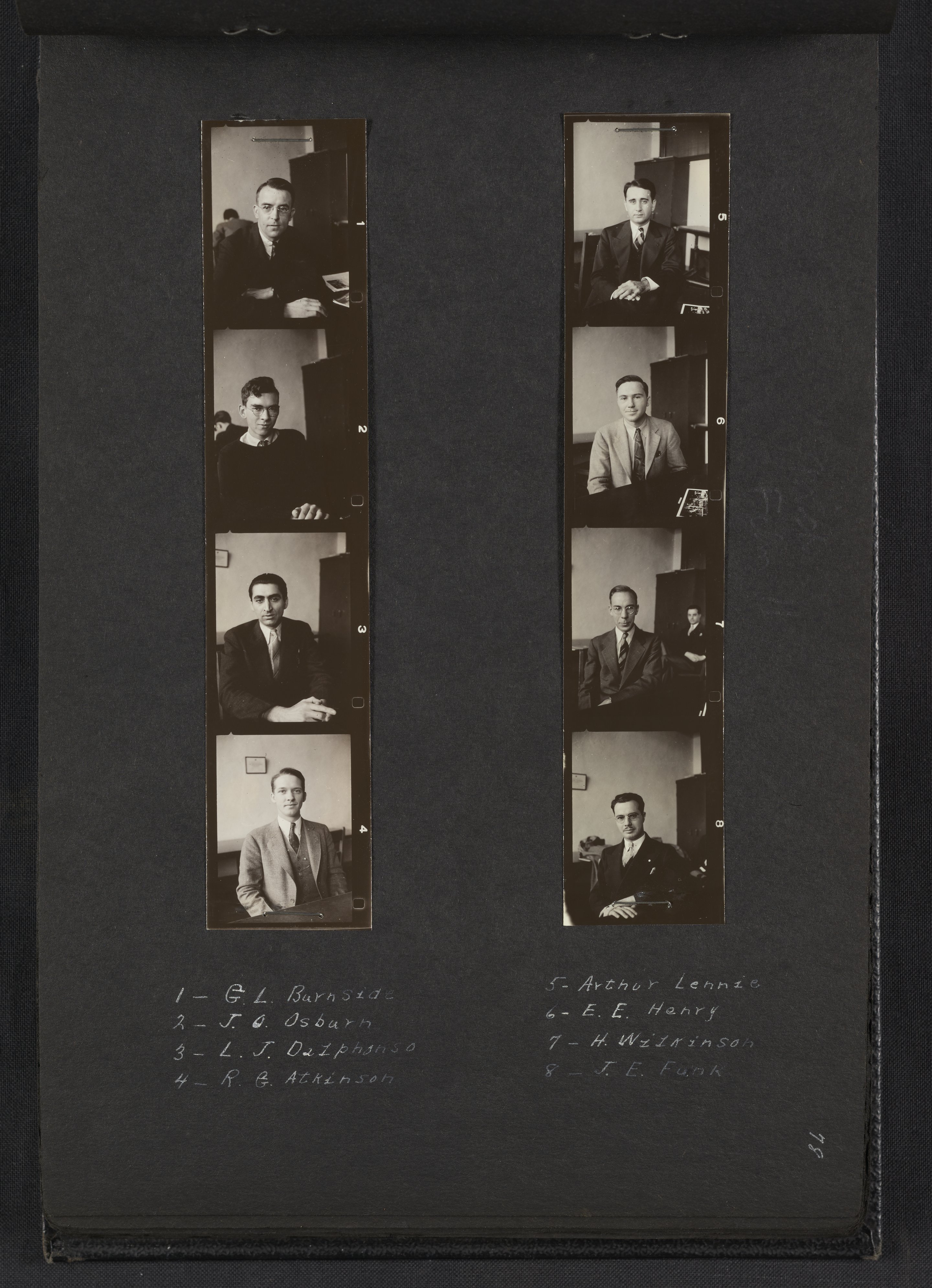 Small JPG1200 x 774px — 253 KBLarge JPG2880 x 1857px — 1.3 MBFull-sized JPG8122 x 5238px — 8.2 MBOriginal fileTIFF — 8122 x 5238px — 122 MBPhotographic album containing approximately 440 black and white portraits of new members of the American Chemical Society for the years 1938-1939. The names and institutional affiliation of each individual are inscribed on the album page. The portraits are grouped by institutional affiliation, including members from Yale, Princeton, Cornell, MIT, Ohio State University, and Purdue.