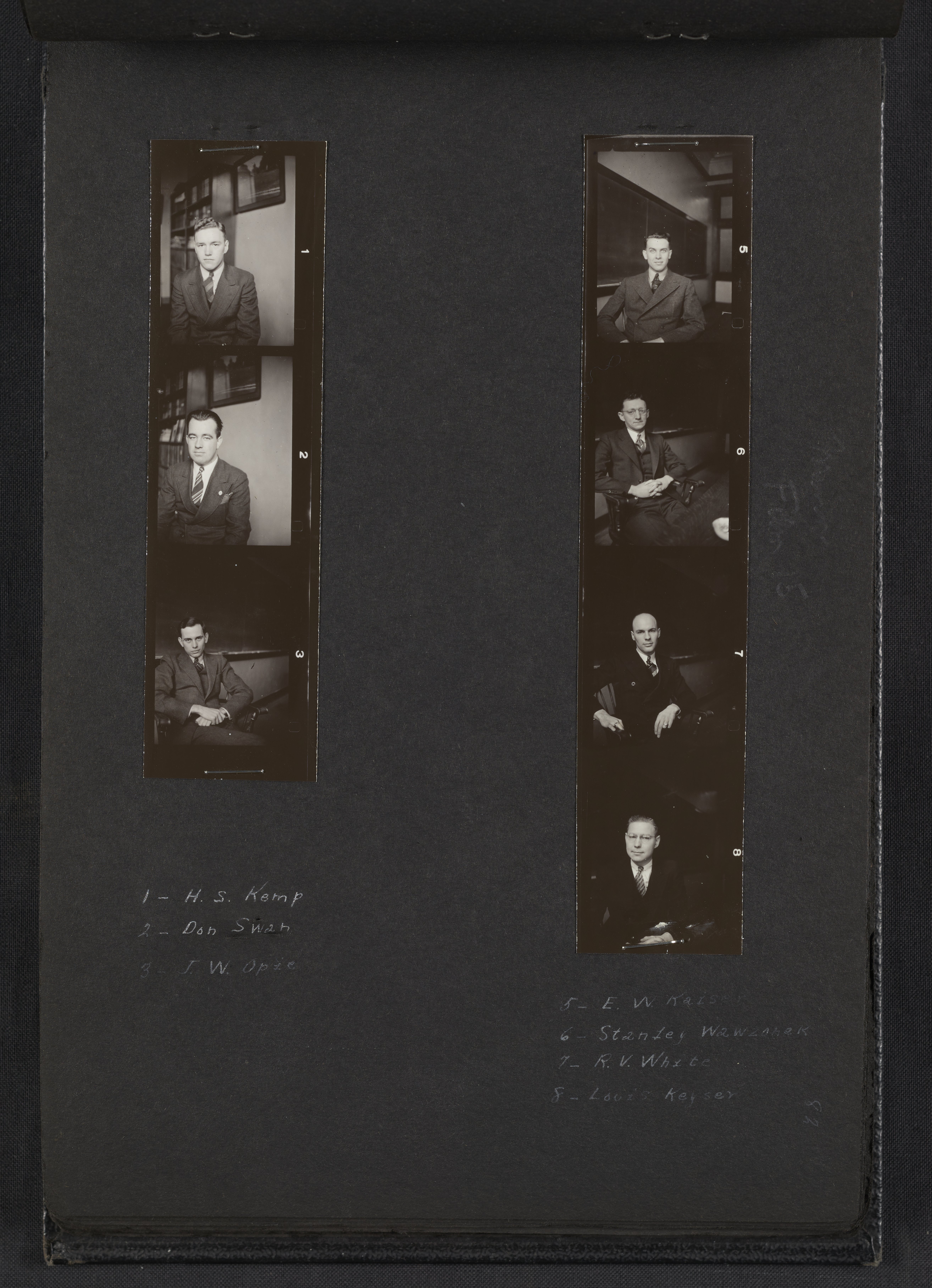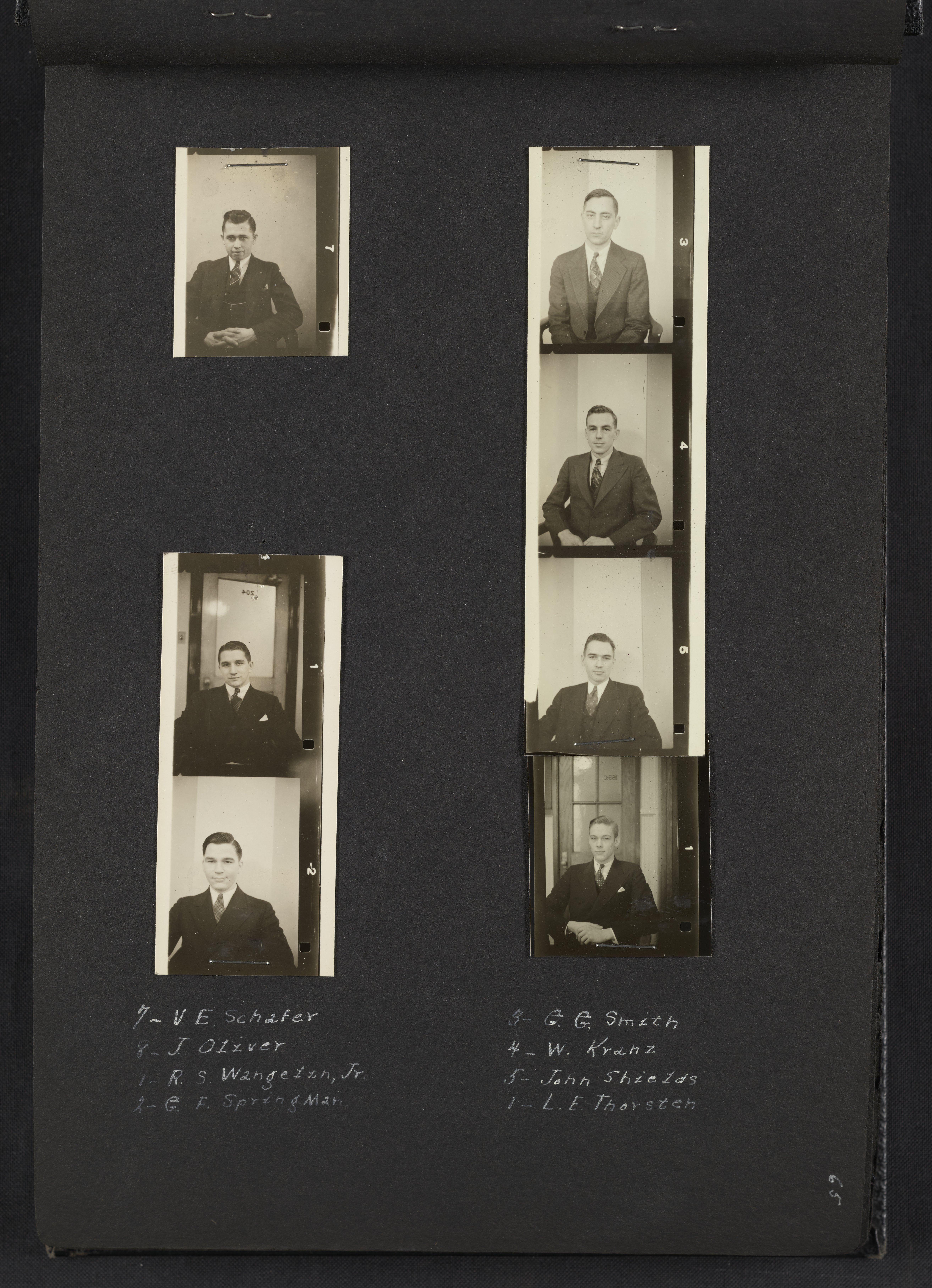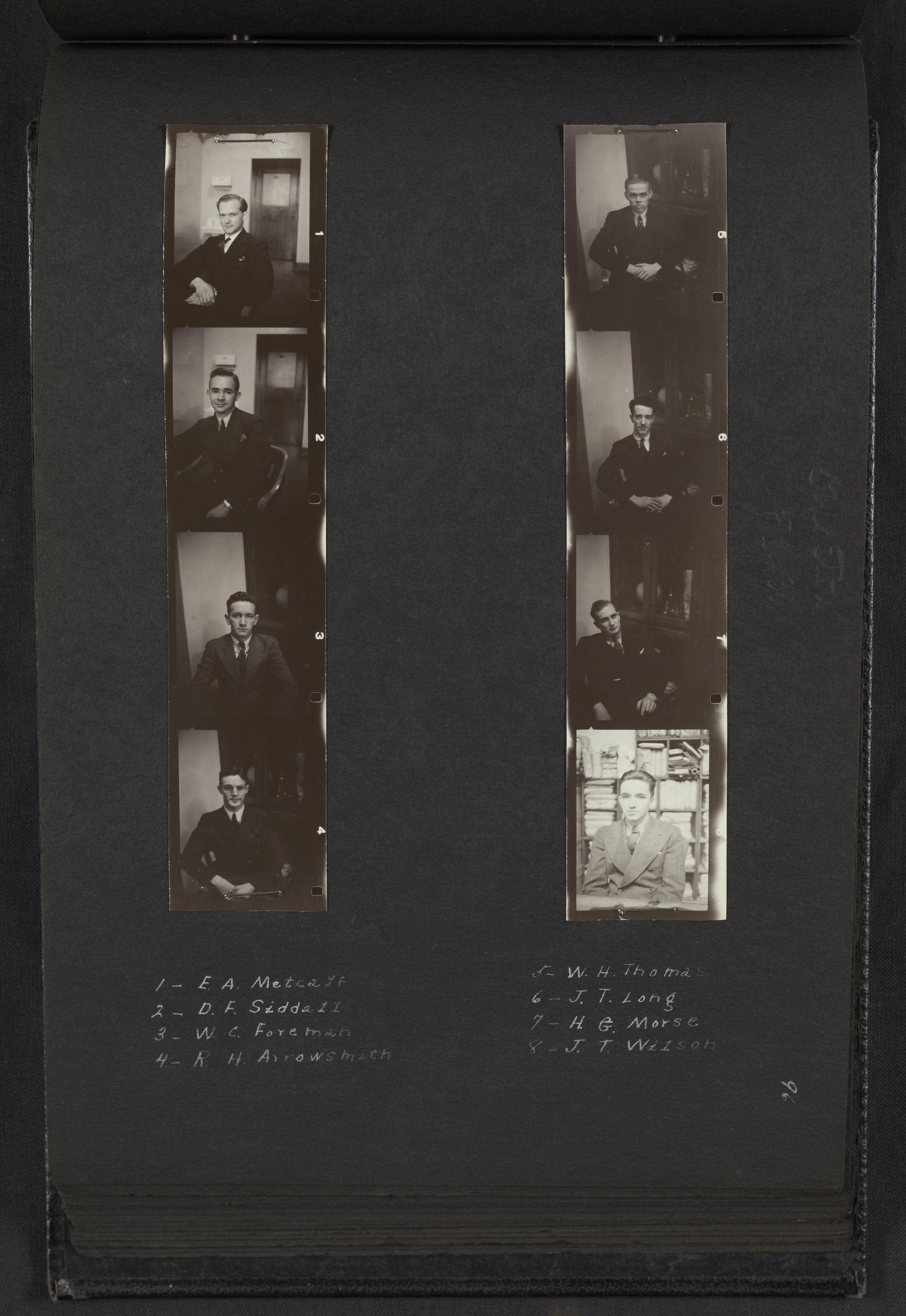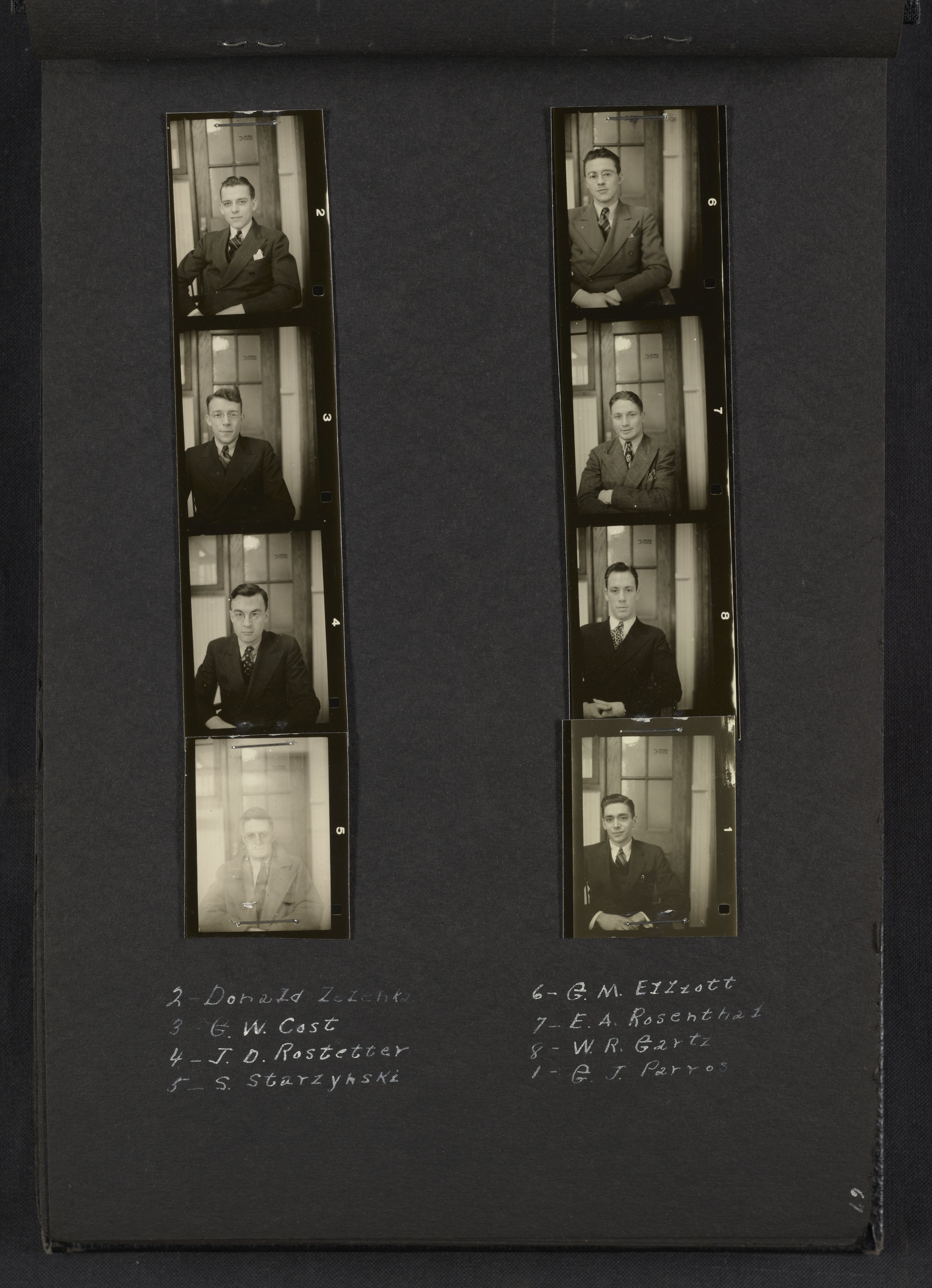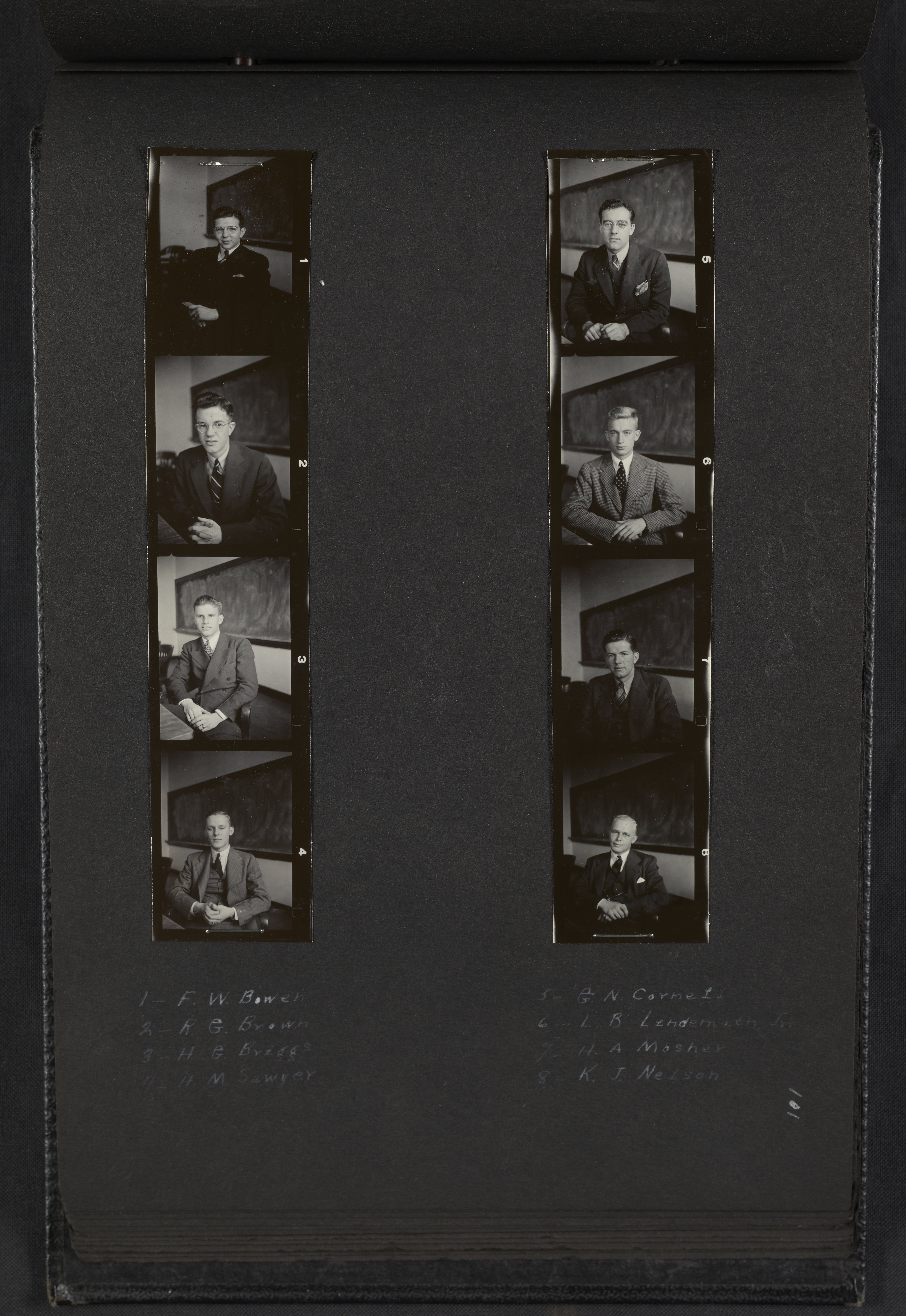 Small JPG1200 x 774px — 253 KBLarge JPG2880 x 1857px — 1.3 MBFull-sized JPG8122 x 5238px — 8.2 MBOriginal fileTIFF — 8122 x 5238px — 122 MBPhotographic album containing approximately 440 black and white portraits of new members of the American Chemical Society for the years 1938-1939. The names and institutional affiliation of each individual are inscribed on the album page. The portraits are grouped by institutional affiliation, including members from Yale, Princeton, Cornell, MIT, Ohio State University, and Purdue.