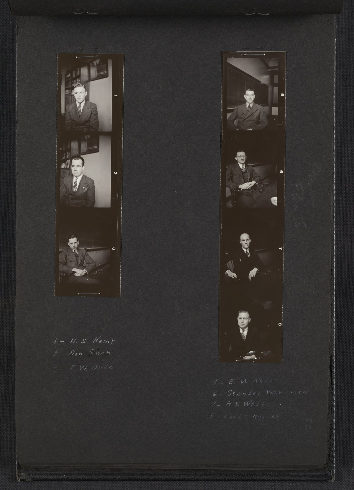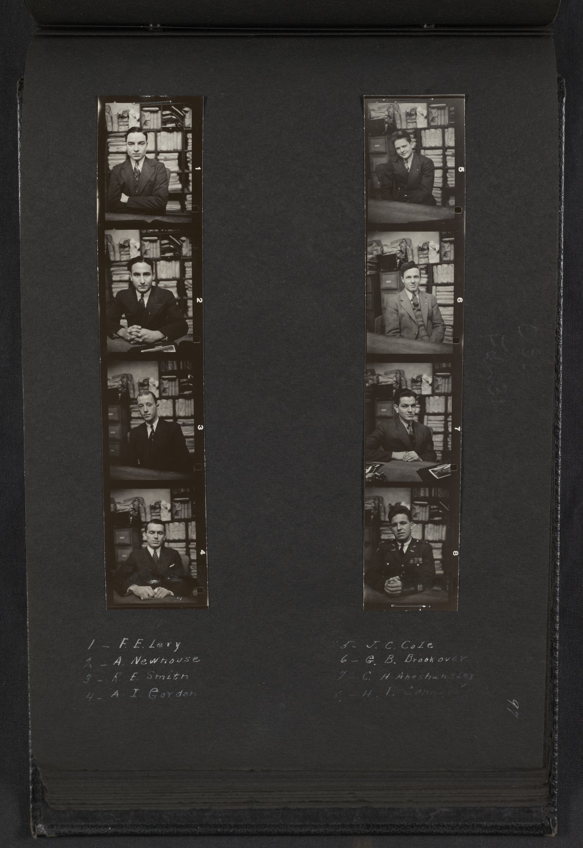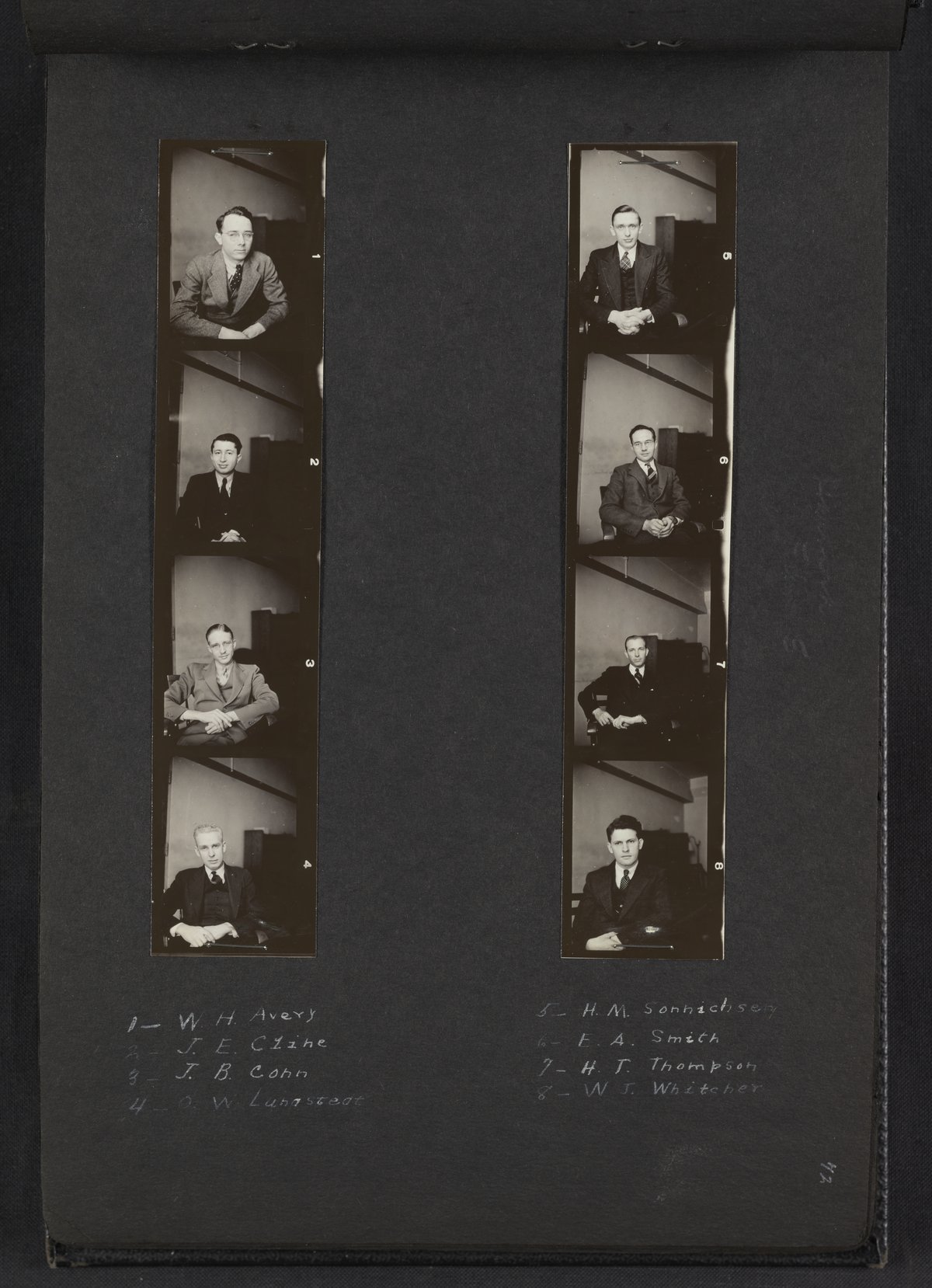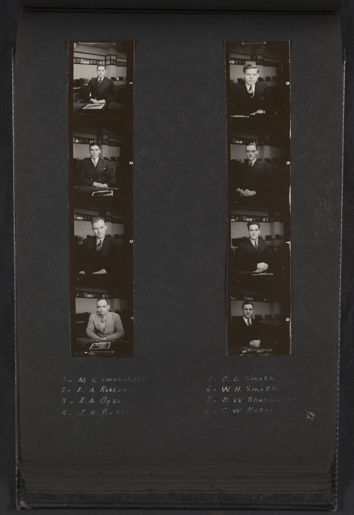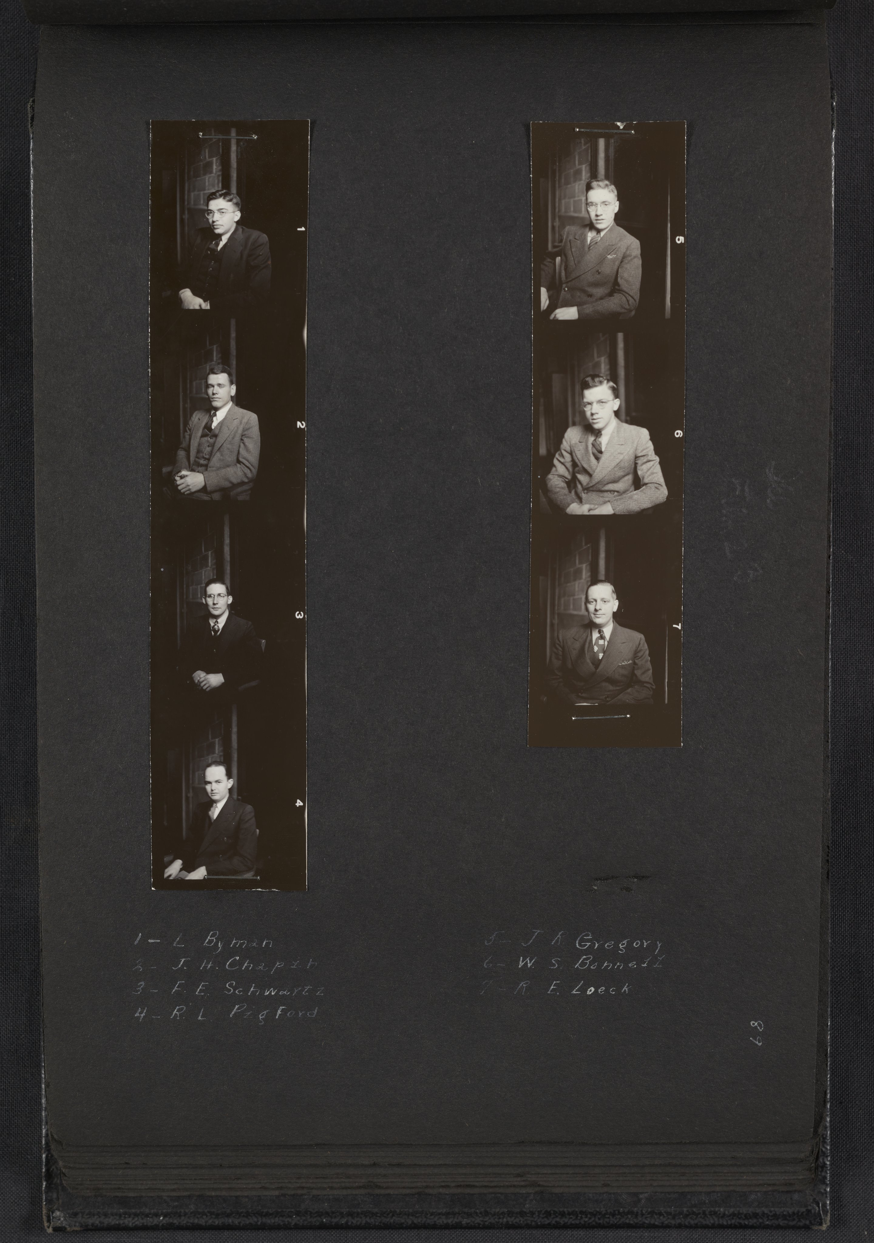 Small JPG1200 x 774px — 253 KBLarge JPG2880 x 1857px — 1.3 MBFull-sized JPG8122 x 5238px — 8.2 MBOriginal fileTIFF — 8122 x 5238px — 122 MBPhotographic album containing approximately 440 black and white portraits of new members of the American Chemical Society for the years 1938-1939. The names and institutional affiliation of each individual are inscribed on the album page. The portraits are grouped by institutional affiliation, including members from Yale, Princeton, Cornell, MIT, Ohio State University, and Purdue.