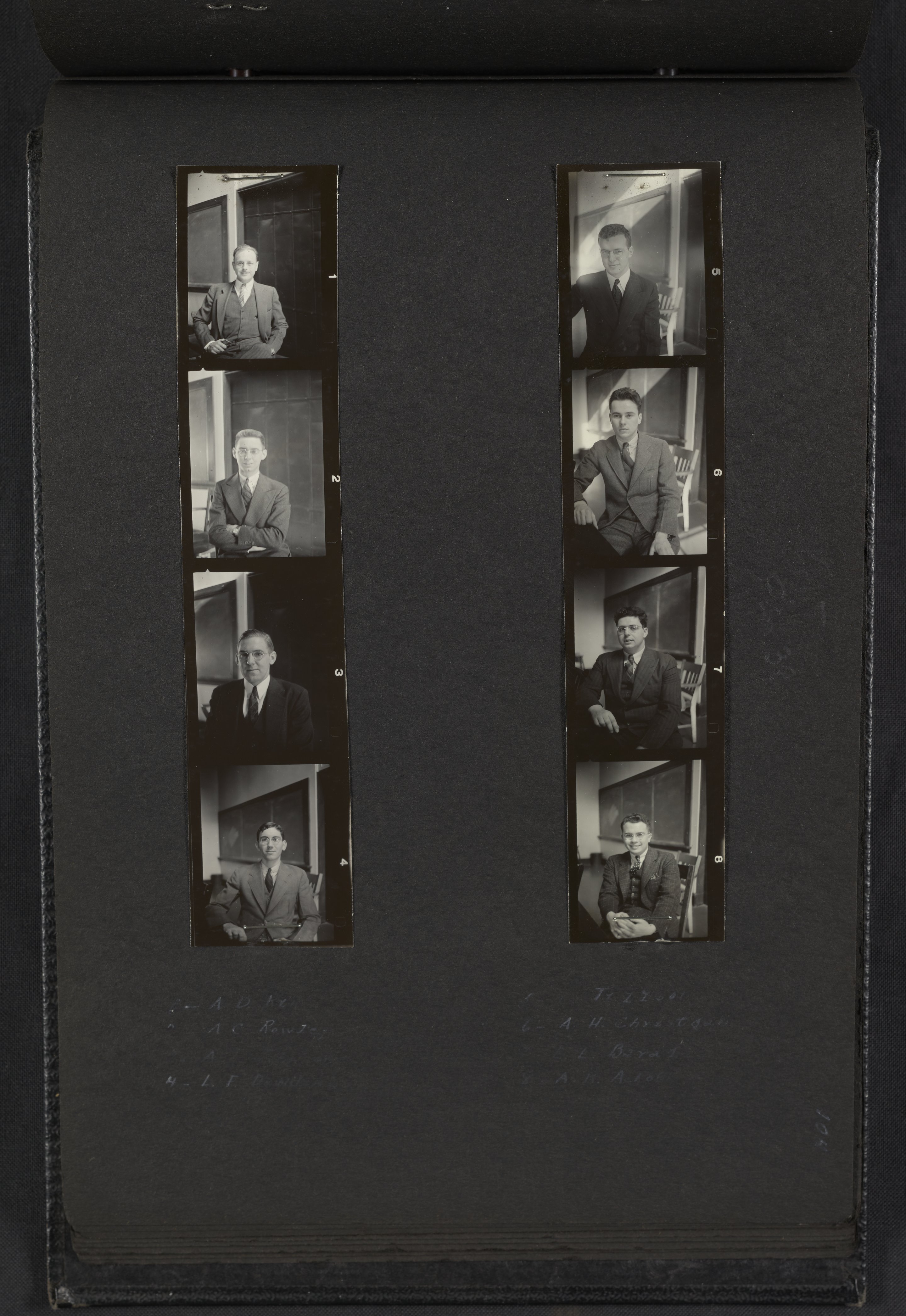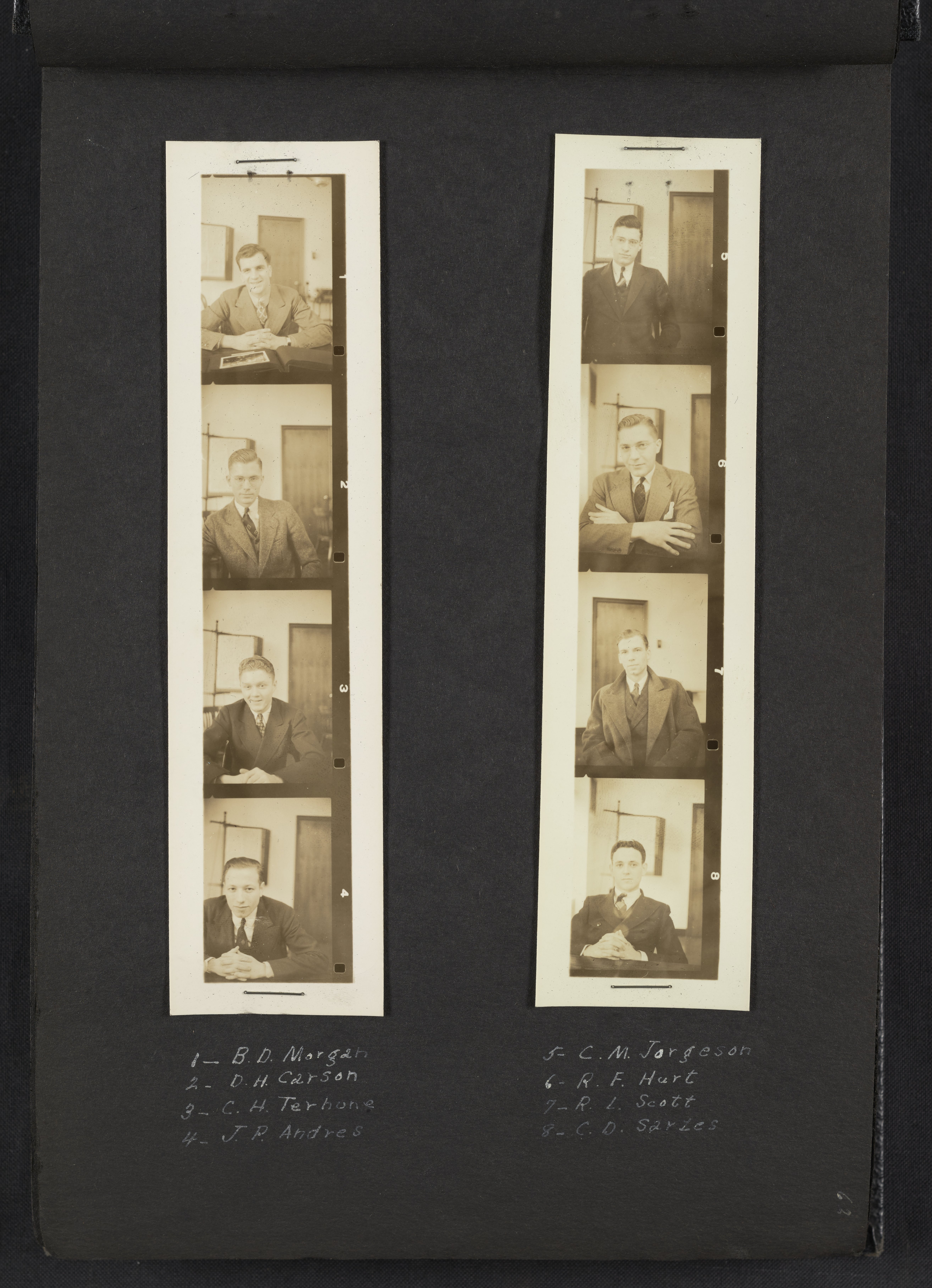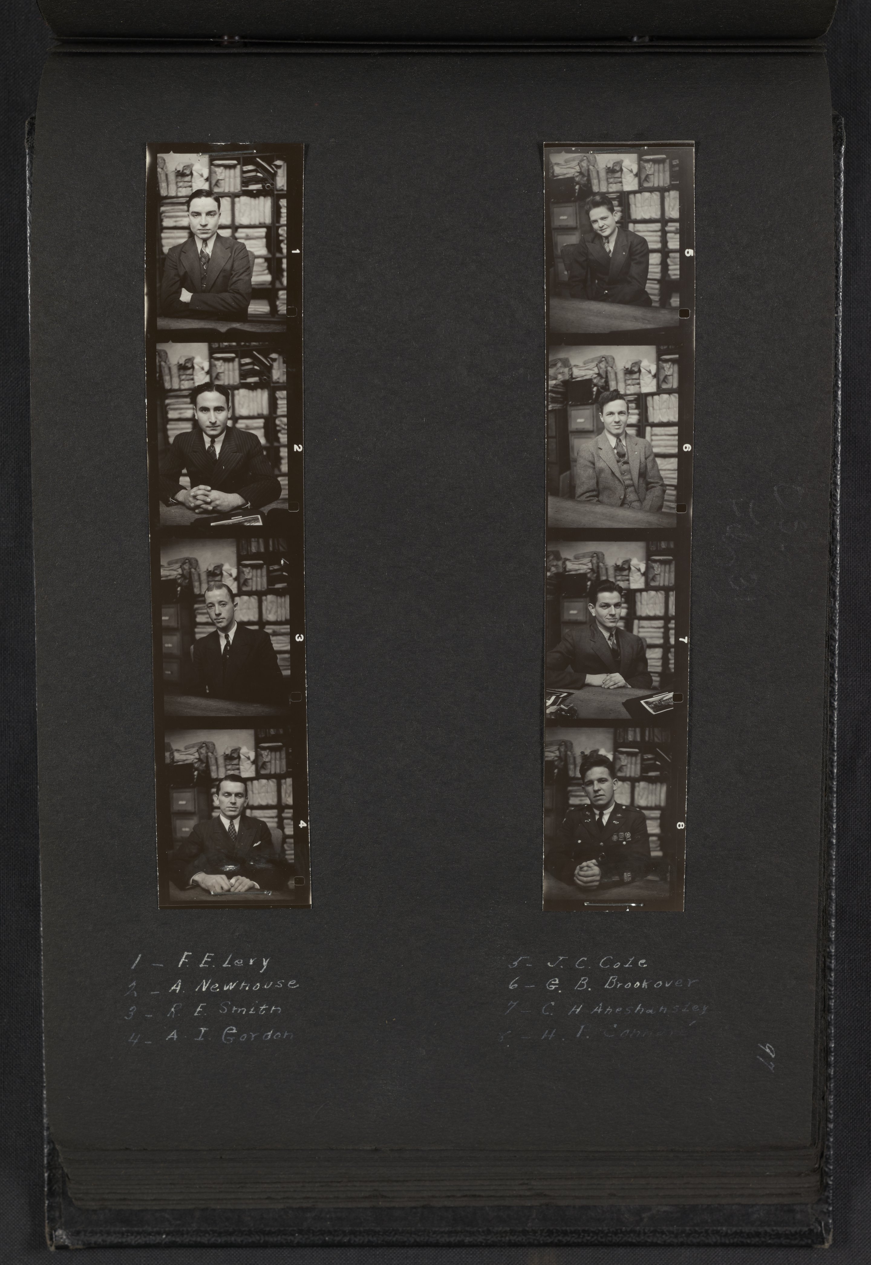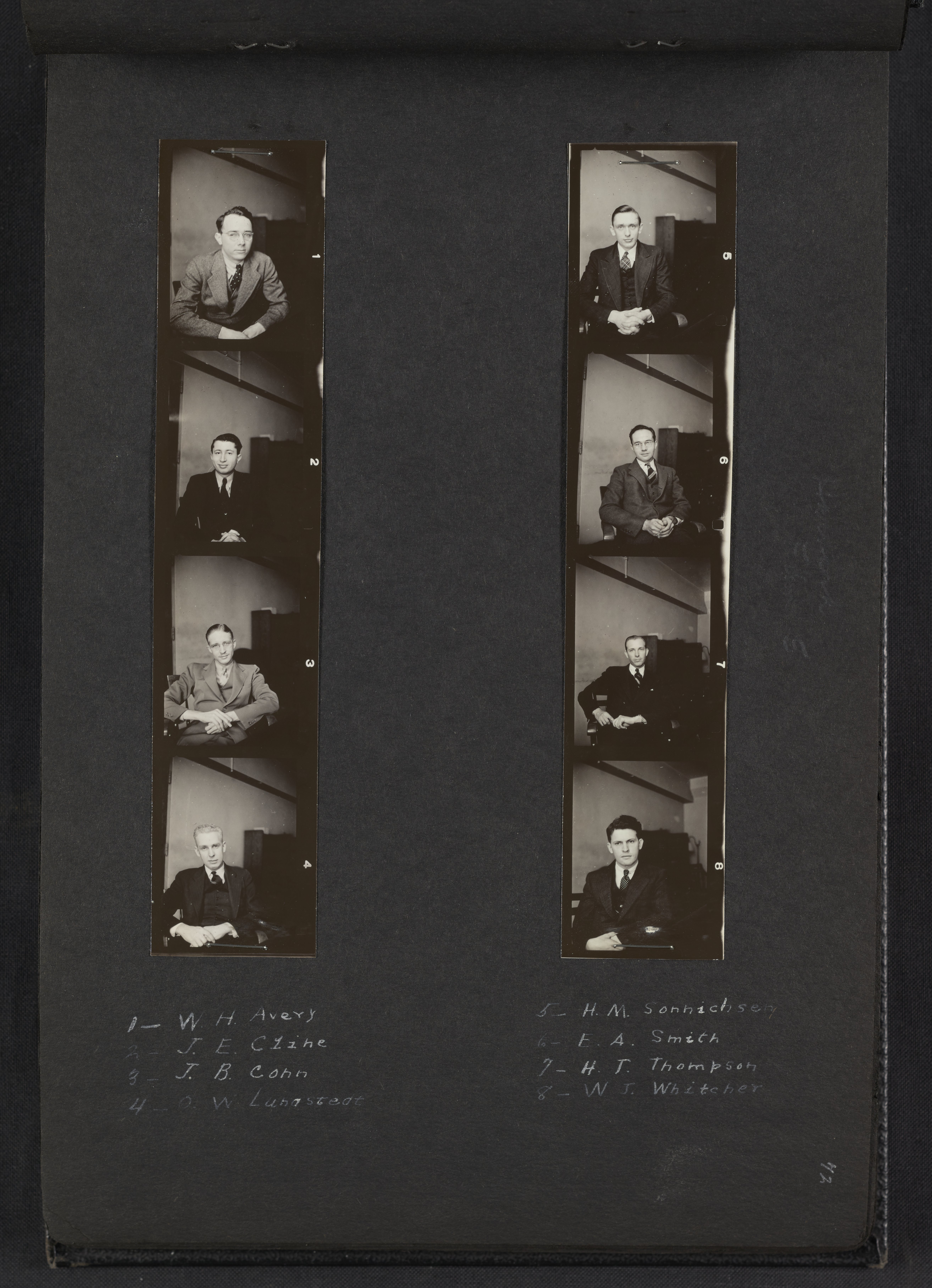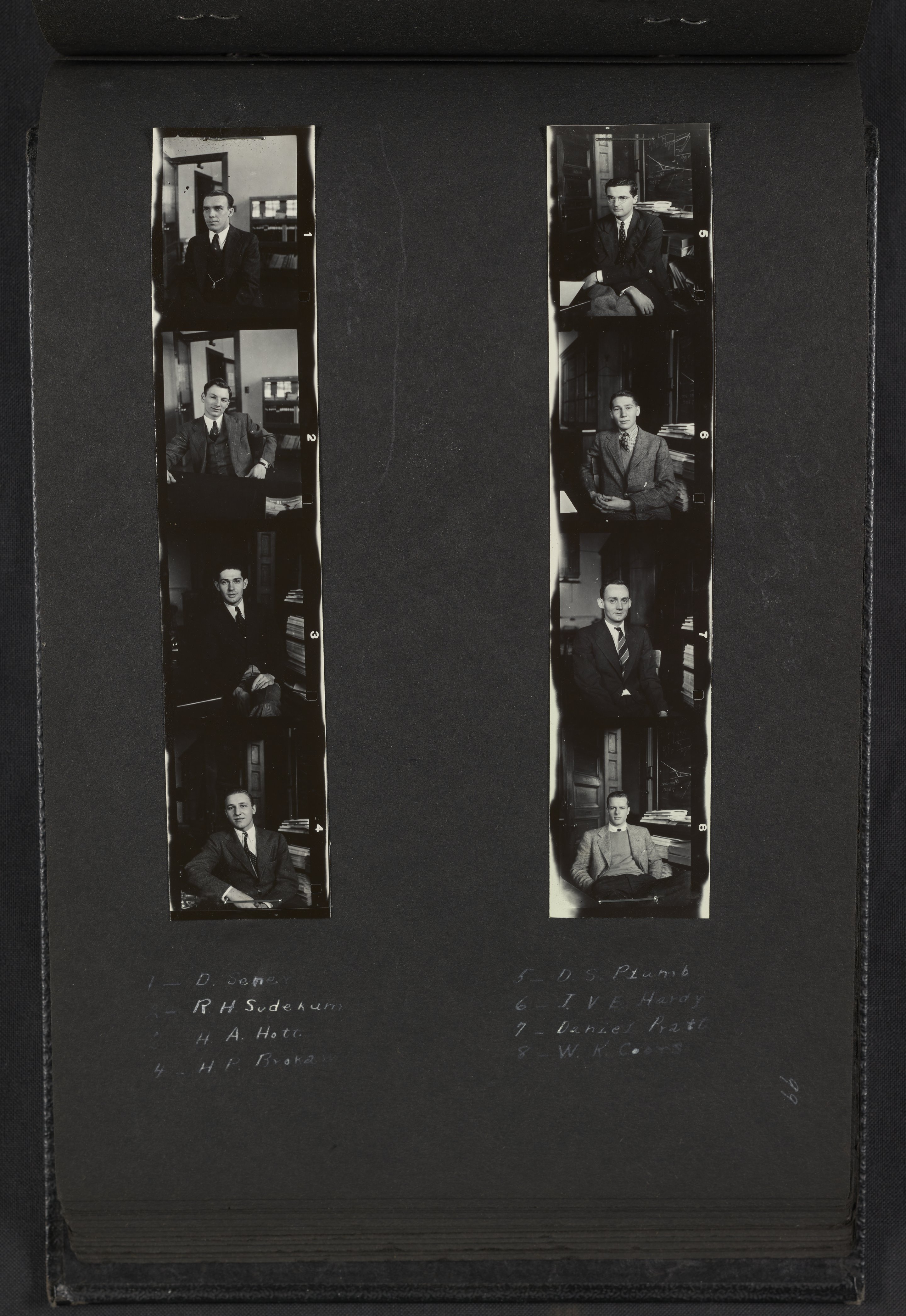 Small JPG1200 x 774px — 253 KBLarge JPG2880 x 1857px — 1.3 MBFull-sized JPG8122 x 5238px — 8.2 MBOriginal fileTIFF — 8122 x 5238px — 122 MBPhotographic album containing approximately 440 black and white portraits of new members of the American Chemical Society for the years 1938-1939. The names and institutional affiliation of each individual are inscribed on the album page. The portraits are grouped by institutional affiliation, including members from Yale, Princeton, Cornell, MIT, Ohio State University, and Purdue.