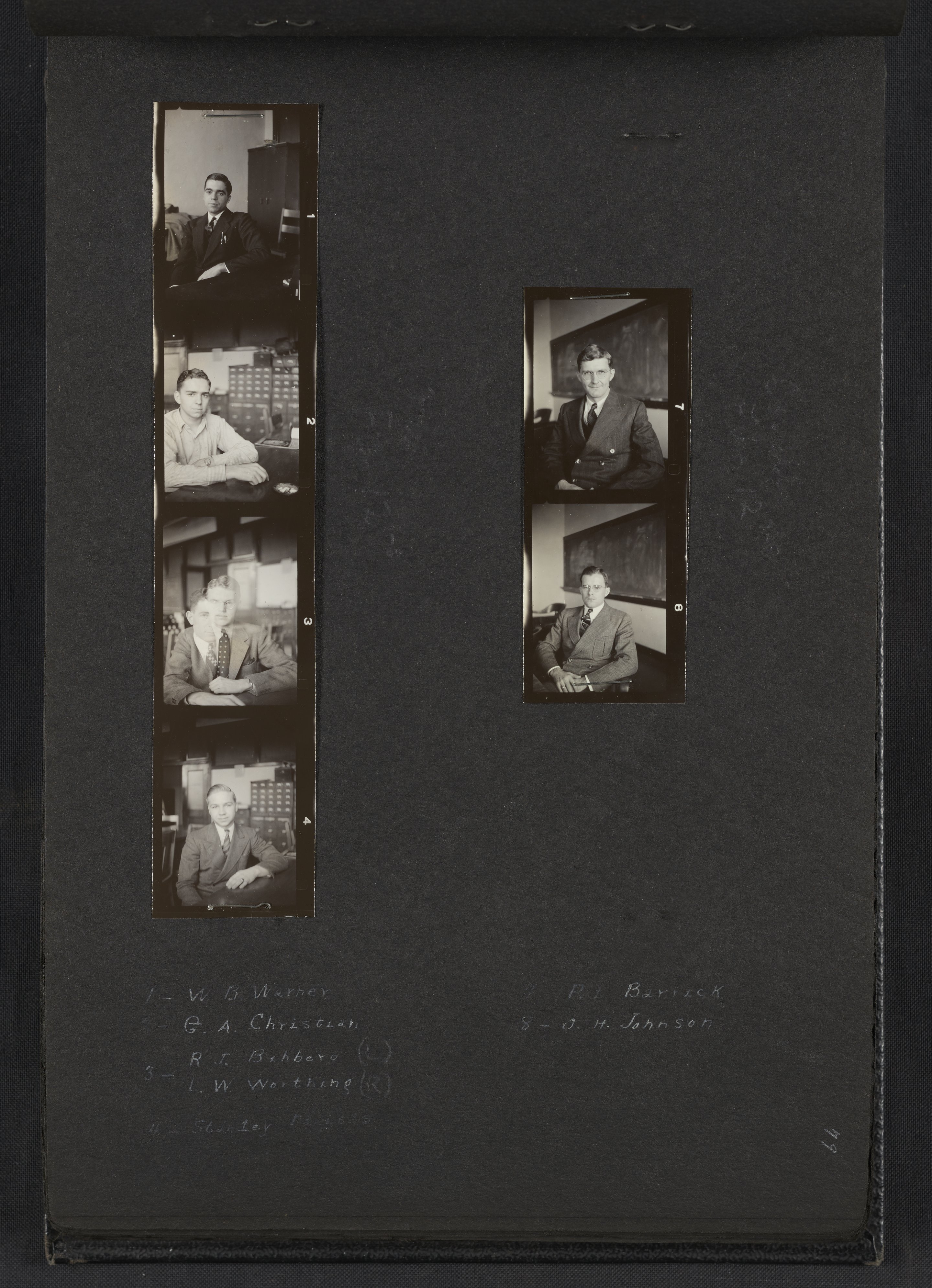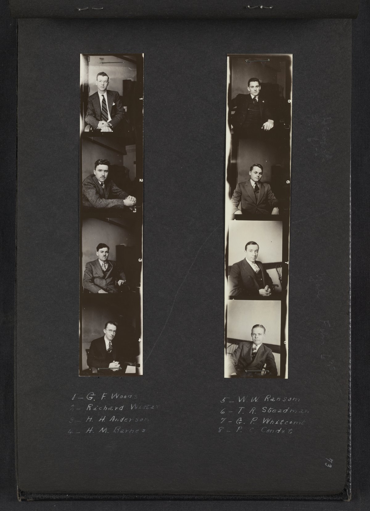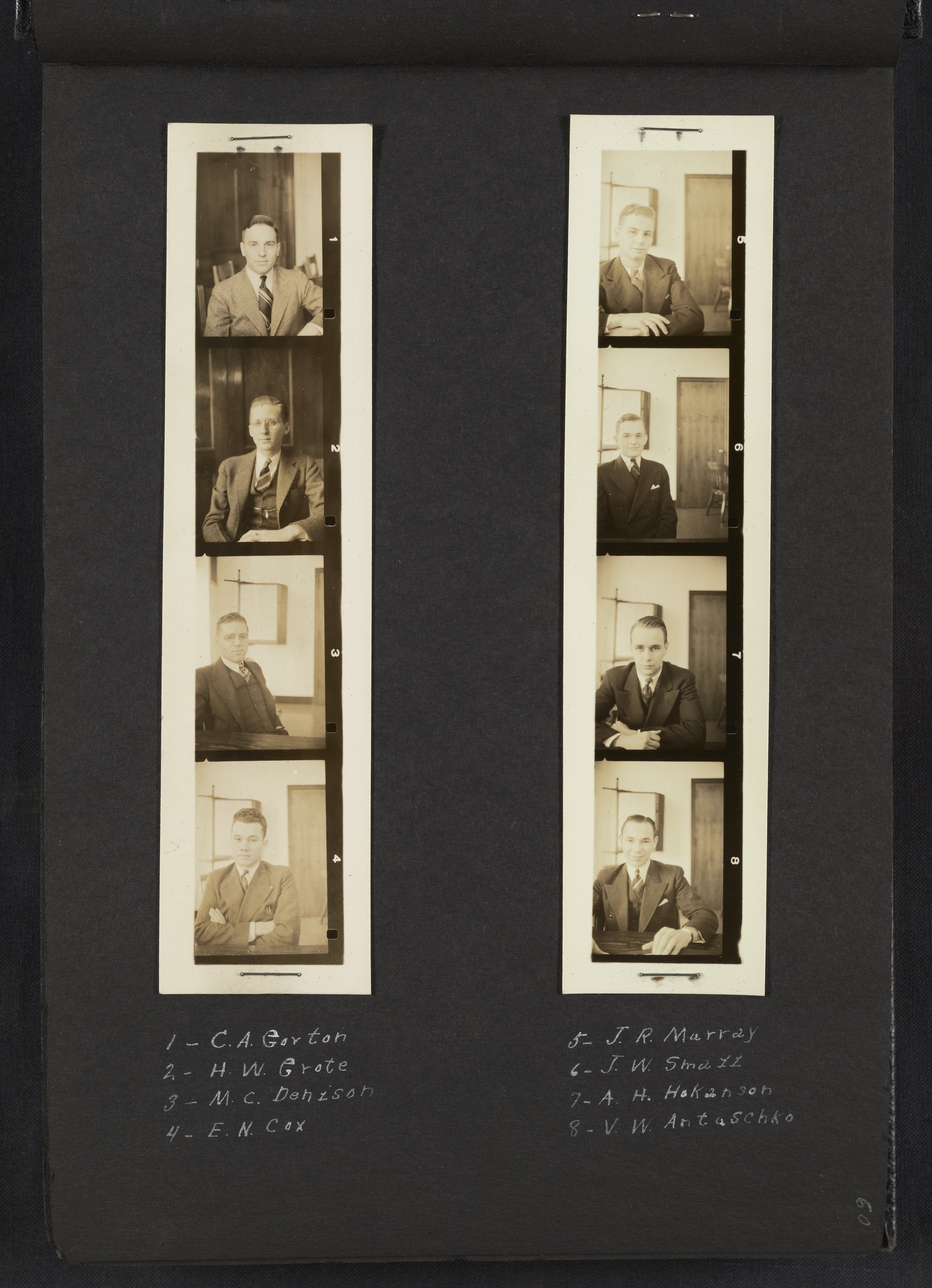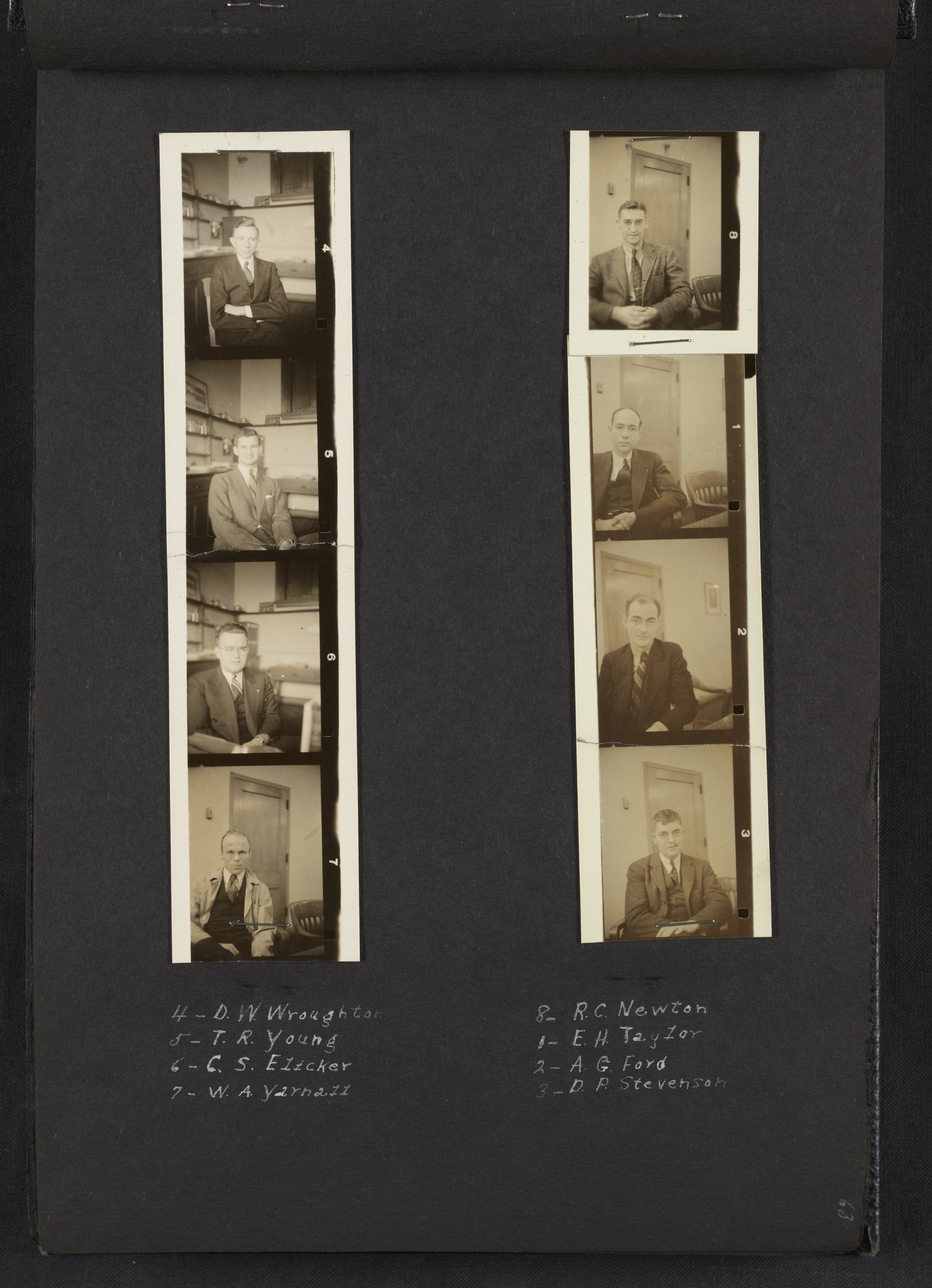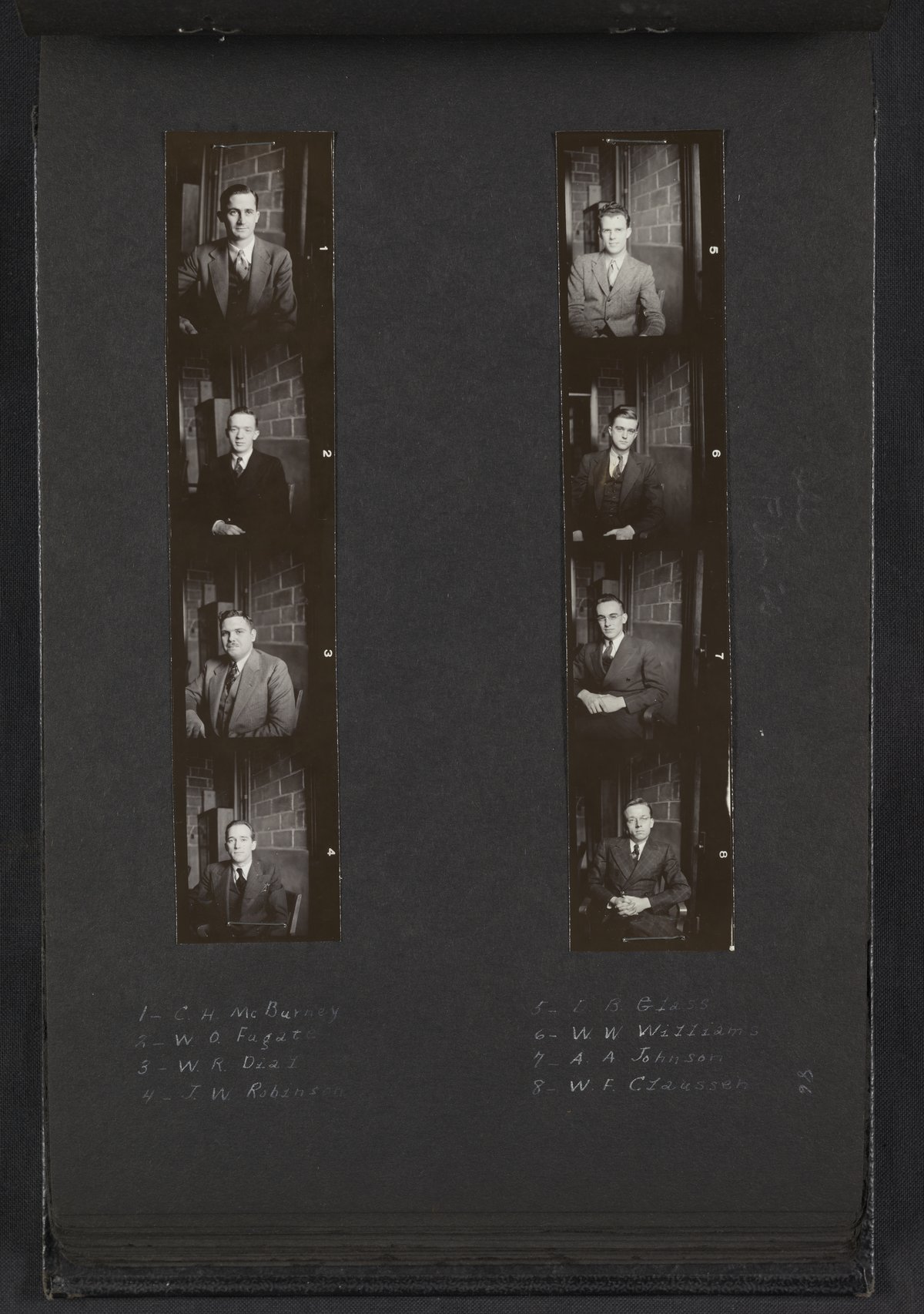 Small JPG1200 x 774px — 253 KBLarge JPG2880 x 1857px — 1.3 MBFull-sized JPG8122 x 5238px — 8.2 MBOriginal fileTIFF — 8122 x 5238px — 122 MBPhotographic album containing approximately 440 black and white portraits of new members of the American Chemical Society for the years 1938-1939. The names and institutional affiliation of each individual are inscribed on the album page. The portraits are grouped by institutional affiliation, including members from Yale, Princeton, Cornell, MIT, Ohio State University, and Purdue.