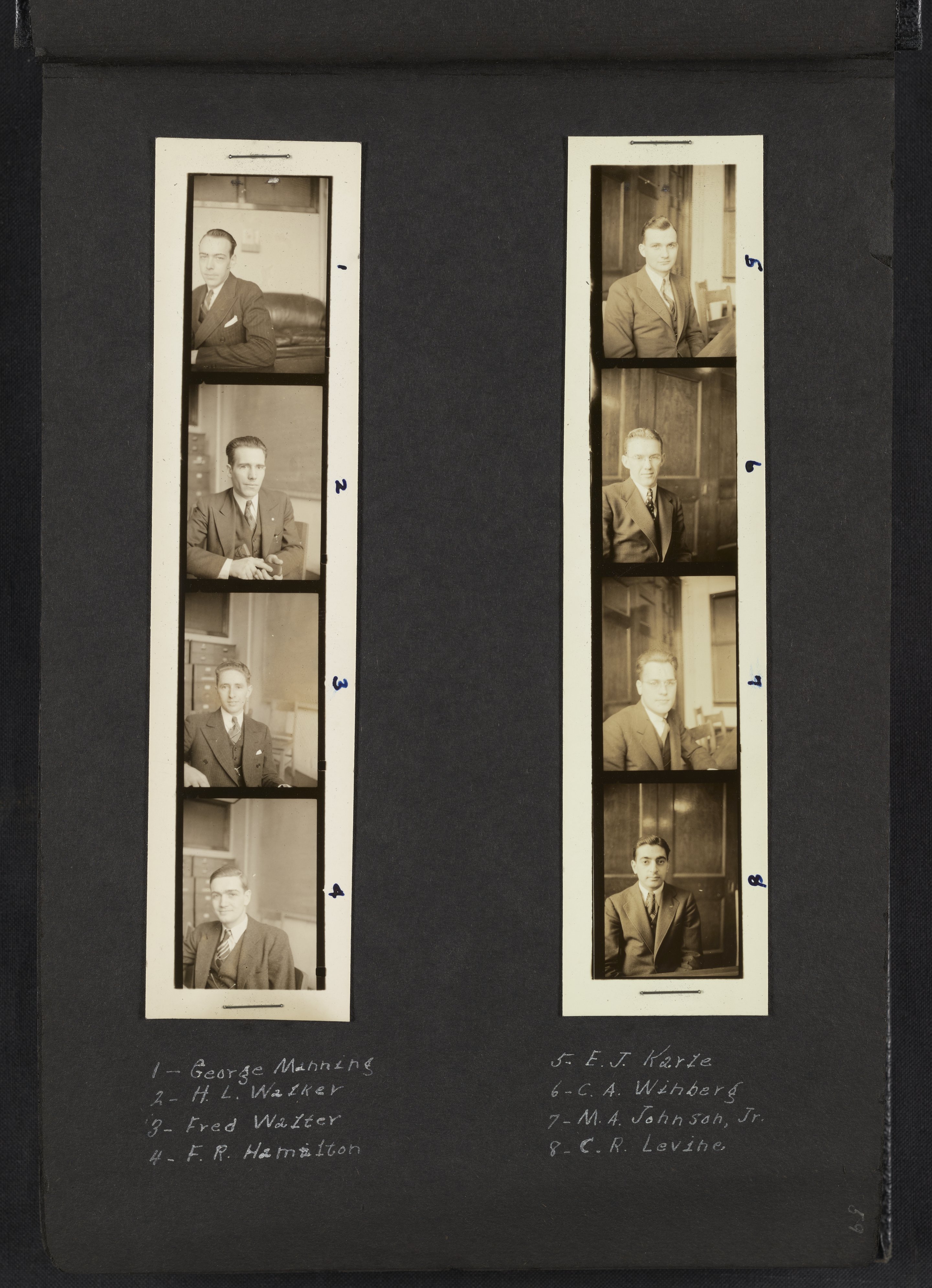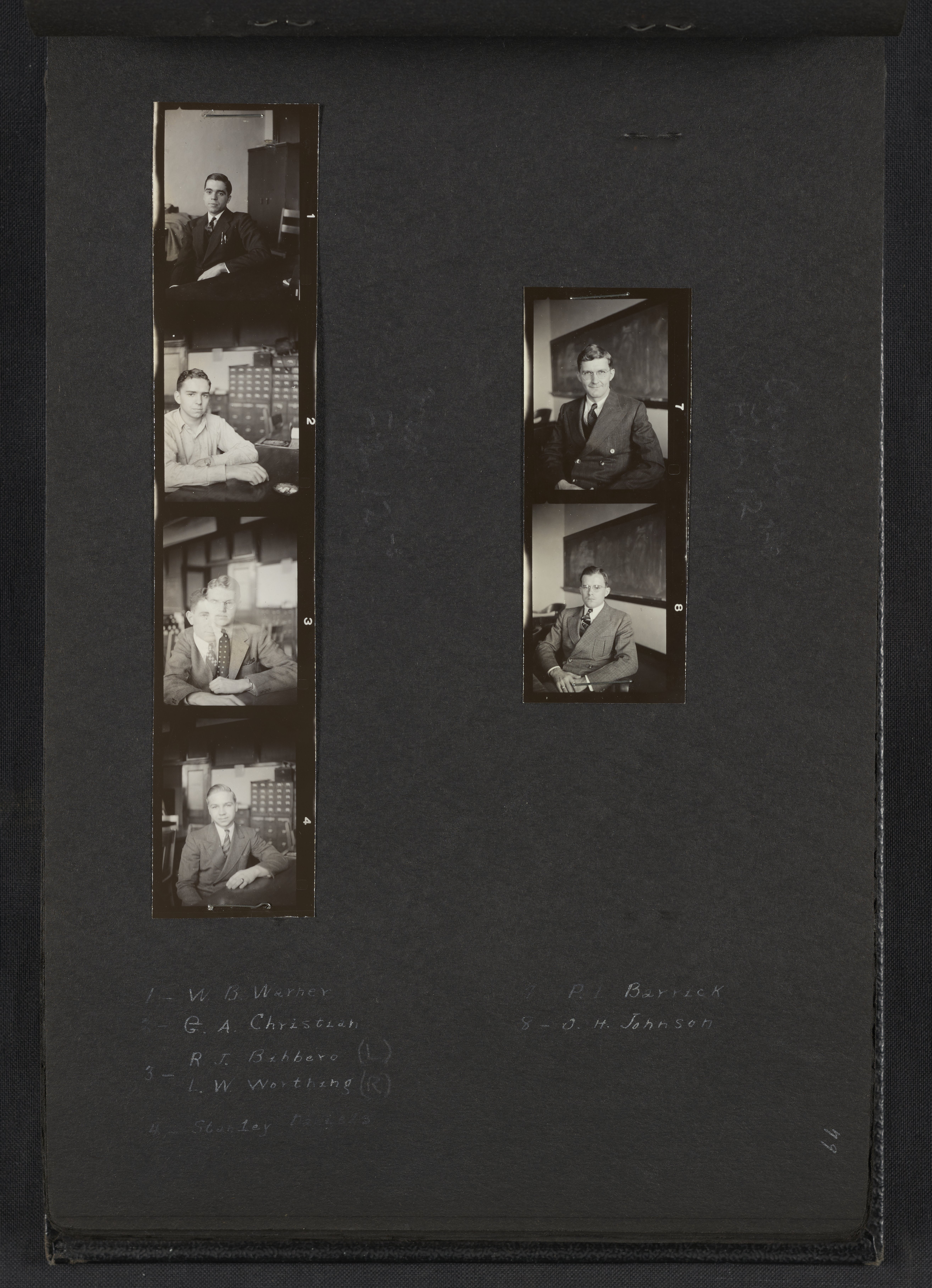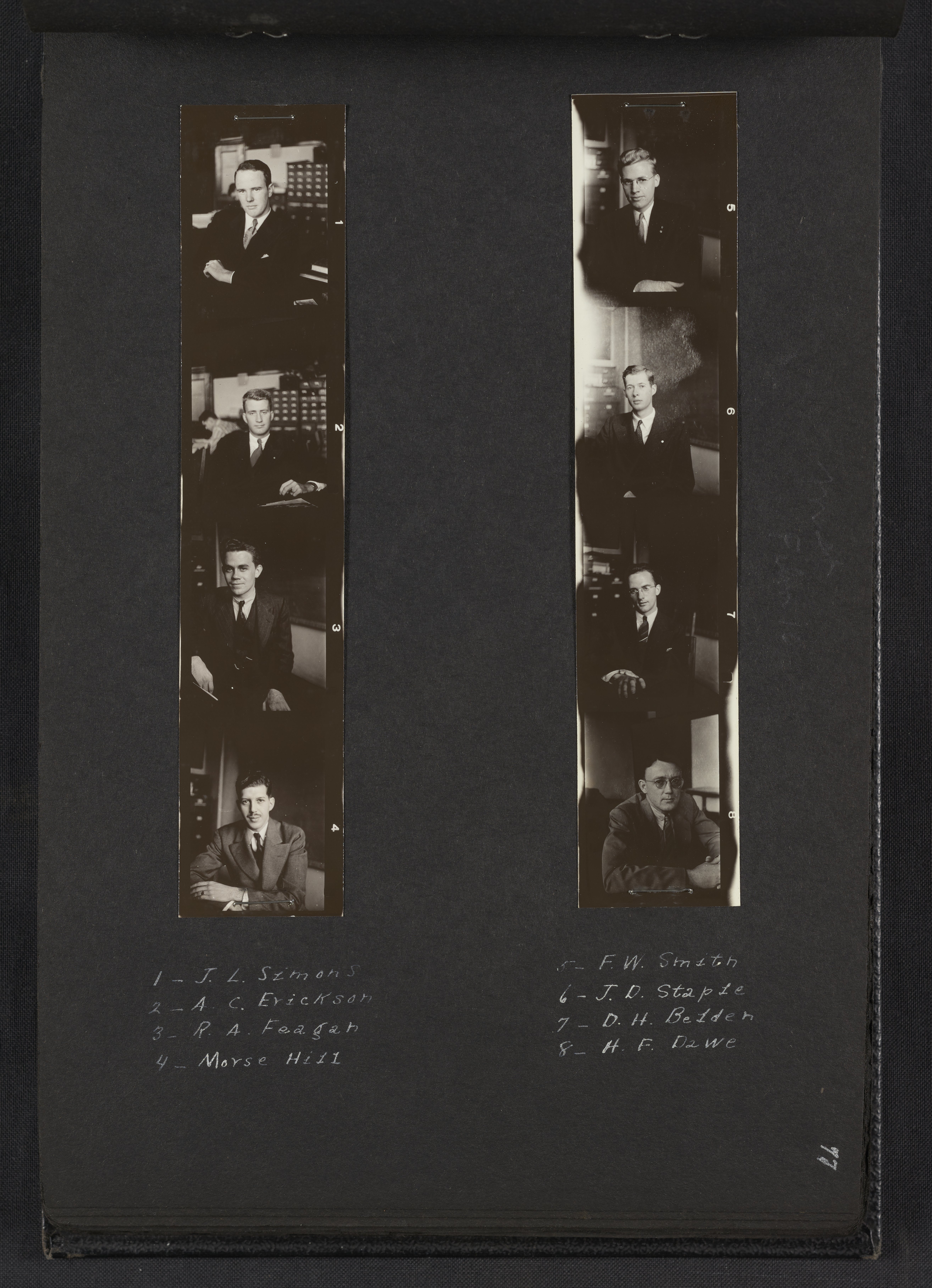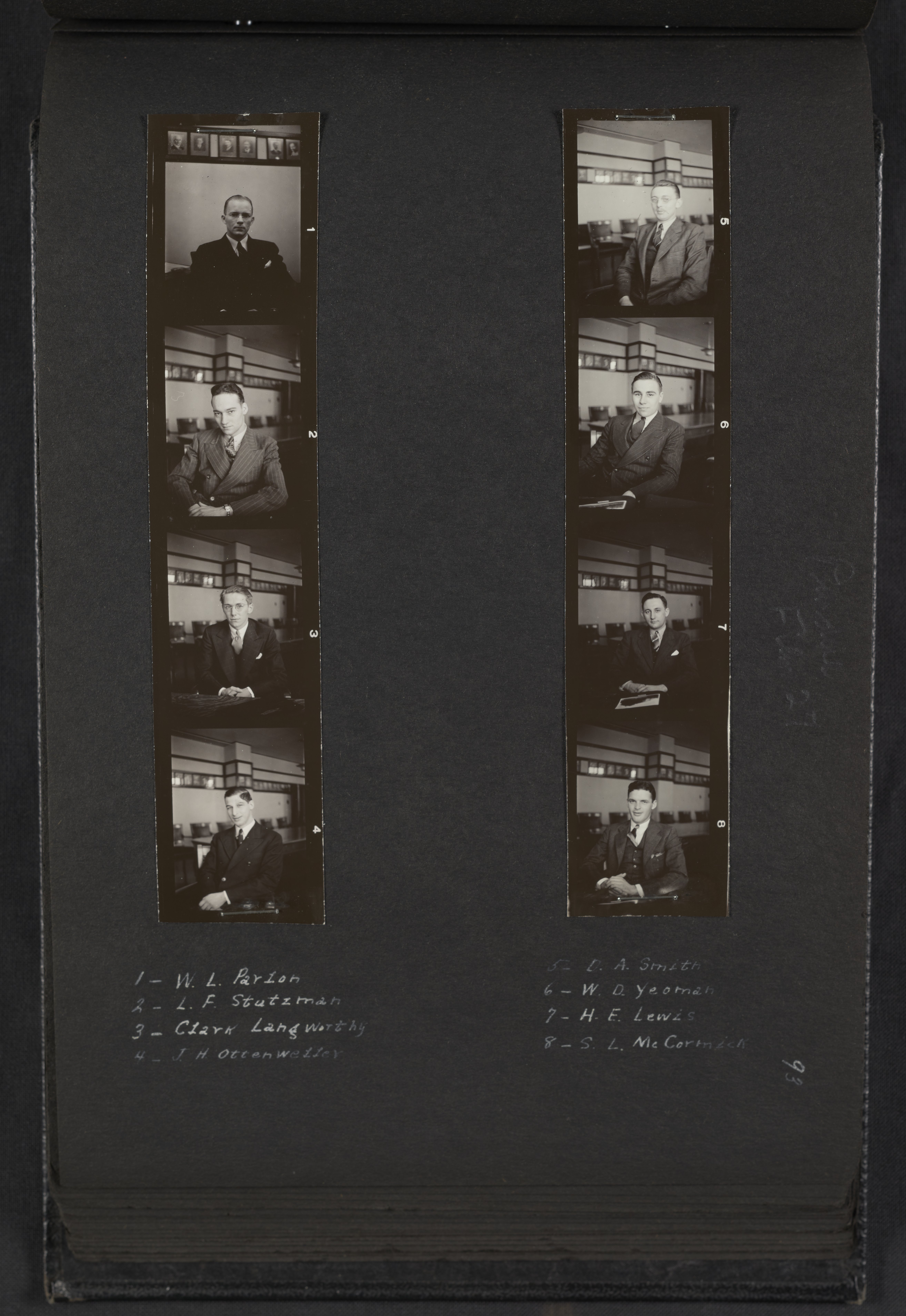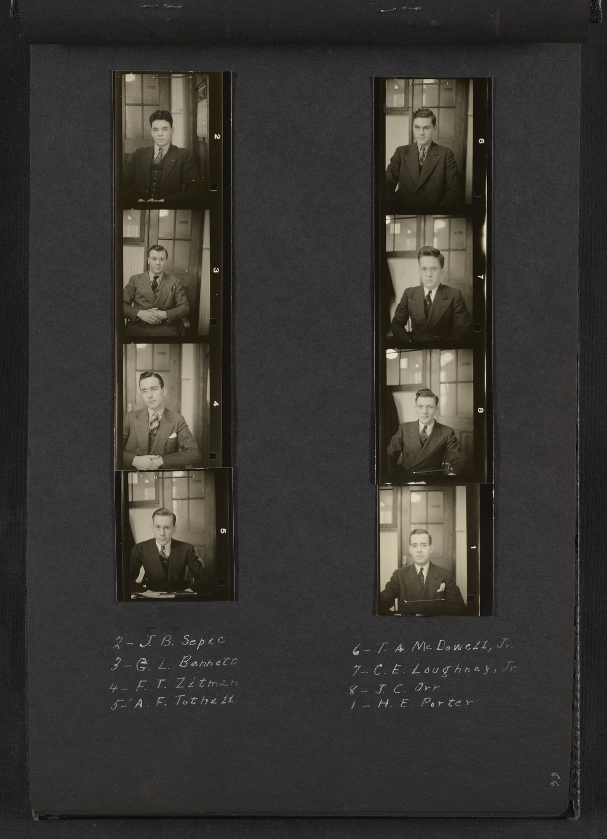 Small JPG1200 x 774px — 253 KBLarge JPG2880 x 1857px — 1.3 MBFull-sized JPG8122 x 5238px — 8.2 MBOriginal fileTIFF — 8122 x 5238px — 122 MBPhotographic album containing approximately 440 black and white portraits of new members of the American Chemical Society for the years 1938-1939. The names and institutional affiliation of each individual are inscribed on the album page. The portraits are grouped by institutional affiliation, including members from Yale, Princeton, Cornell, MIT, Ohio State University, and Purdue.