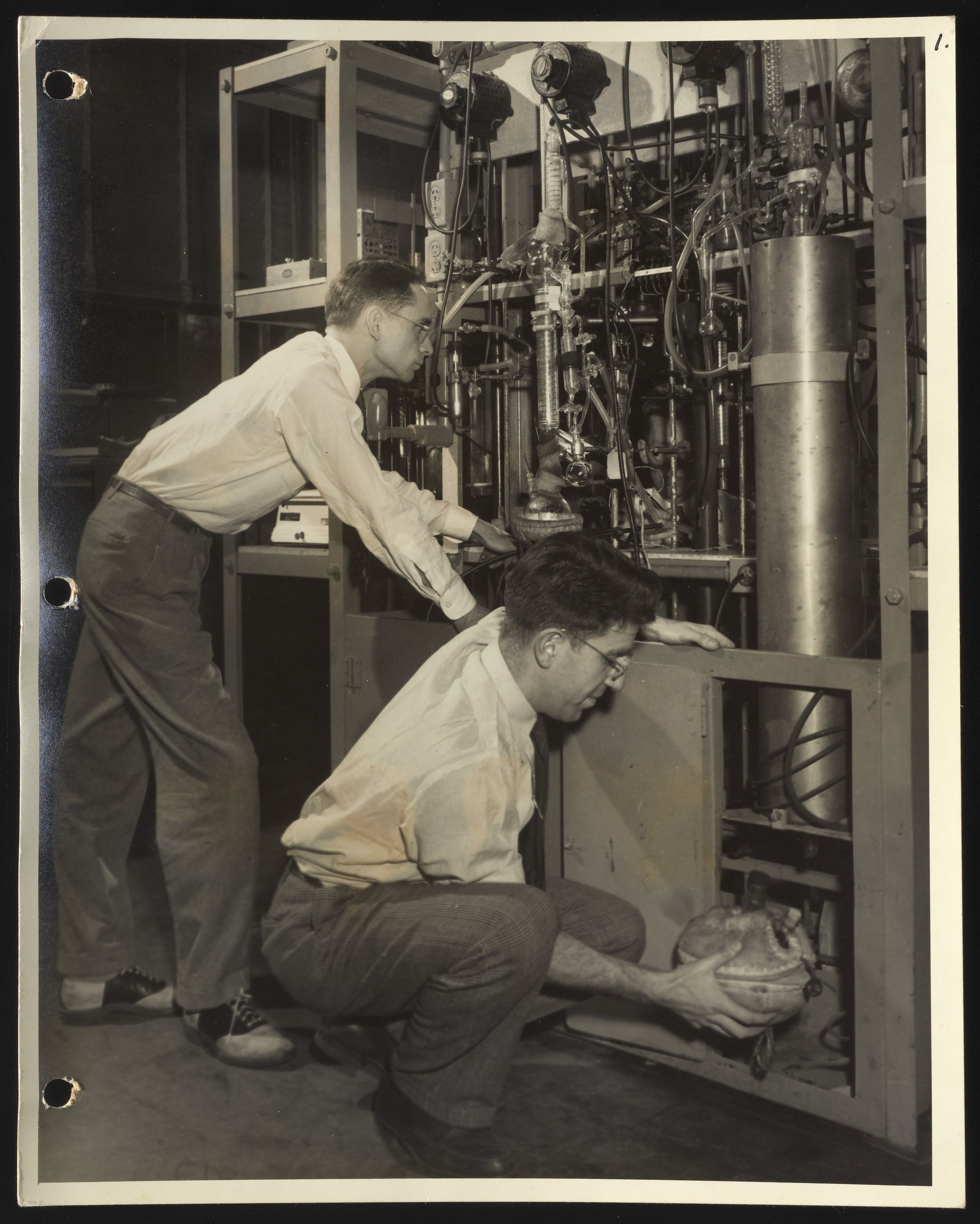General view of the distillation units located in the first floor Organic Laboratory at a DuPont facility during the early stages of synthetic fiber production and research. The individuals visible in the photograph are identified as T.J. Dickerson (left) and E.E. Magat (right).