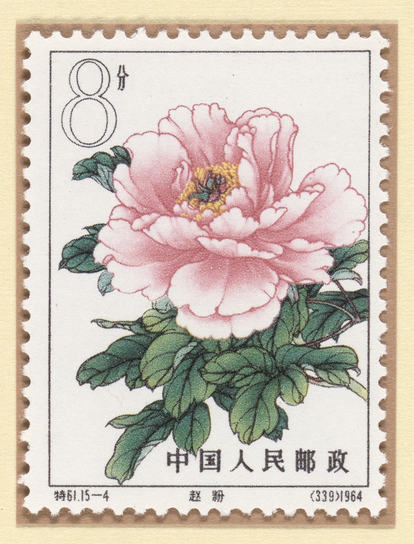 Postage stamp featuring an illustration of a variety of tree peonies called Zhao’s Pink (趙粉). This stamp is part of a stamp series titled "Tree Peonies," which was issued in 1964 by the People's Republic of China.