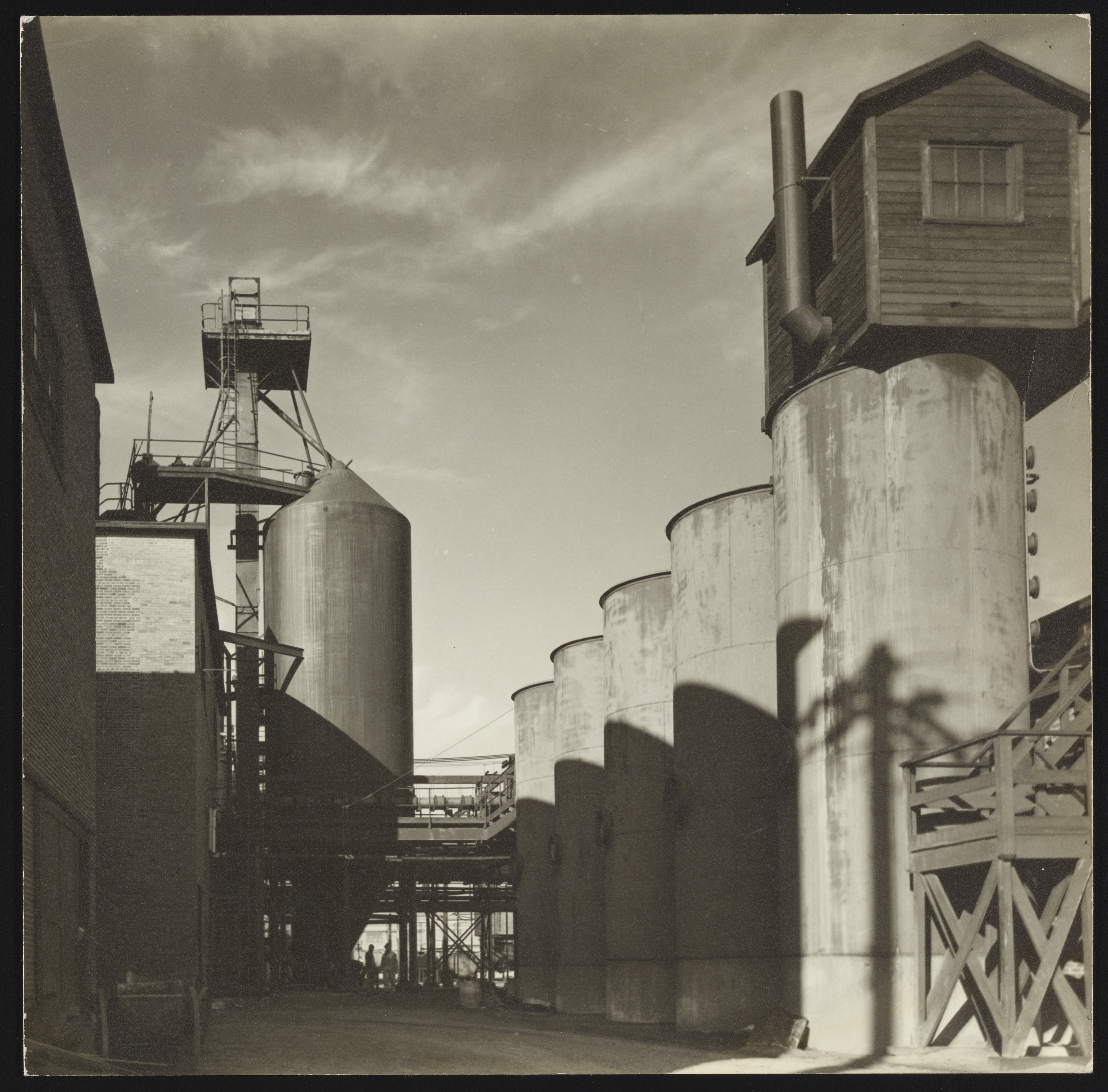 General view of a section of the exterior of the Cliffs Dow wood distillation plant located in Marquette, Michigan. Seeking a source of raw material for its new plastic, ethylcellulose, the Dow Chemical Company joined with the Cleveland-Cliffs Iron Company to form the Cliffs Dow Chemical Company in April 1935. The Cliffs Dow plant in Marquette primarily produced charcoal used in the manufacture of pig iron, as well as a range of chemical by-products including acetic acid, calcium acetate, wood alcohol, and ethyl alcohol. Notably, when the Marquette plant ceased operations in 1969, it was the last wood distillation plant in the United States.